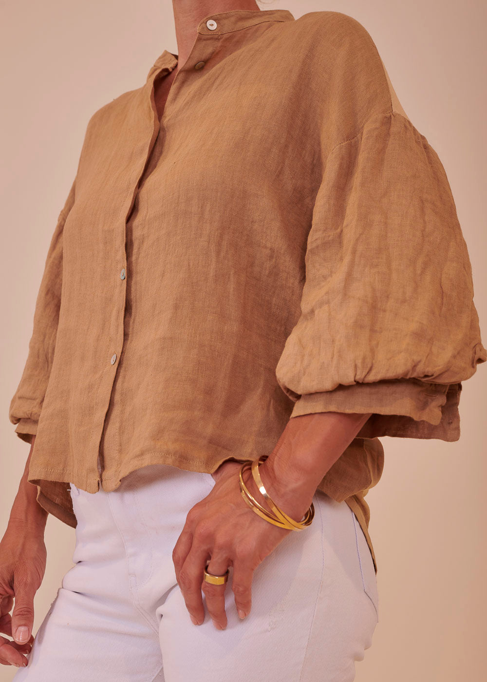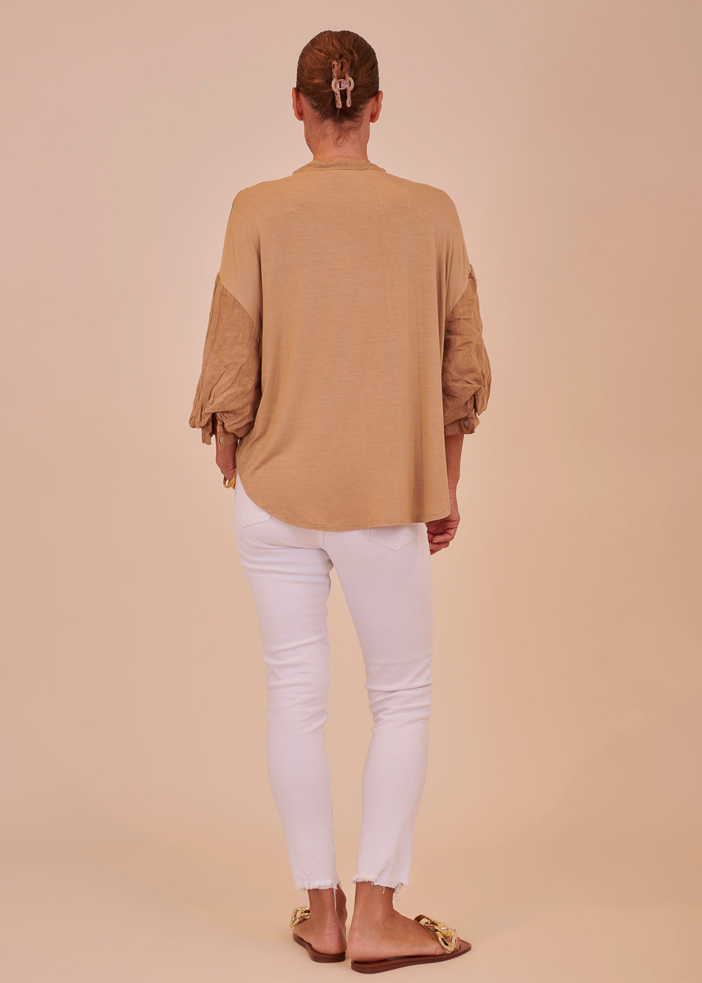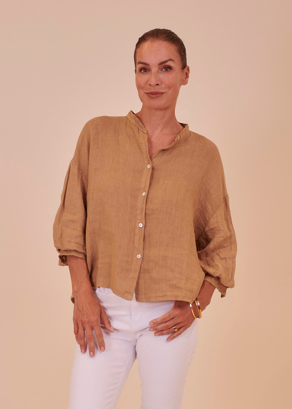 Diese Materialmix Tunika mit Leinenanteil ist einfach besonders. Durch ihren besonderen Schnitt und die Verarbeitung der zwei Unterschiedlichen Materialen sticht man einfach hervor. Die Bluse hat eine durchgehende Knopfleiste, sowie einen Stehkragen und einen 3/4 Arm. Kombiniere diese wunderbare Bluse gerne mit einer weißen Jeans, um dir einen edlen Look zu zaubern!