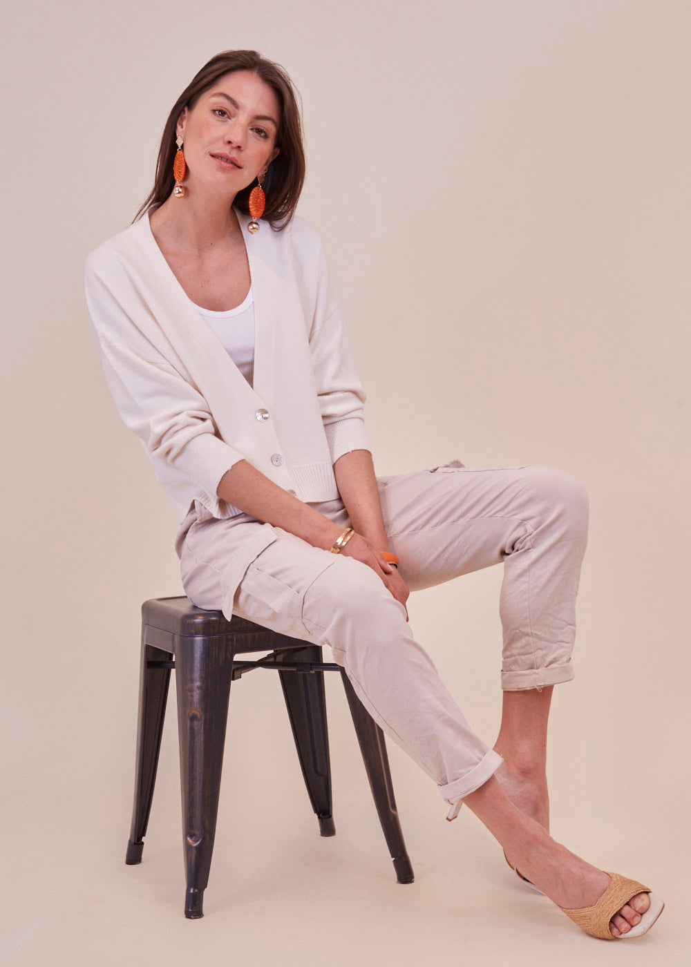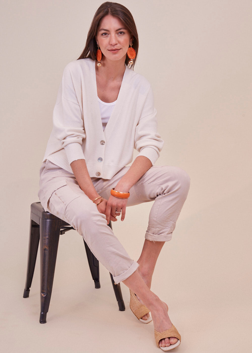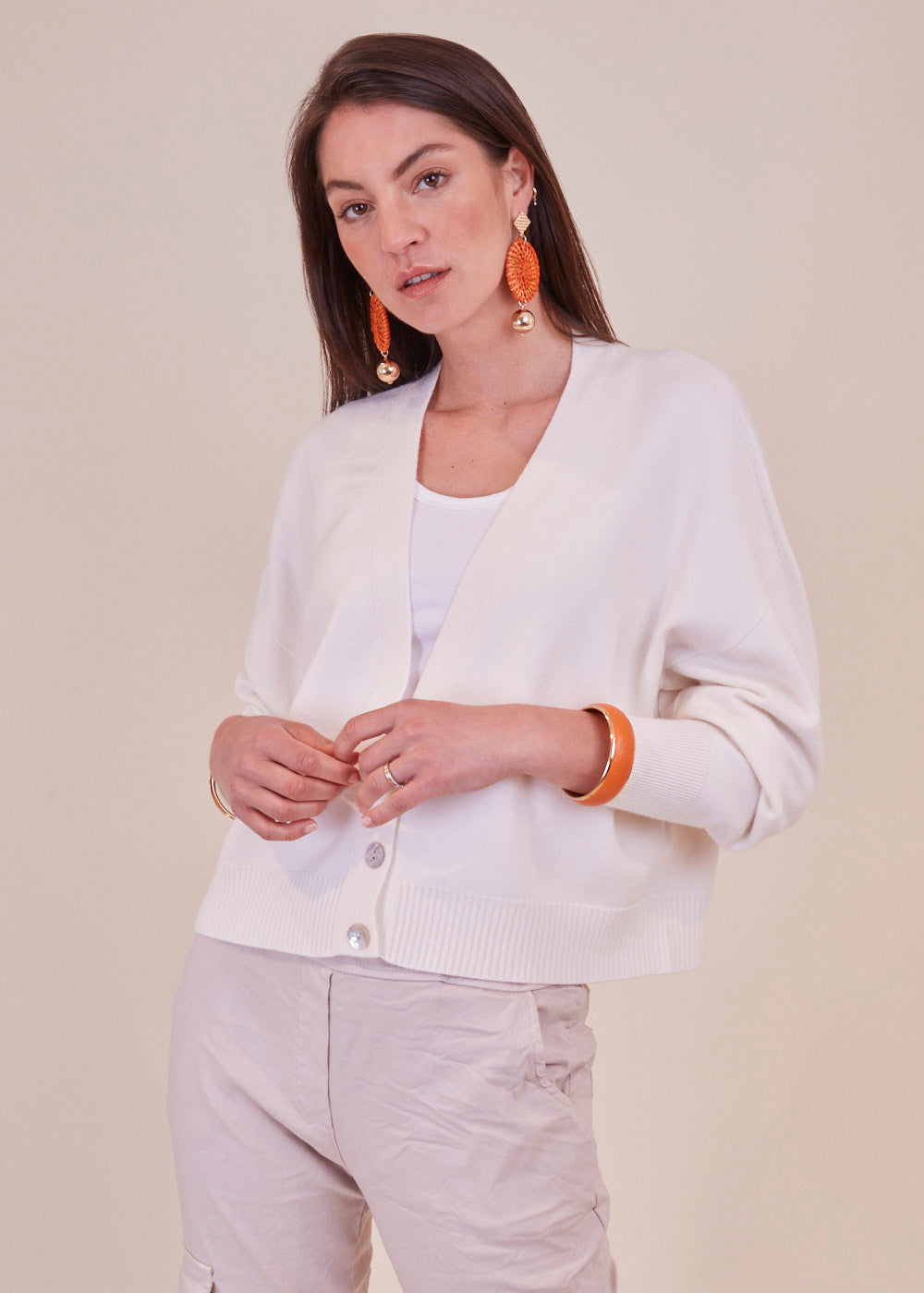 Kurz und kastenförmig geschnittene Strickjacke mit langen Armen aus unserem Bestseller Garn. Sie hat ein Rippenbündchen an den Ärmeln und am Saum. Durch die Frontknöpfe lässt sich diese Jacke wunderbar geschlossen tragen. Zum darunter tragen empfehlen wir dir unsere Basic Tops. Kuschelig weicher Tragekomfort mit absoluter Wohlfühlgarantie.