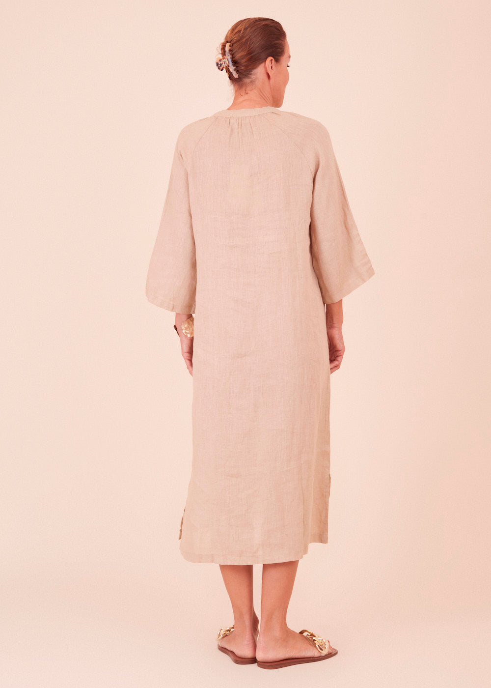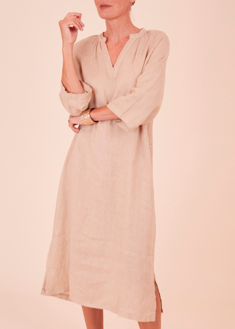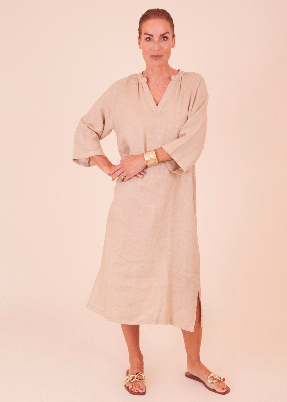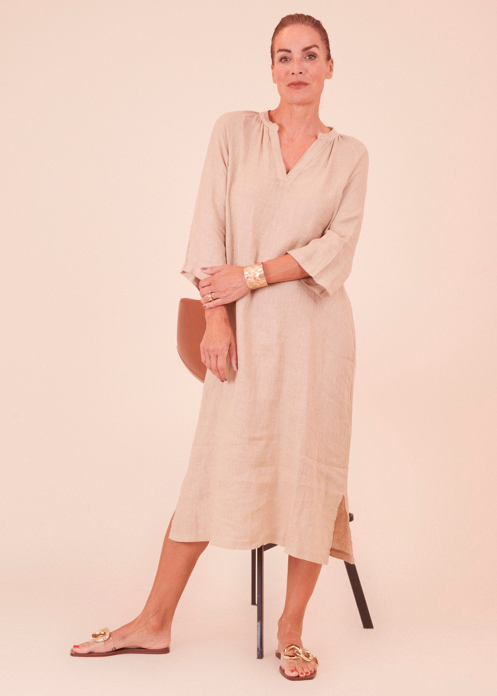 Bist du auf der Suche nach einem neuen Kleid? Mit diesem Kleid  bist du lässig angezogen. Der weite Schnitt umspielt deine Figur. Der Stehkragen gibt dem Outfit den perfekten Touch. Das kühlende Leinenmaterial ist auch bei extremer Hitze angenehm auf deiner Haut!