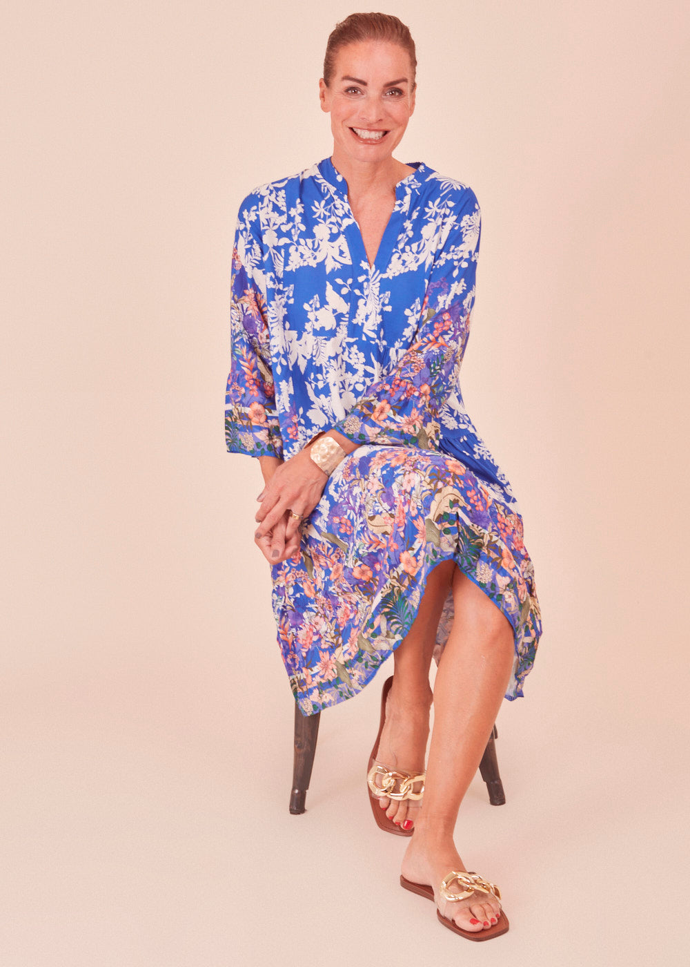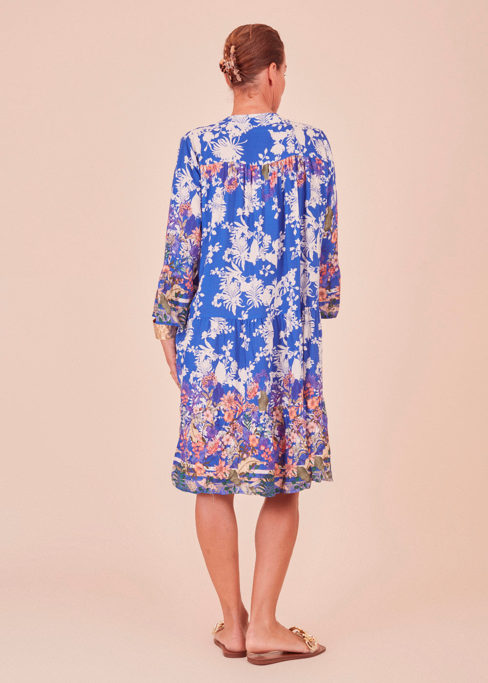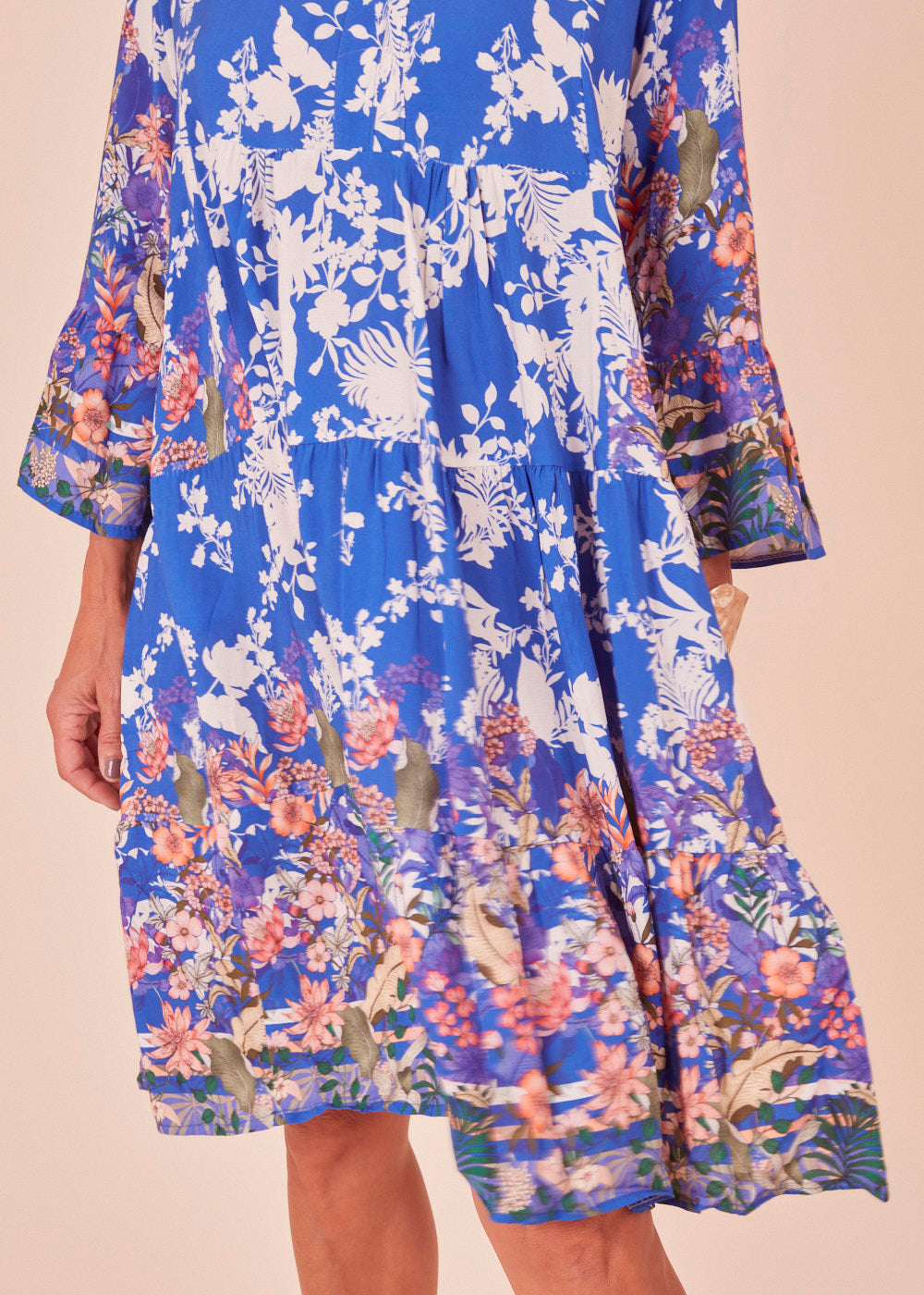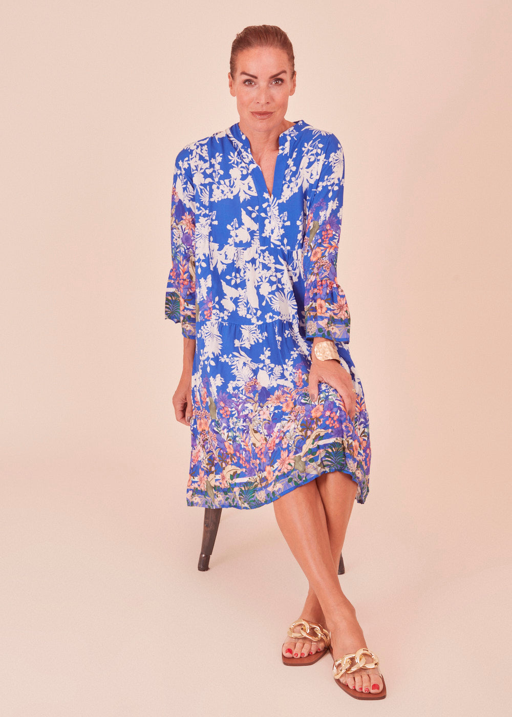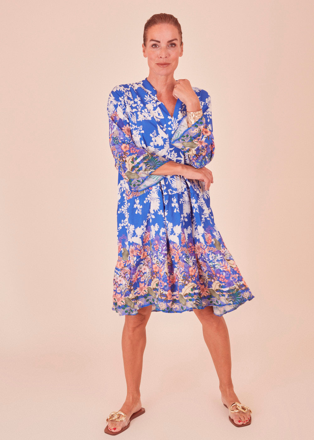 Dieses Kleid erstrahlt in frischen Print. Der Volant-Rock sorgt für ein luftig-leichtes Tragegefühl. Das Kleid besitzt einen V-Ausschnitt und einen angedeuteten Kragen mit einer Knopfleiste. Ein absoluter Hingucker.