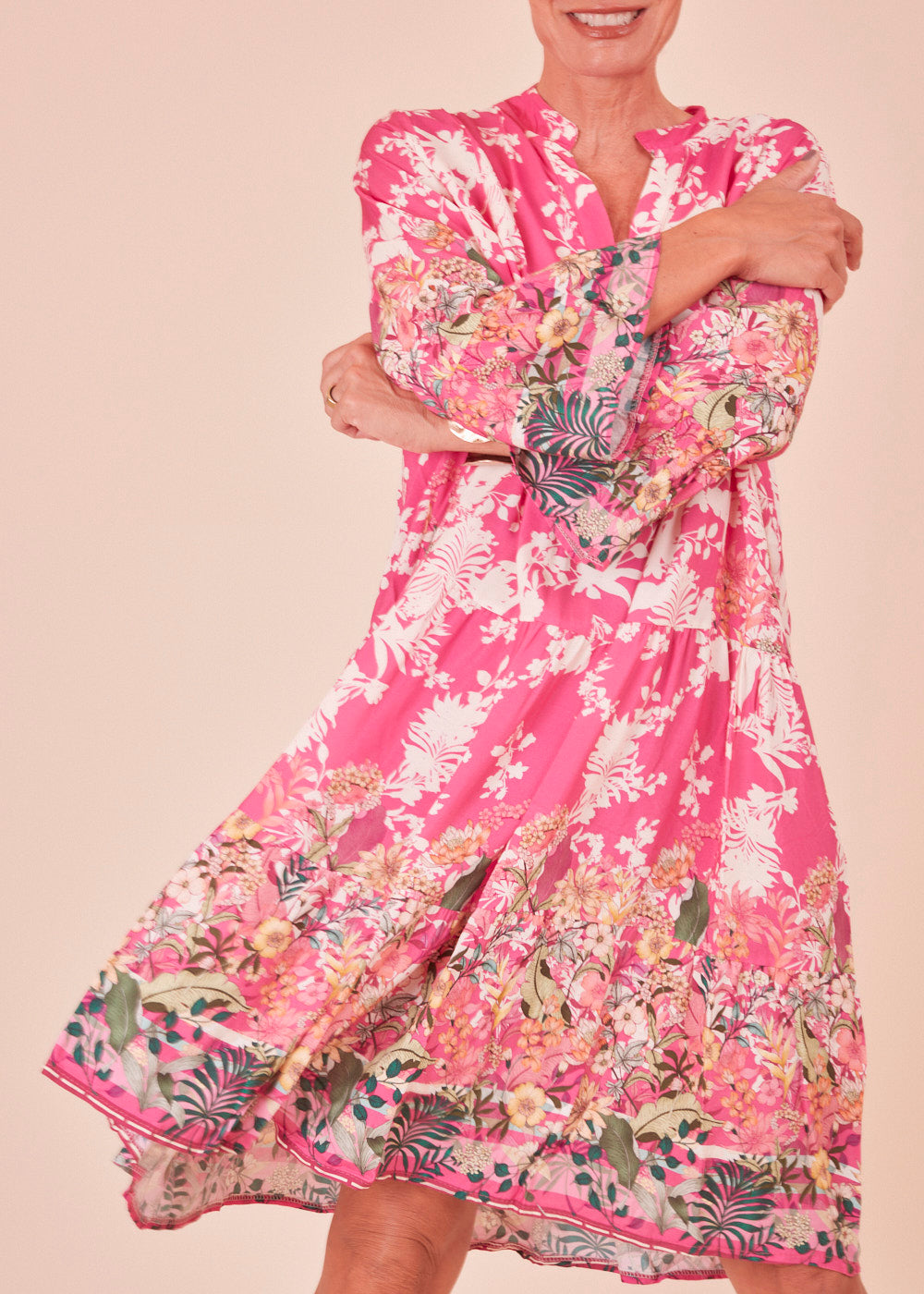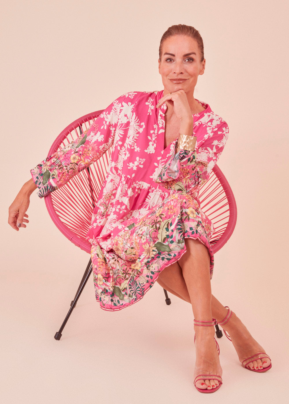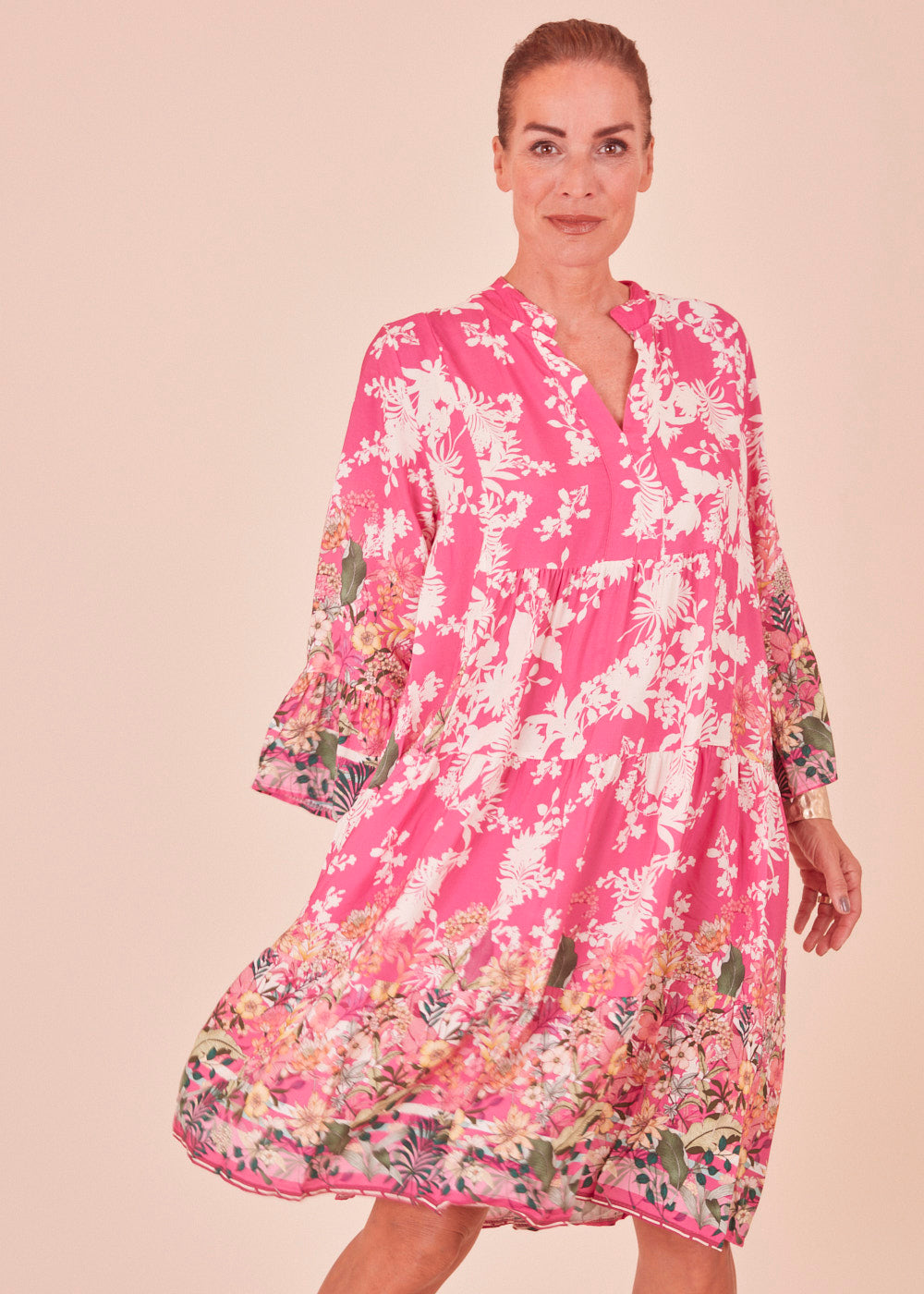 Dieses Kleid erstrahlt in frischen Print. Der Volant-Rock sorgt für ein luftig-leichtes Tragegefühl. Das Kleid besitzt einen V-Ausschnitt und einen angedeuteten Kragen mit einer Knopfleiste. Ein absoluter Hingucker.