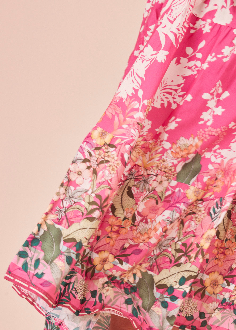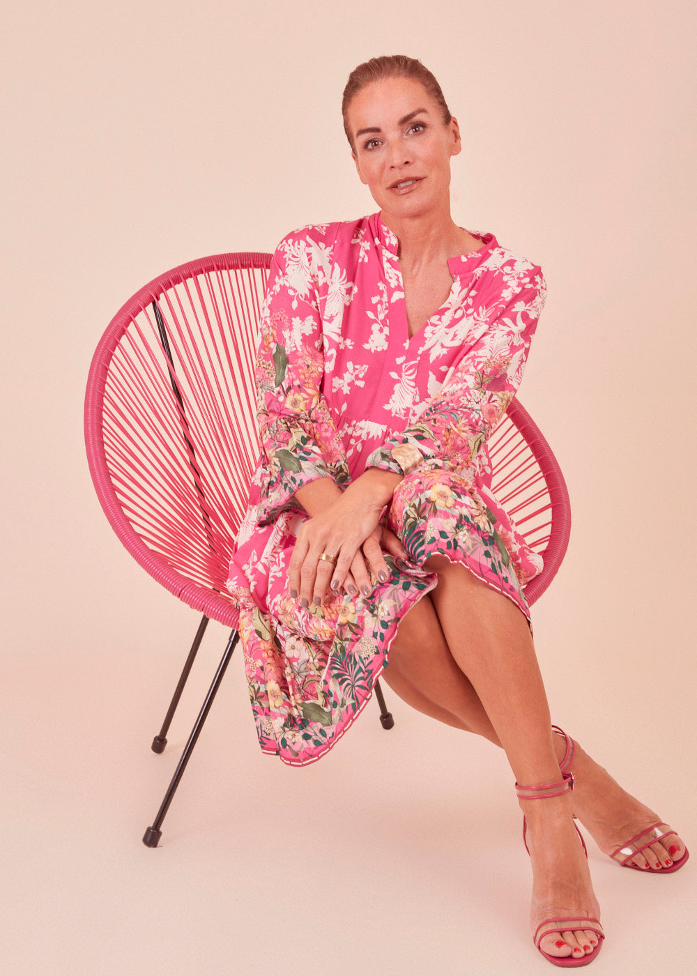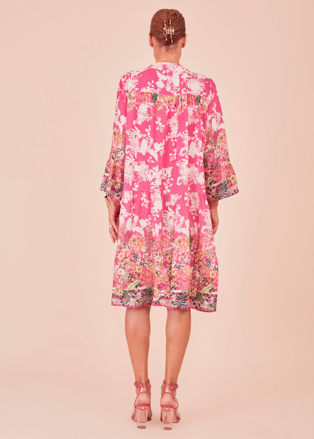 Dieses Kleid erstrahlt in frischen Print. Der Volant-Rock sorgt für ein luftig-leichtes Tragegefühl. Das Kleid besitzt einen V-Ausschnitt und einen angedeuteten Kragen mit einer Knopfleiste. Ein absoluter Hingucker.