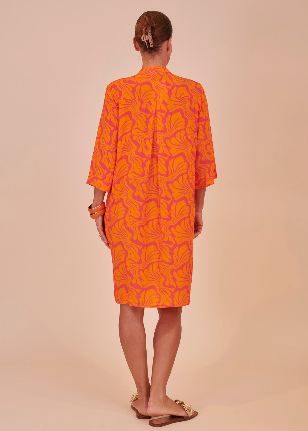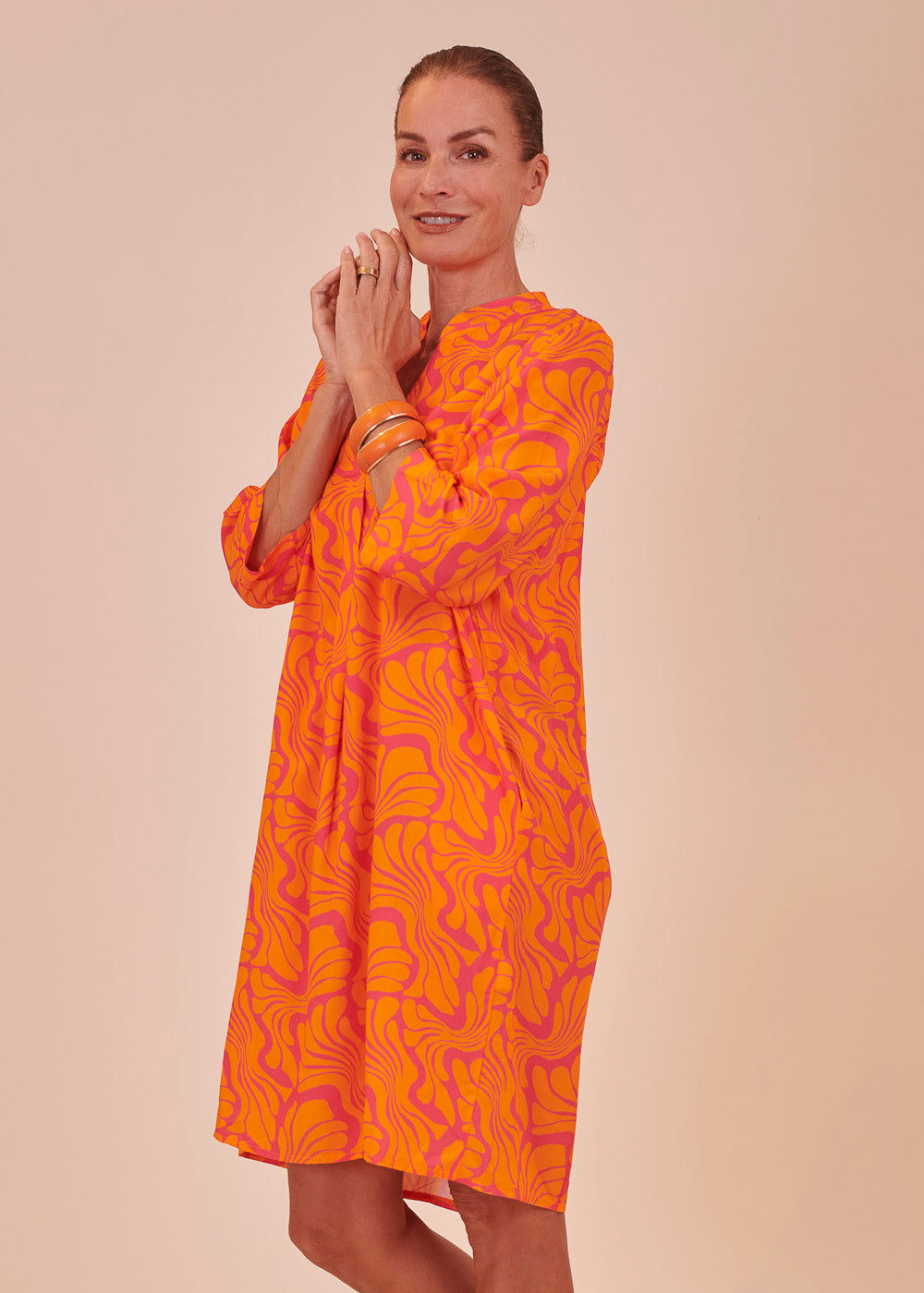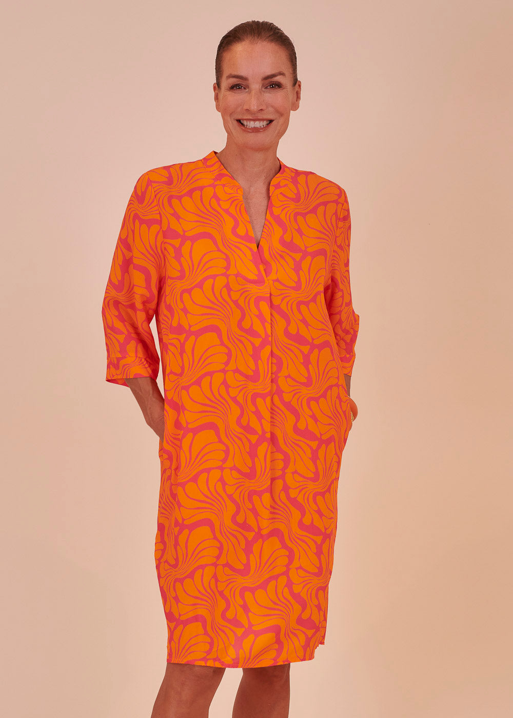 Ein Traum in Orange! Dieses sommerliche Kleid erstrahlt in frischen neuen Trendfarben und einem All-Over-Print. Das Kleid besitzt einen Stehkragen, sowie 3/4 lange Ärmel. Der fließende Schnitt sorgt für ein luftig-leichtes Tragegefühl.