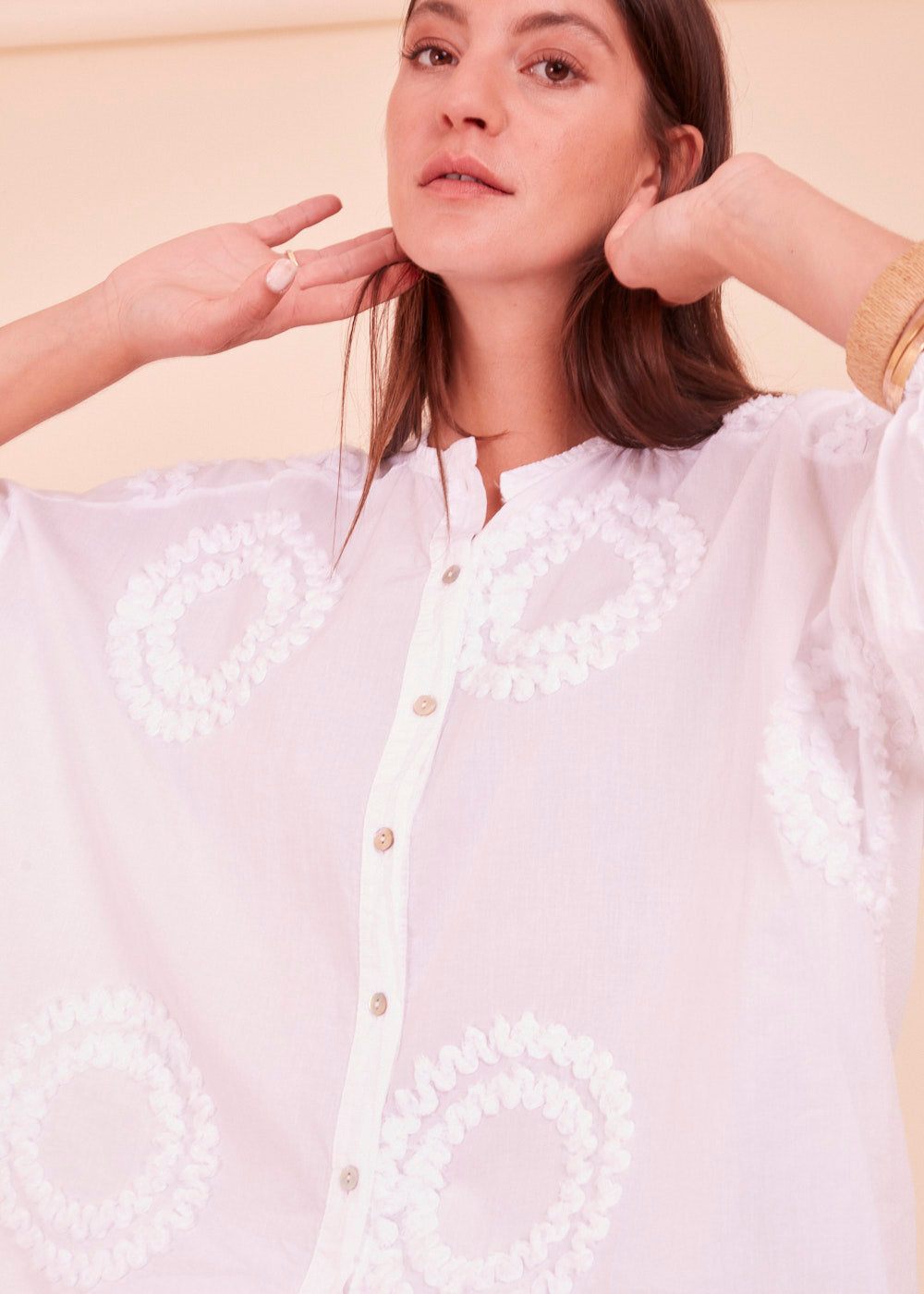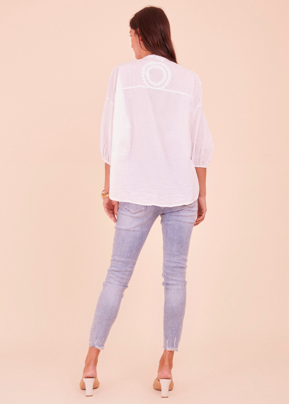 Entdecken Sie unsere wunderschöne bestickte Bluse - eine bezaubernde Verbindung von zeitloser Eleganz und handwerklicher Finesse. Diese Bluse ist eine Hommage an die Kunst der Stickerei und verkörpert raffinierten Stil, der jeden Look aufwertet. Unsere bestickte Bluse besteht aus hochwertiger, leichter Baumwolle, die ein angenehmes Tragegefühl und eine luftige Leichtigkeit bietet. Das zarte Gewebe schmiegt sich sanft an die Haut und sorgt dafür, dass Sie sich den ganzen Tag über wohl und frei fühlen.