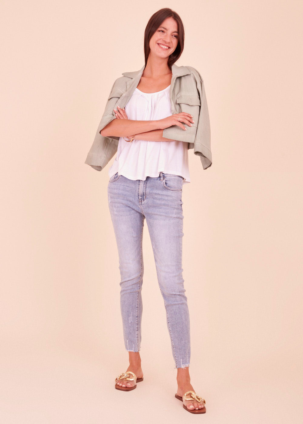 Erfülle dir dein Herz mit bezaubernder Eleganz – unser Spaghetti Top mit Raffung. Ein Kleidungsstück, das nicht nur den Körper umschmeichelt, sondern auch die Seele berührt. Die kunstvoll platzierten Raffungen verleihen deinem Outfit eine subtile Anmut, die alle Blicke auf sich zieht. Lasse das Spaghetti Top mit Raffung dein Herz erobern und dein Outfit vervollständigen.