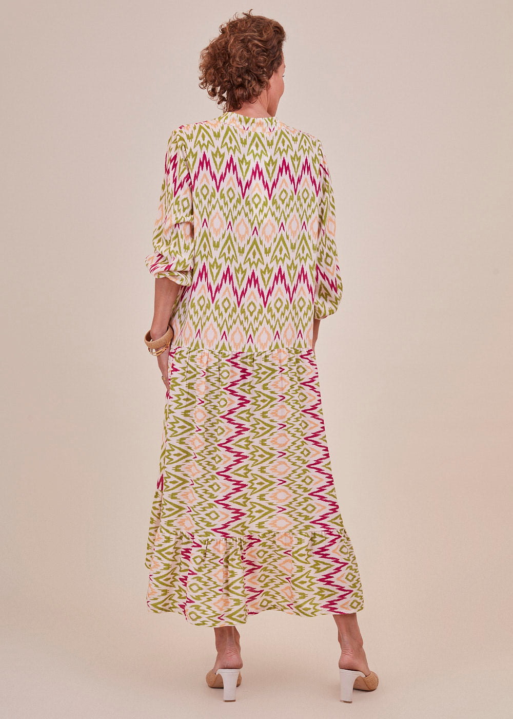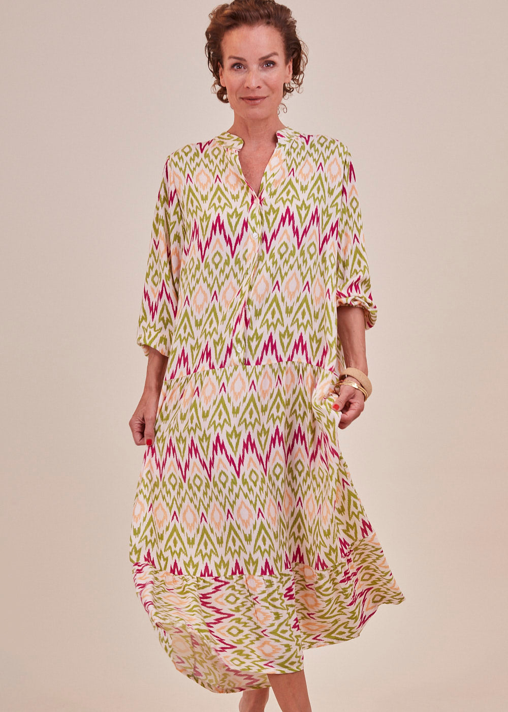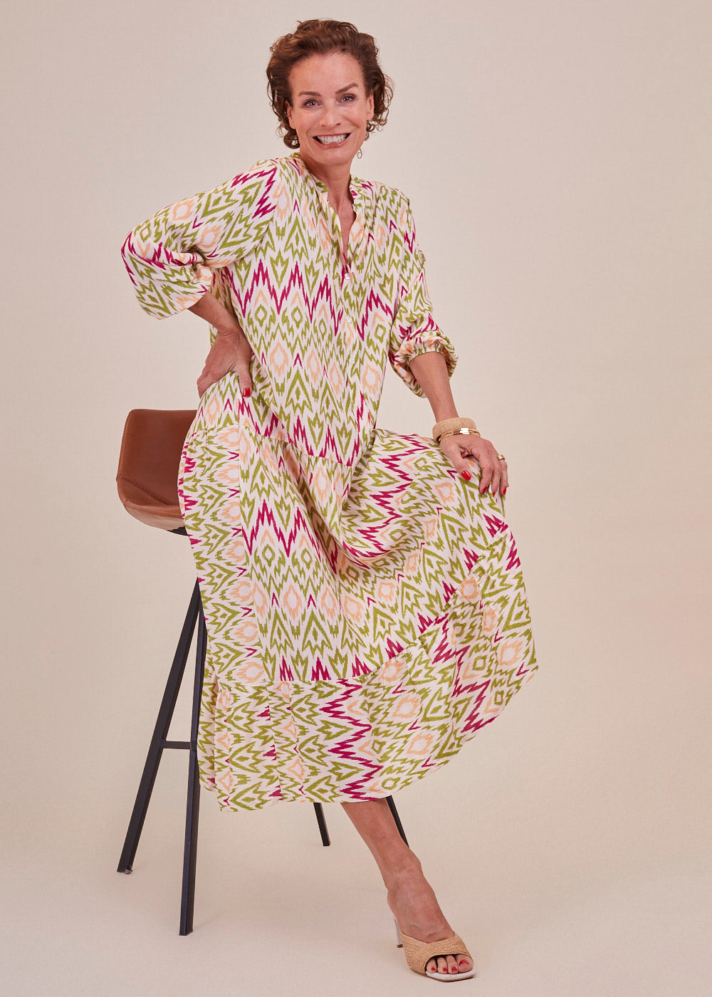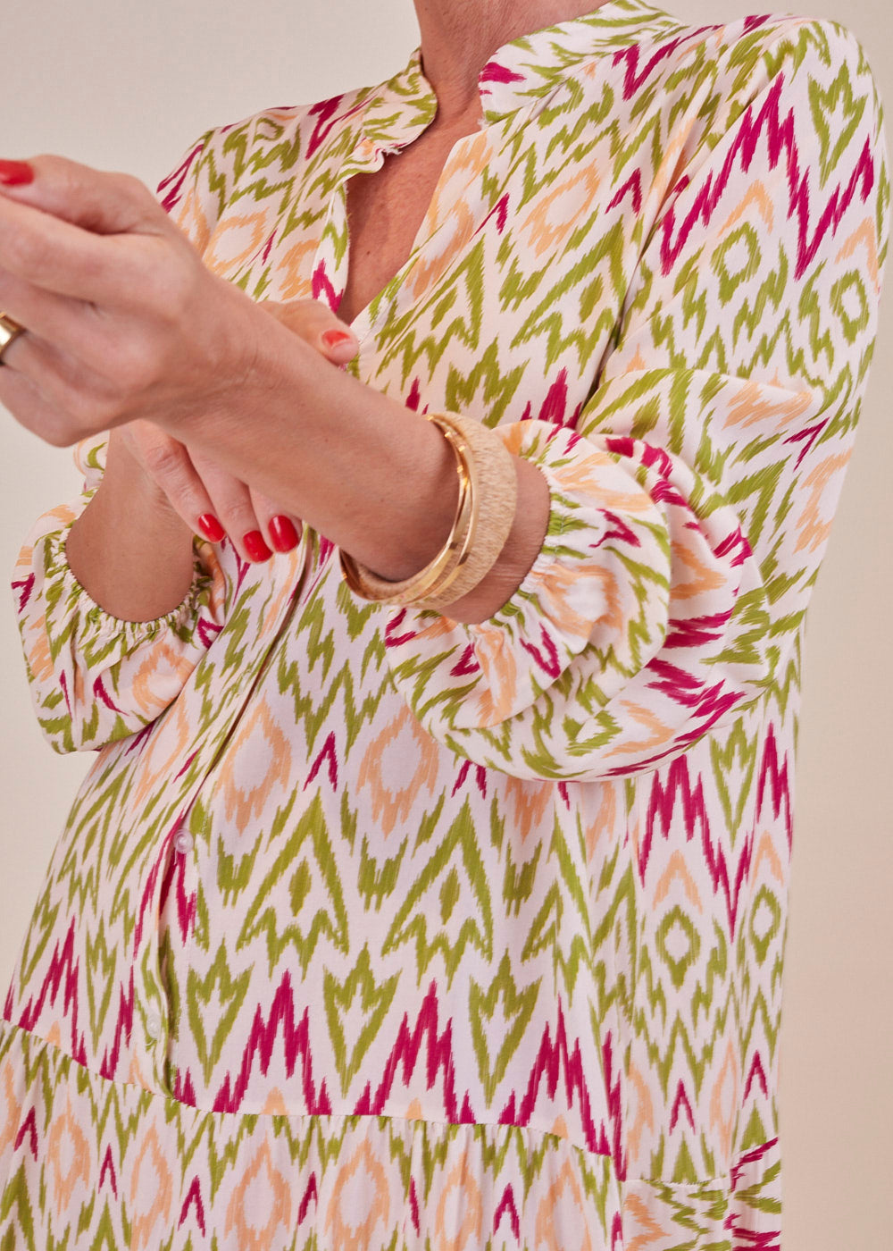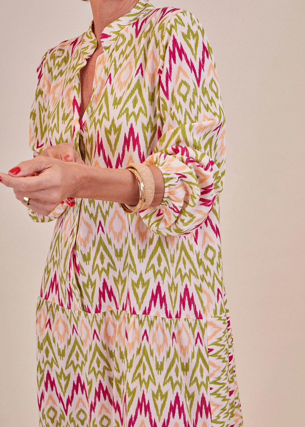Maxi-Kleid mit halber Knopfleiste im All-Over-Print. Das Kleid hat einen Stehkragen und lange Ärmel, die je nach Bedarf mit einem Gummizug hochgeshoppt werden können.