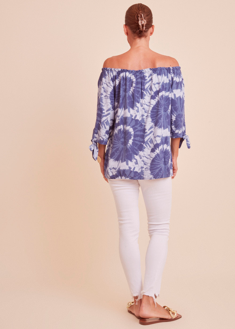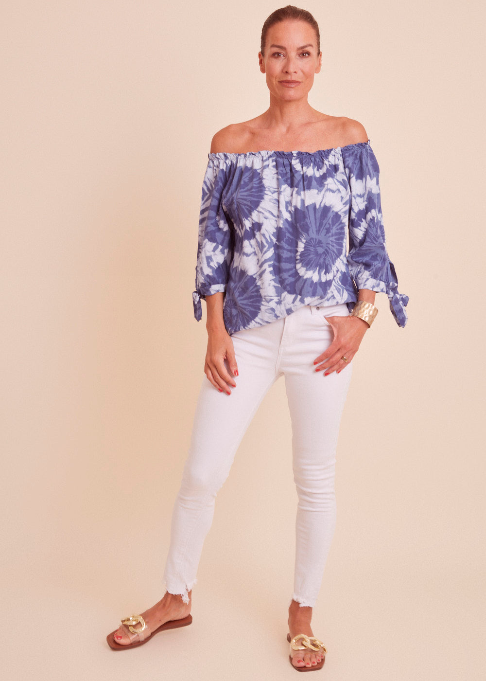 Leichte Carmenbluse in einem wunderschönen blau Ton mit besonderem Print. Die Bluse hat einen Rundhals-Ausschnitt mit Gummizug, der variable auch mit entblößten Schultern getragen werden kann. Die 3/4- Ärmel sind mit einer Schleife versehen. Einfach wunderschön!