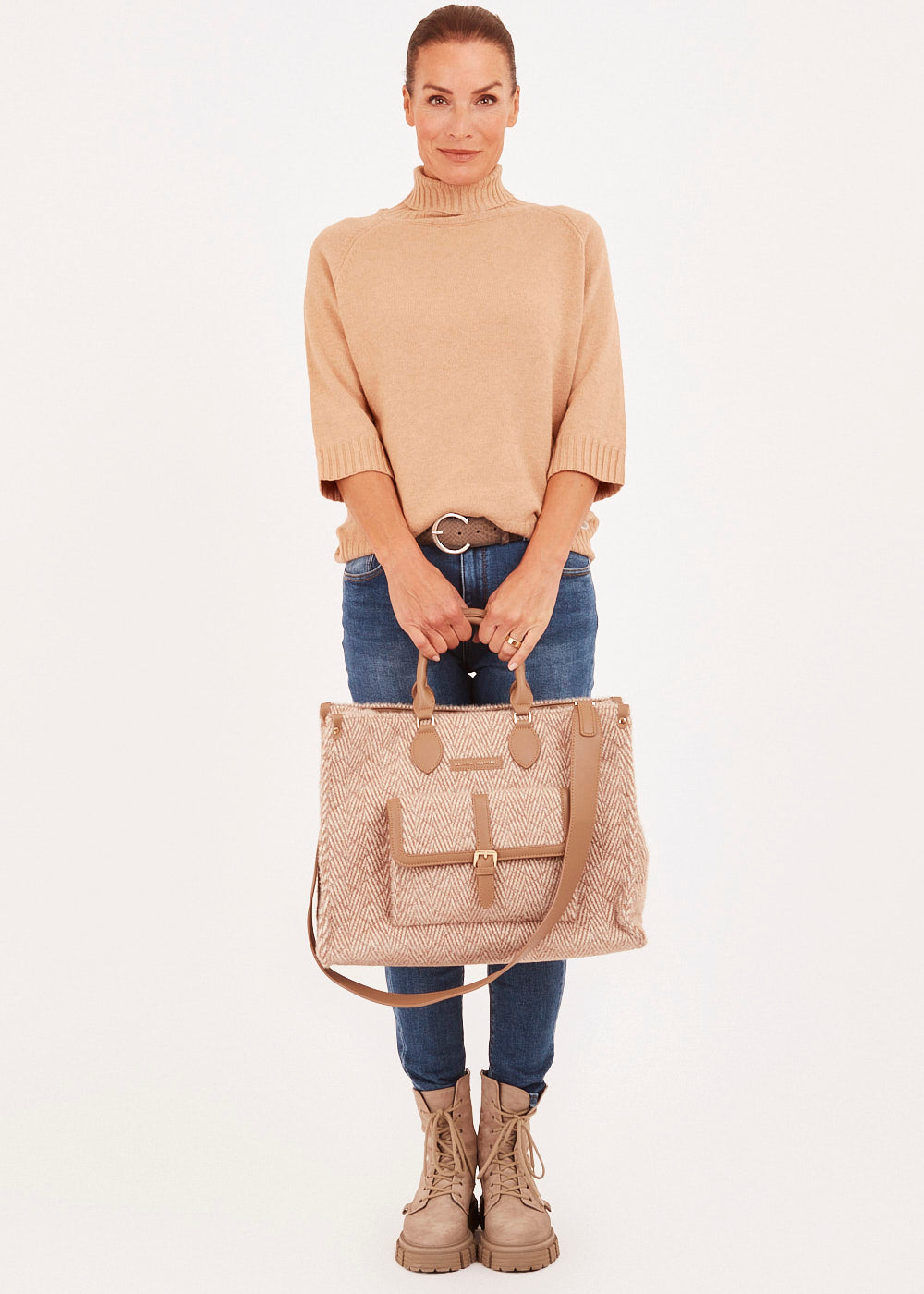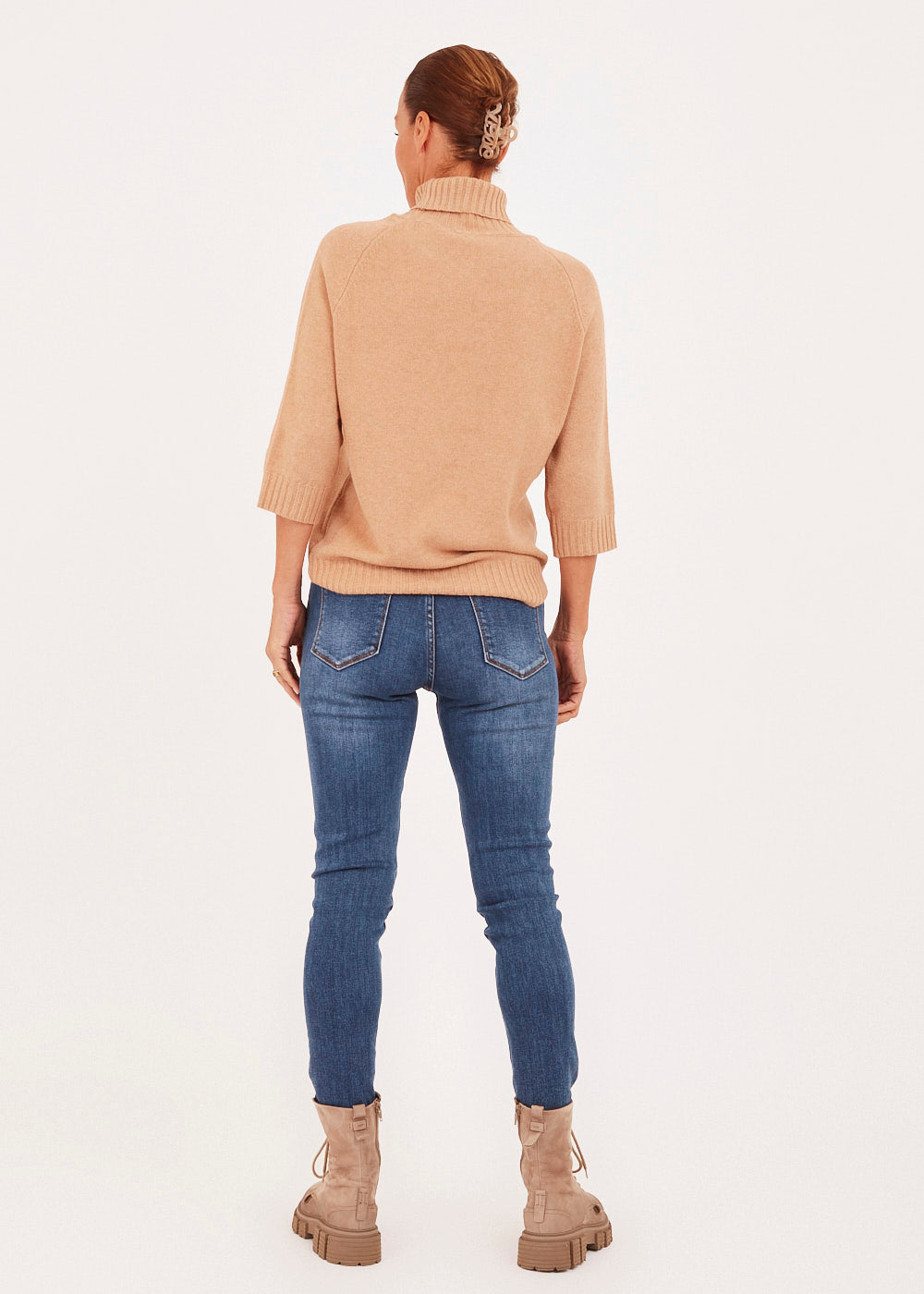 Unser Strickliebling! Kastig geschnittener Strickpullover mit Rollkragen aus unserem Viskose-Kuschelgarn. Mit Rippenbündchen am Kragen und am Ärmelnabschluss. Mit 3/4-Arm.
