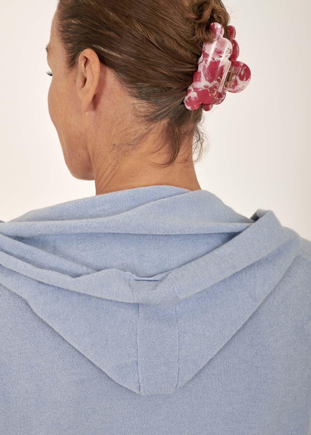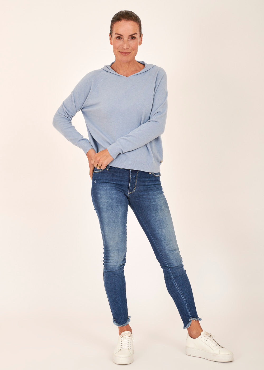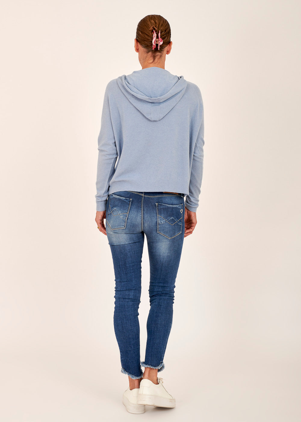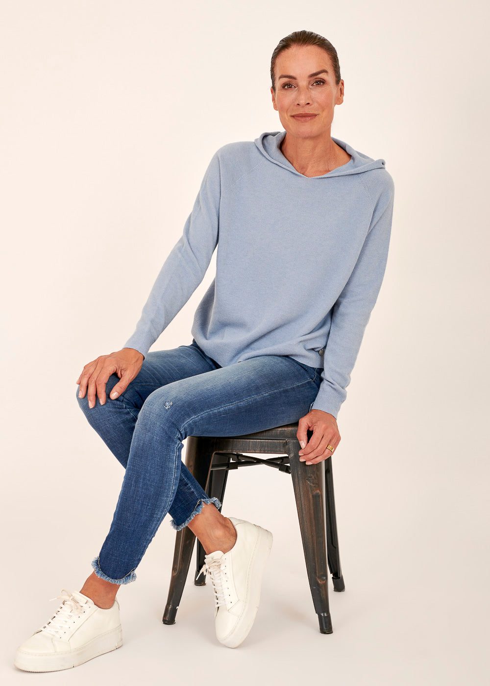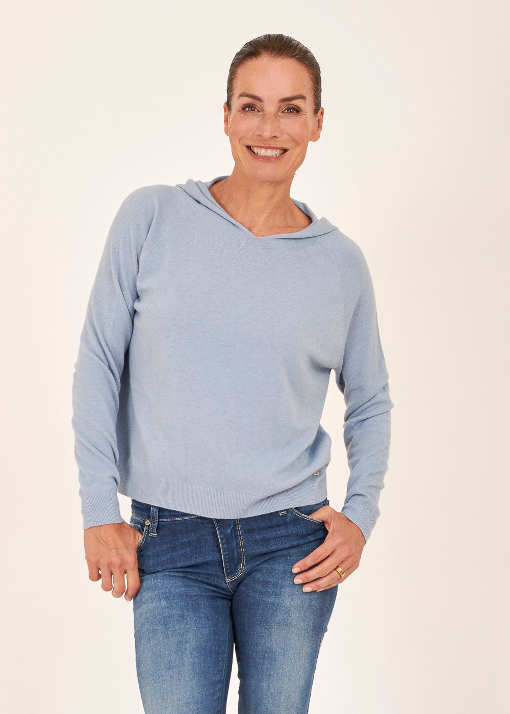 Lässig geschnittener Kapuzenpullover mit extra breitem Rippenbündchen, Kapuze mit Kordeln und Rippenbündchen am Ärmelsaum. Die besonderen Strickdetails im Arm Bereich geben den Pullover einen besonderen Touch.
