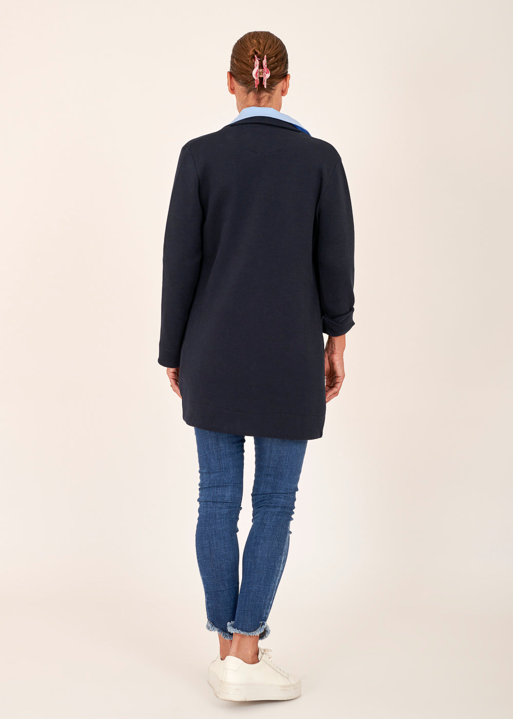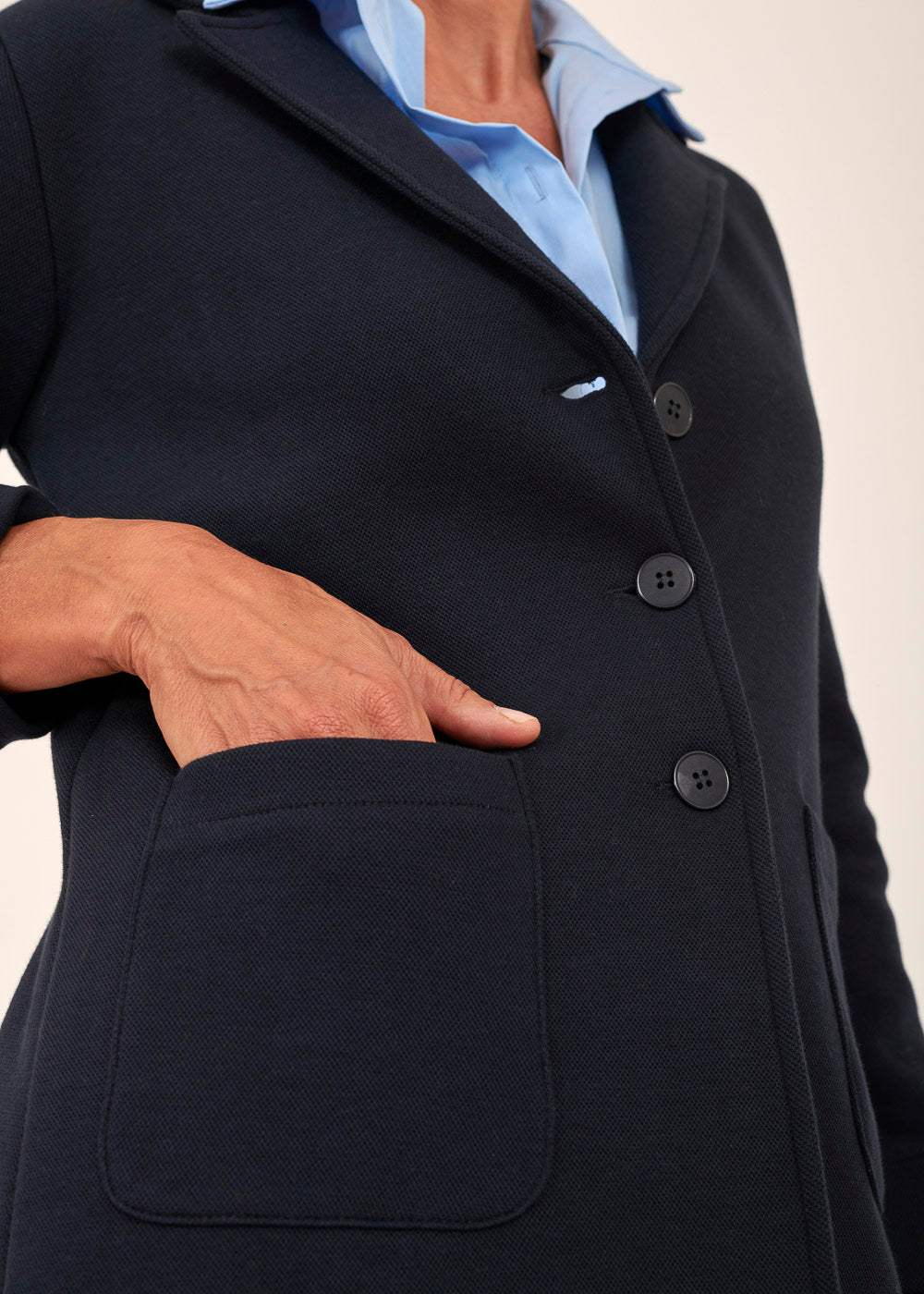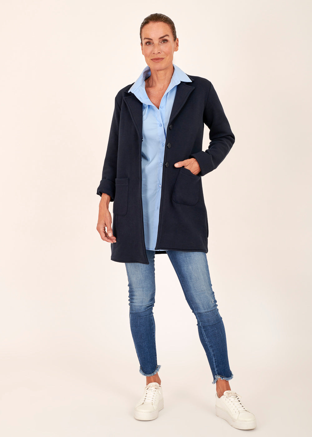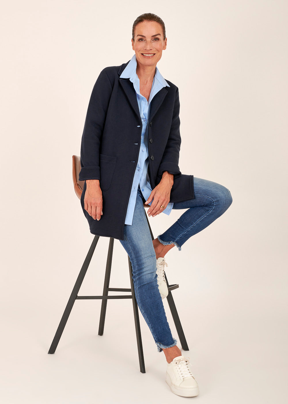 Länger geschnittener Blazer in einem großartigen Design. Er hat seitliche Eingriffstaschen und eine Knopfleiste. Die gekonnte Schnittführung zaubert eine feminine Silhouette. Wer es etwas legerer mag, kann ein lässiges Outfit aus Jeans und Shirt mit der stylischen Jacke aufpeppen. Stilvoller und zeitloser Begleiter.