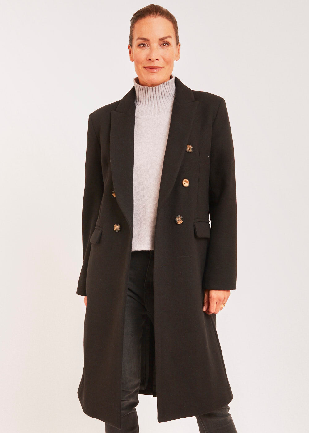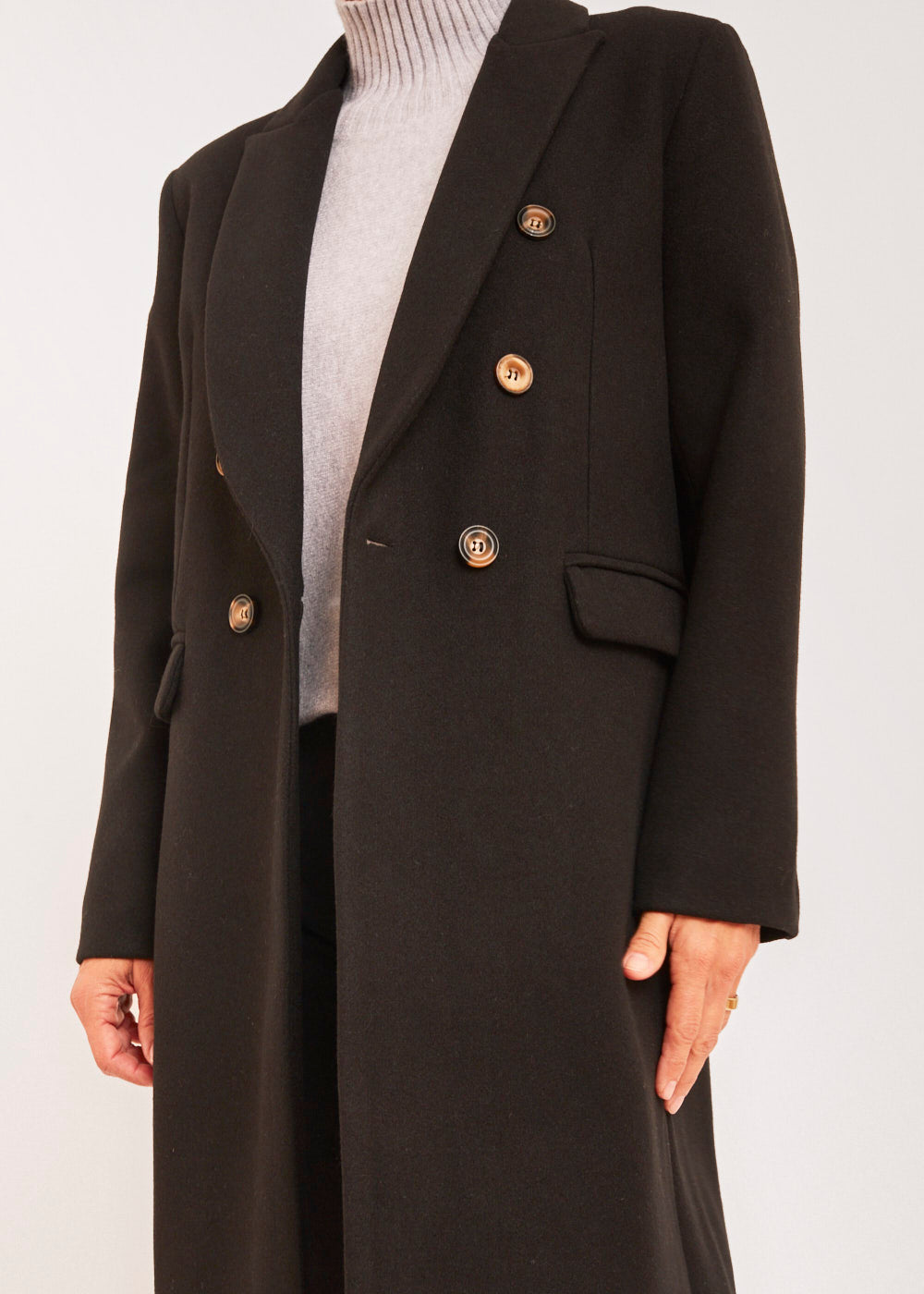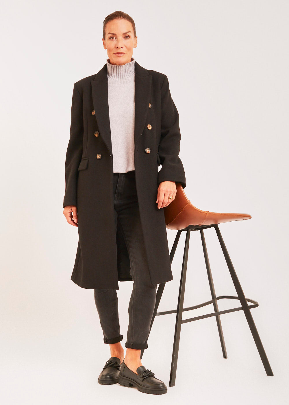 Entdecke die zeitlose Eleganz und unübertroffene Raffinesse mit unserem doppelreihigen Mantel in klassischem Schwarz. Dieser exquisit gefertigte Mantel verkörpert den perfekten Mix aus Stil und Funktionalität und ist ein unverzichtbaren Teil deiner Garderobe.