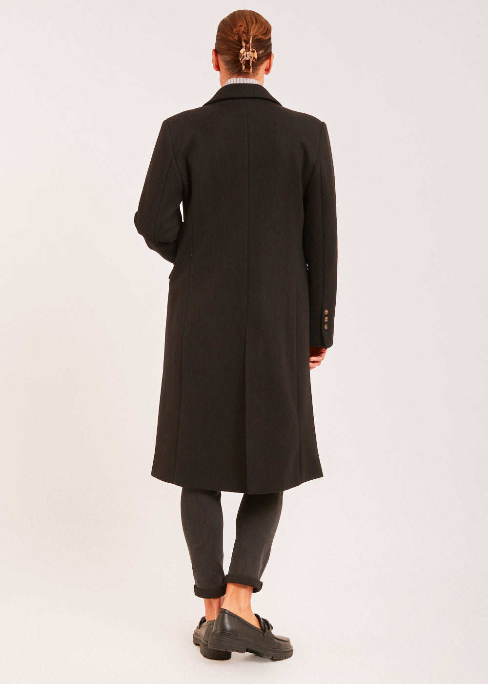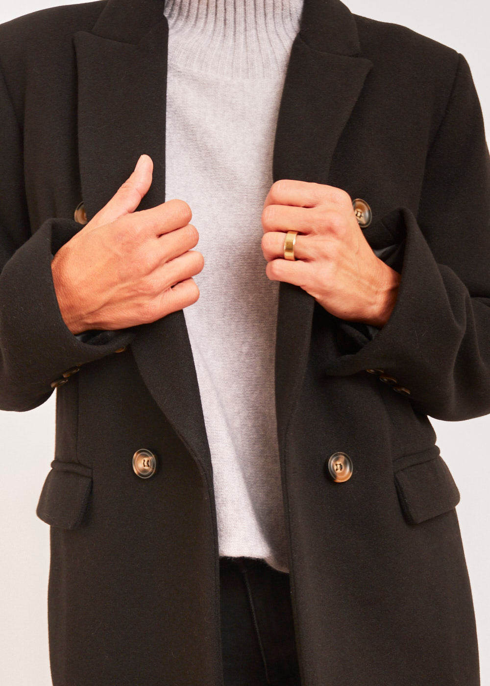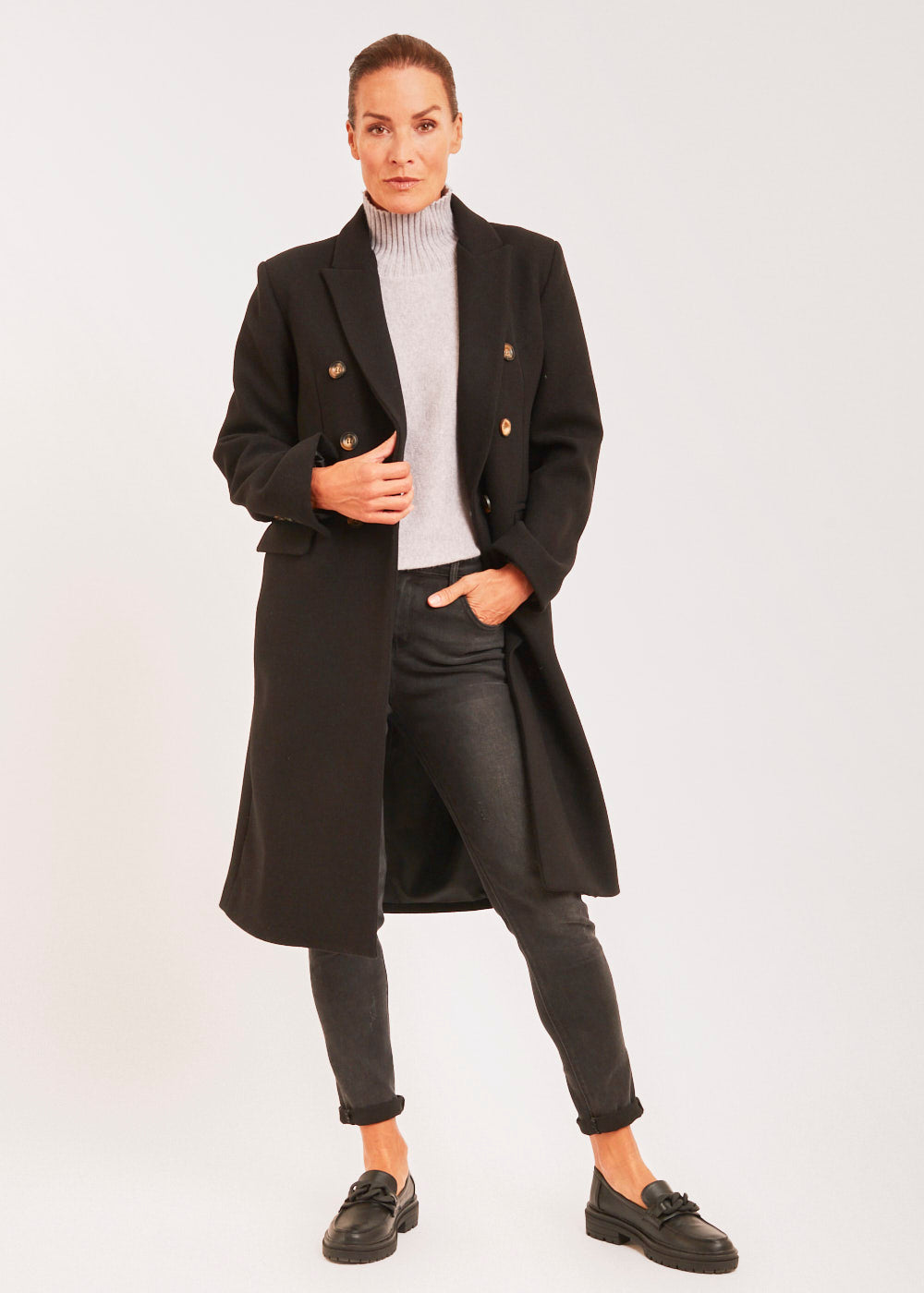 Entdecke die zeitlose Eleganz und unübertroffene Raffinesse mit unserem doppelreihigen Mantel in klassischem Schwarz. Dieser exquisit gefertigte Mantel verkörpert den perfekten Mix aus Stil und Funktionalität und ist ein unverzichtbaren Teil deiner Garderobe.