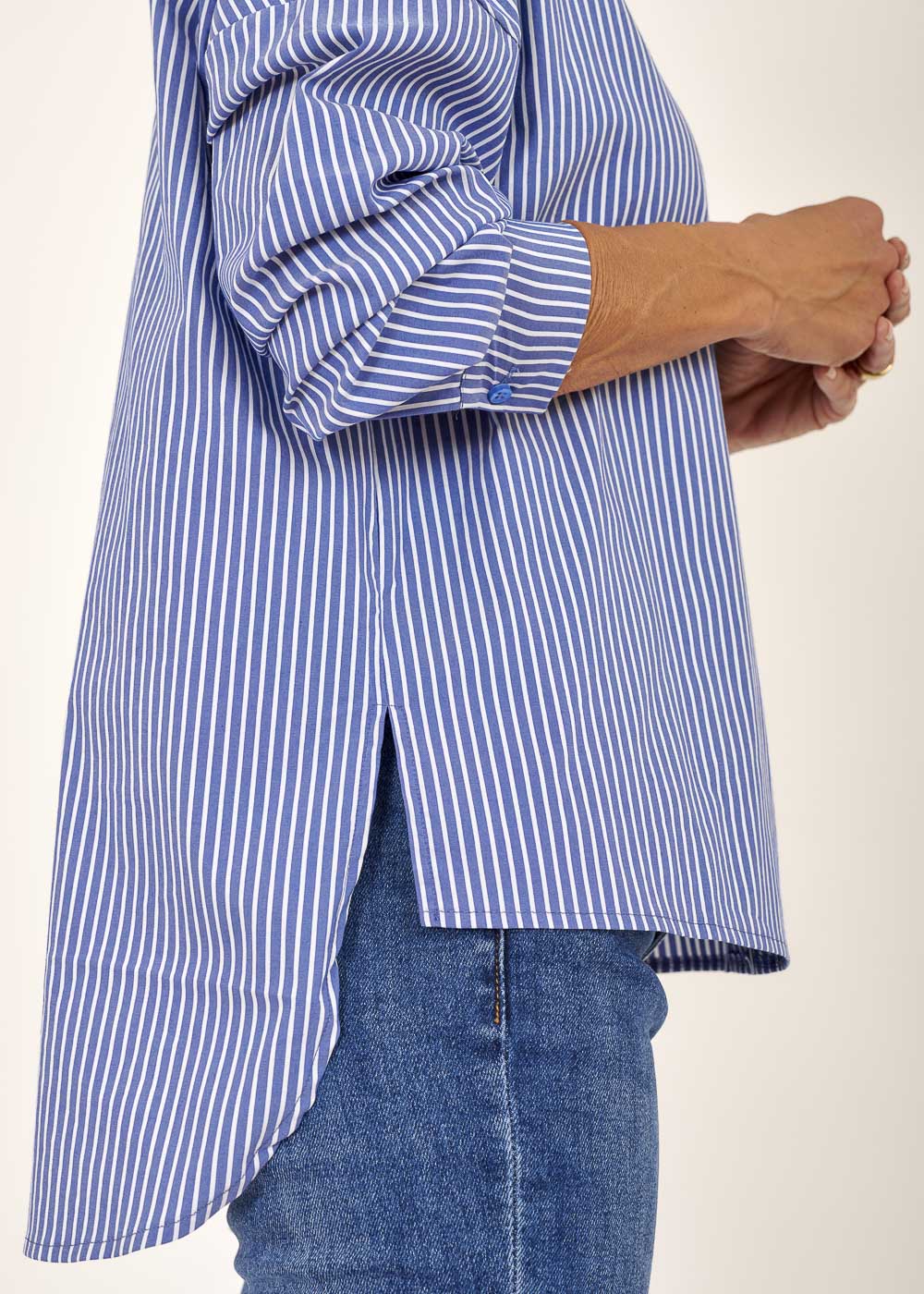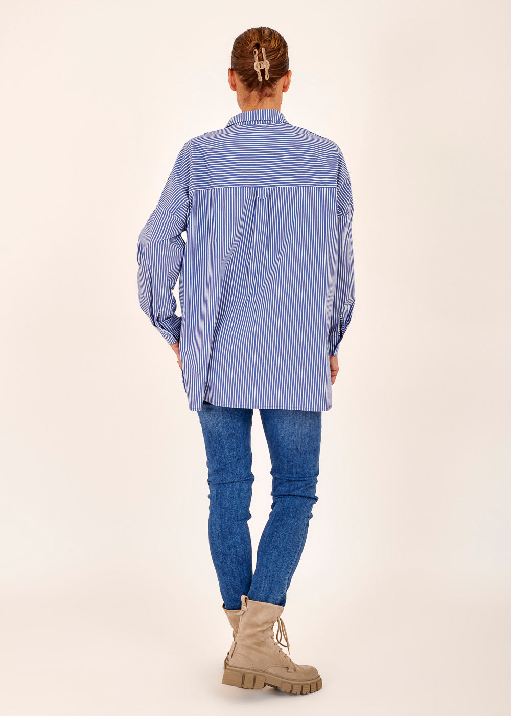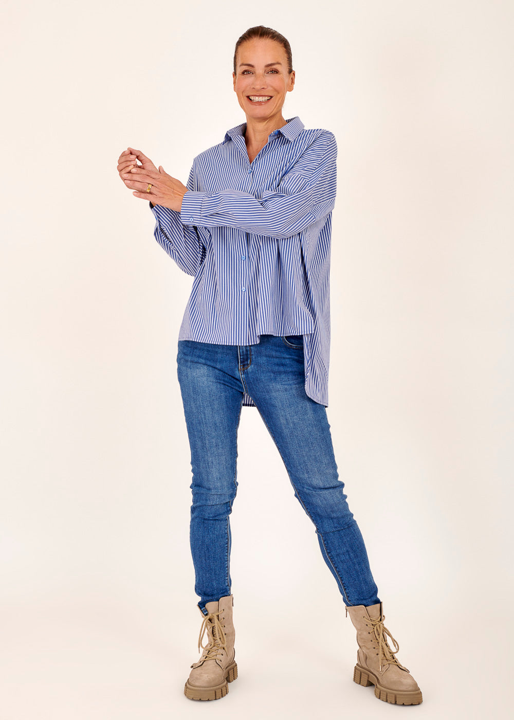 Das Trend Must-Have. Diese gestreifte Bluse im Hemdkragen Stil ist lässig geschnitten und hat ein leicht verlängertes Rückenteil. Gestreifte Blusen sind vielseitige Kleidungsstücke, die sich leicht in deinen Look integrieren lassen. Ob du sie als lässige Freizeitkleidung oder als formales Business-Outfit trägst, eine gestreifte Bluse kann immer eine stilvolle Wahl sein.