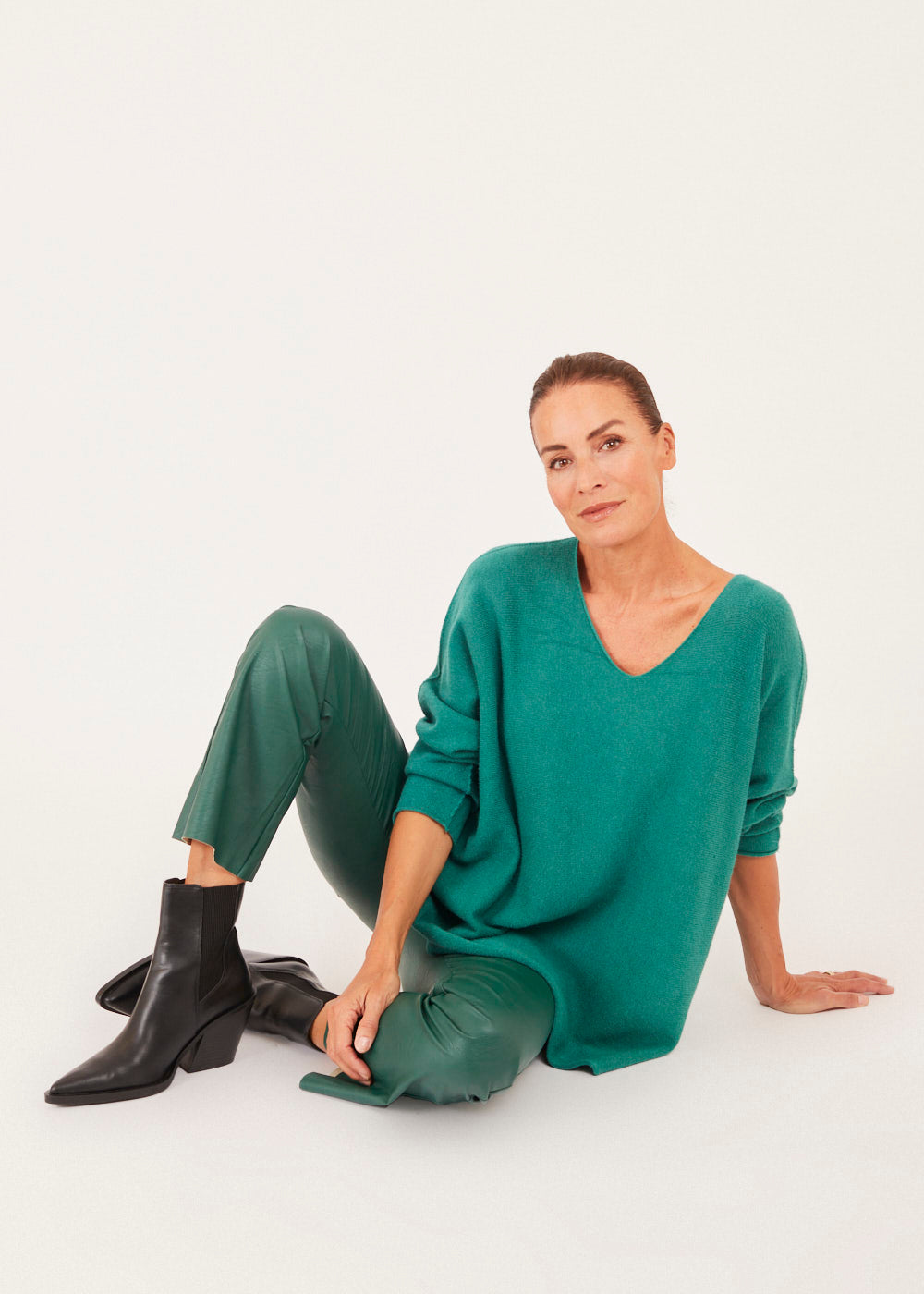 Leichter und gemütlicher Oversizepullover mit V-Ausschnitt. Mit überschnittenen Ärmeln aus unserem Kuschelgarn. Einfach zum Wohlfühlen. Kombiniere diesen Artikel gerne mit einer unserer Please Fashion Hosen.