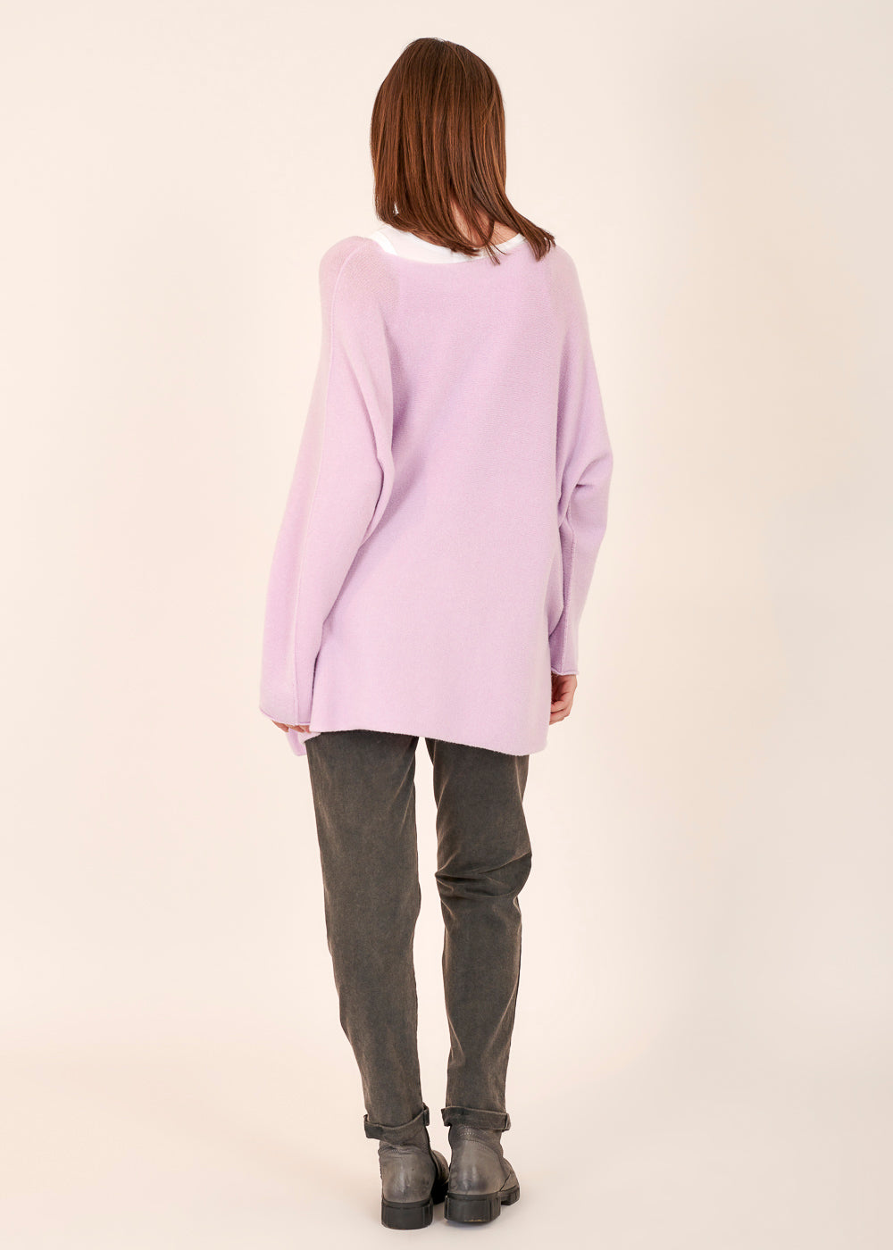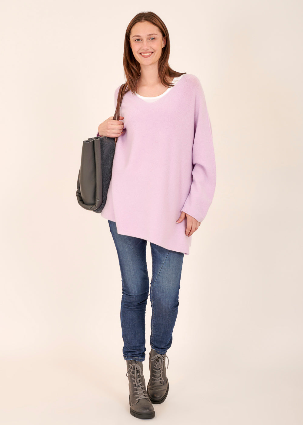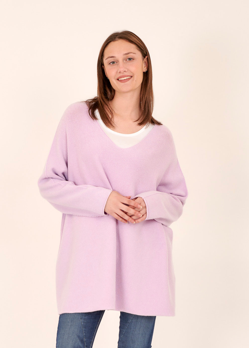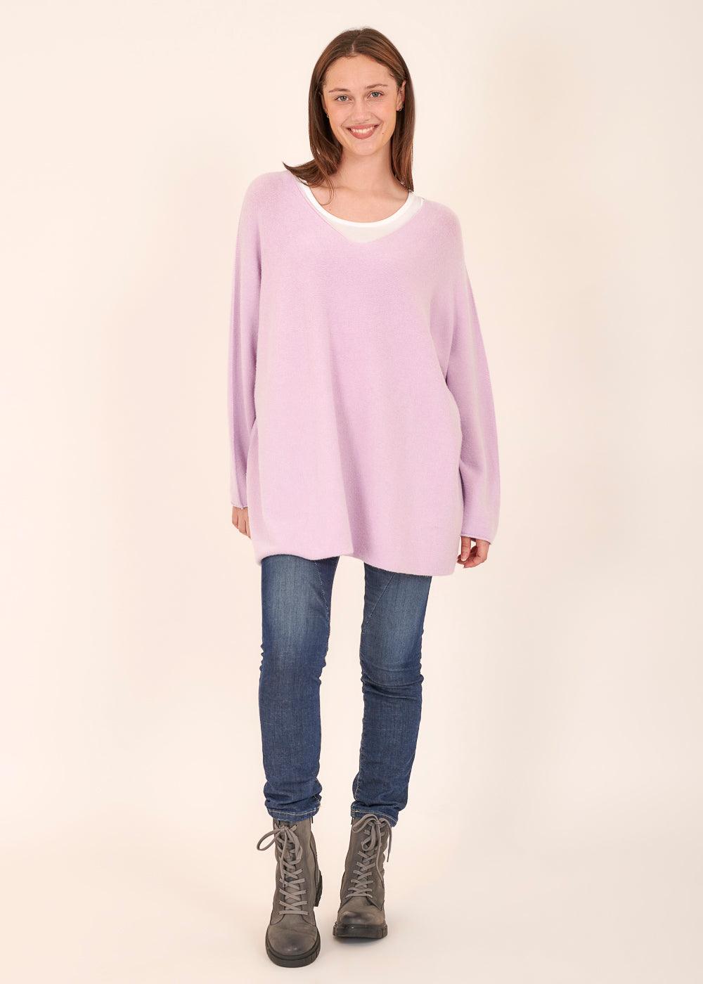 Leichter und gemütlicher Oversizepullover mit V-Ausschnitt. Mit überschnittenen Ärmeln aus unserem Kuschelgarn. Rippenbündchen an den Ärmeln und Schlitzen an den Seiten. Einfach zum Wohlfühlen. Kombiniere diesen Artikel gerne mit einer unserer Skinny Jeans.