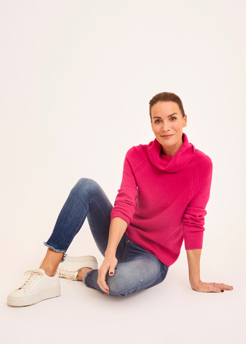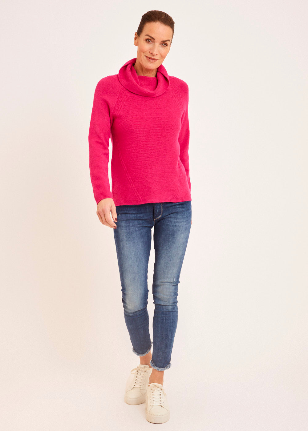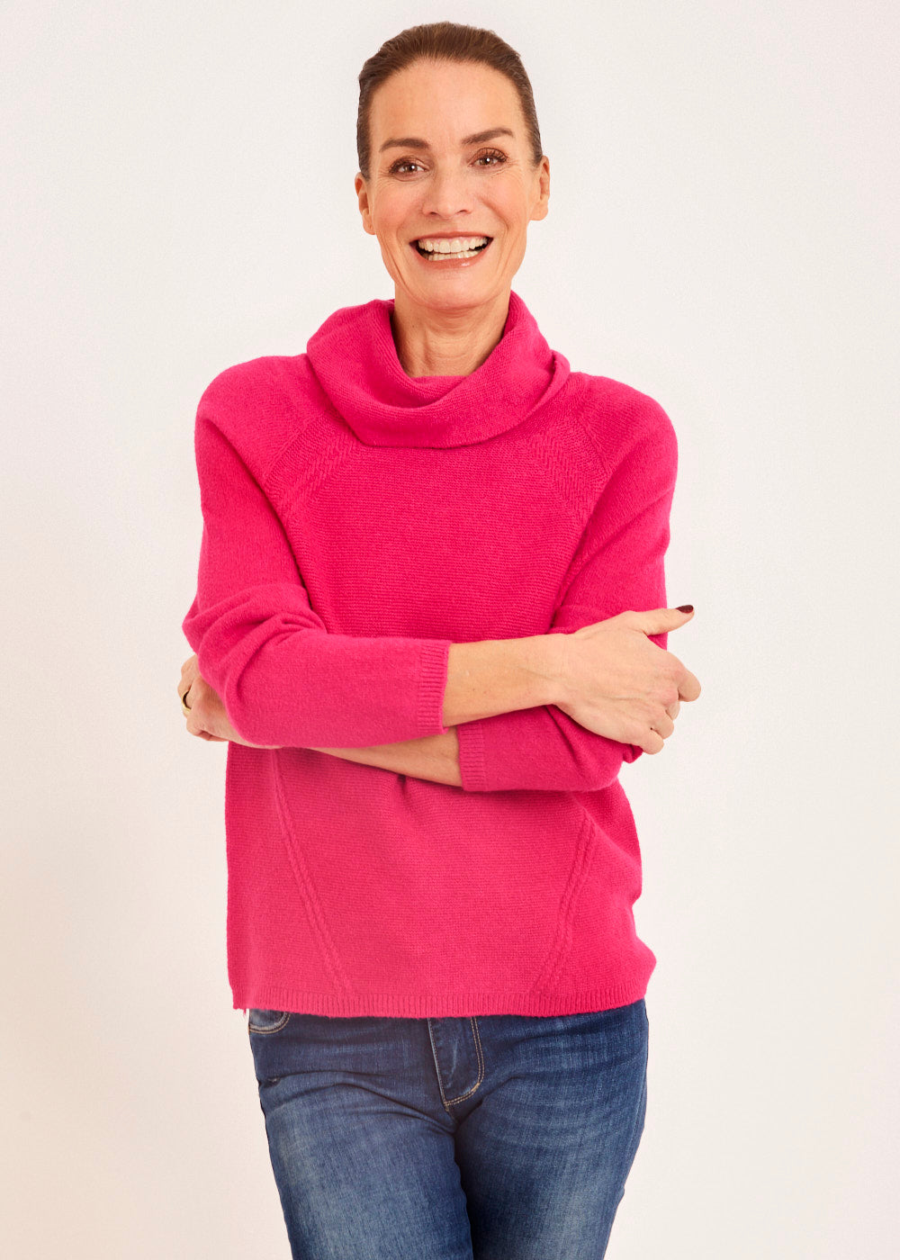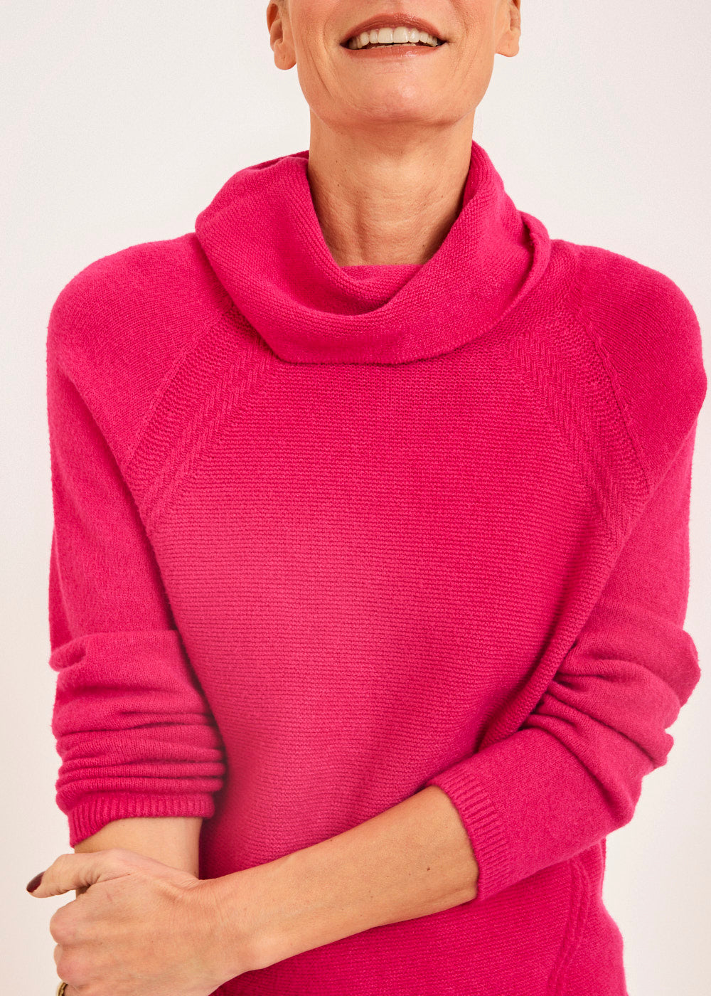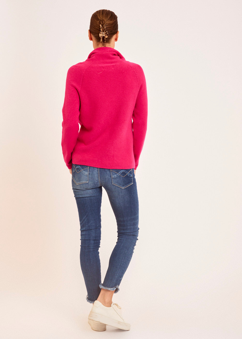 Der Wasserfallausschnitt verleiht dem Pullover eine verspielte und feminine Note, während die intensive Fuxia-Farbe für einen lebendigen und trendigen Look sorgt. Der lockere Schnitt und die fließende Silhouette des Pullovers schaffen eine einzigartige Ästhetik, die sowohl stylisch als auch bequem ist.