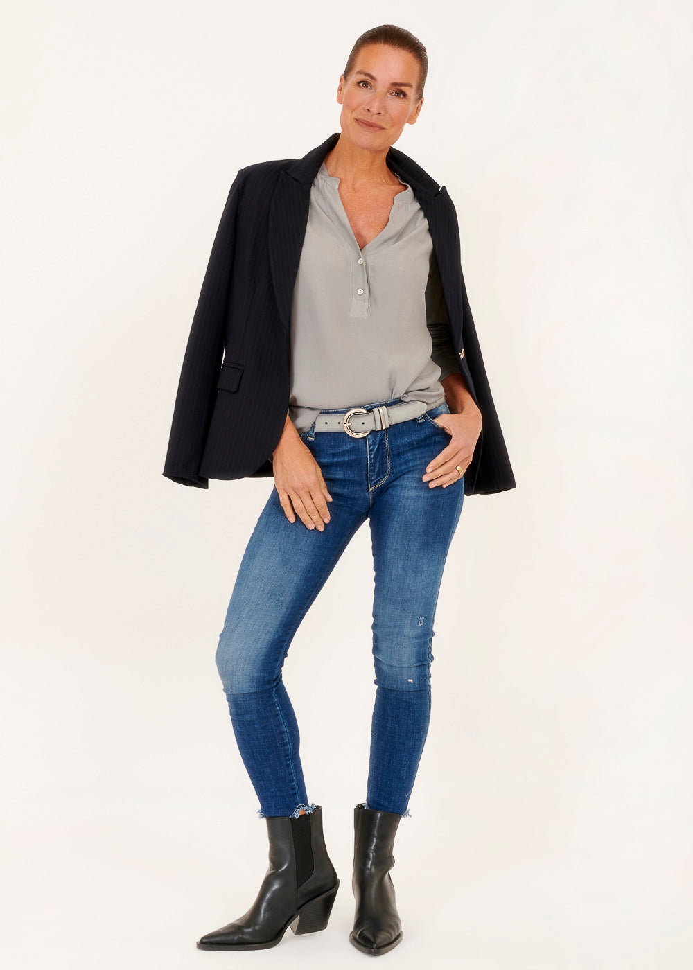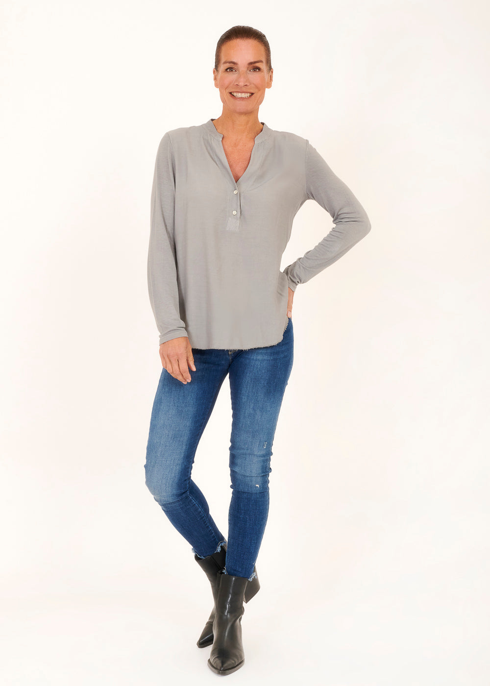 Viskosebluse mit halber Knopfleiste und Stehkragen. Etwas länger und legerer geschnitten mit einem Materialmix an den Armen. Einfach absolutes Basic Must-Have.