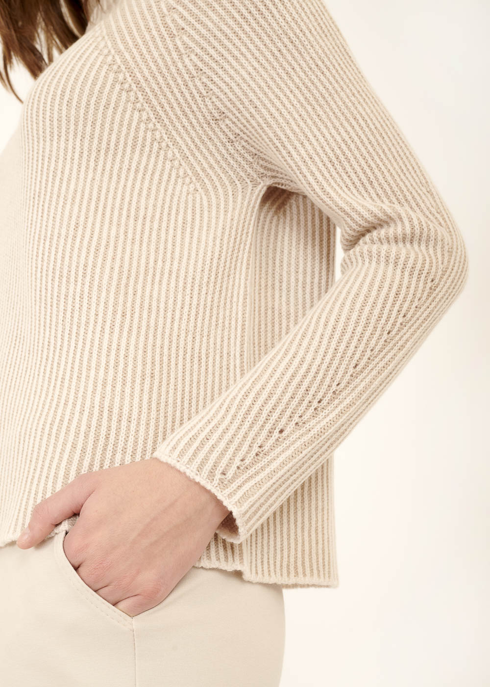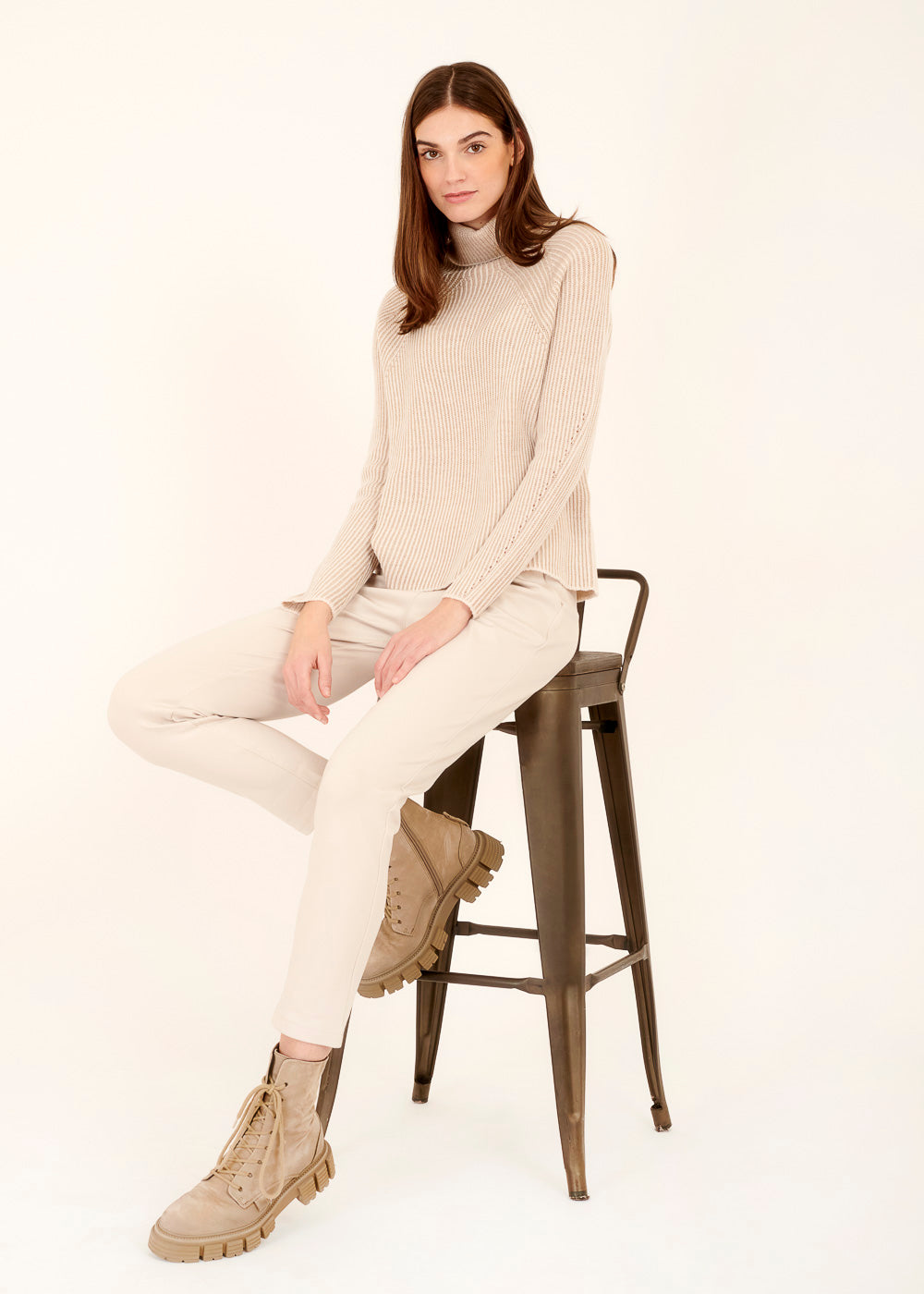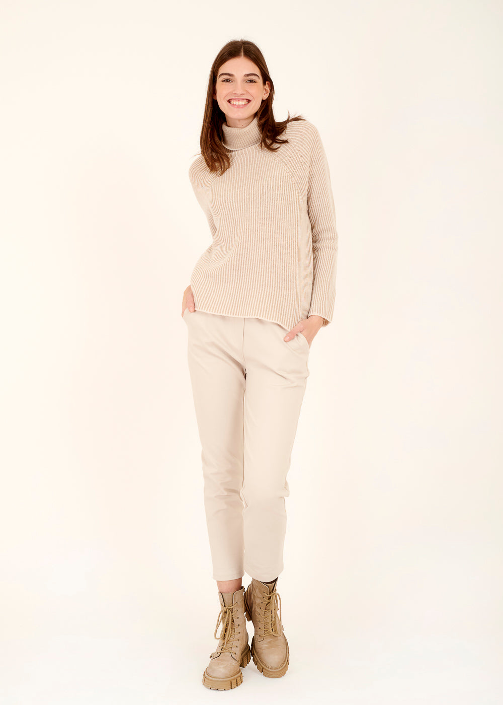 Unser edler Rollkragenpullover ist das perfekte Kleidungsstück für kühlere Tage. Mit seinem besonderen Strickmuster und seiner Beigen zeitlosen Farbe, lässt er sich zu sämtlichen Outfits kombinieren. Die abgesetzte weiße Farbe geben dem Pullover eine zusätzliche frische Note. Das weiche und hochwertige Material sorgt für ein angenehmes Tragegefühl, während der Schnitt eine schmeichelhafte Passform gewährleistet.