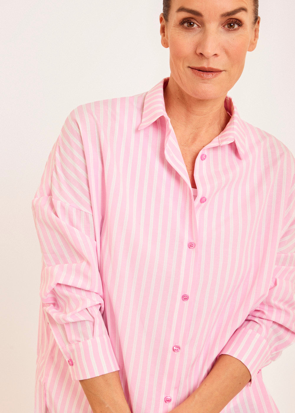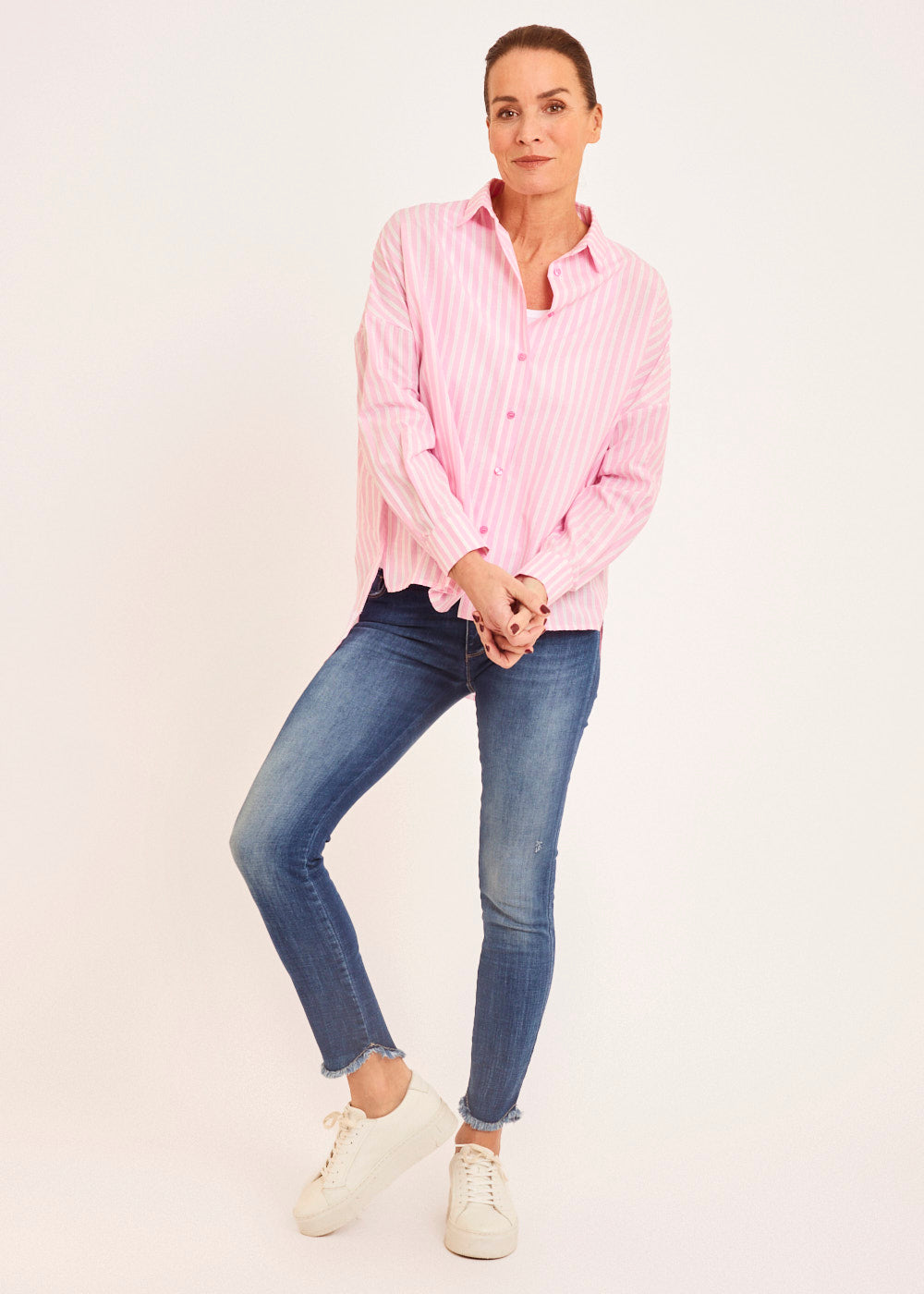 Das Trend Must-Have. Diese gestreifte Bluse im Hemdkragen Stil ist lässig geschnitten und hat ein leicht verlängertes Rückenteil. Gestreifte Blusen sind vielseitige Kleidungsstücke, die sich leicht in deinen Look integrieren lassen. Ob du sie als lässige Freizeitkleidung oder als formales Business-Outfit trägst, eine gestreifte Bluse kann immer eine stilvolle Wahl sein.