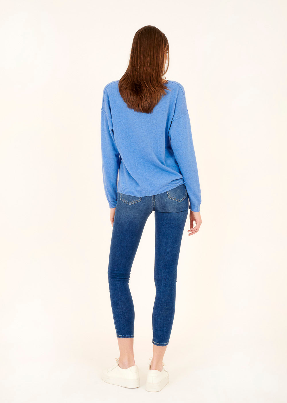 Erfreue dich an der perfekten Symbiose aus Stil und Komfort mit diesem blauen Strickpullover. Ein vielseitiges Kleidungsstück, das deinem Outfit eine elegante Nuance verleiht und gleichzeitig eine entspannte Atmosphäre bewahrt.