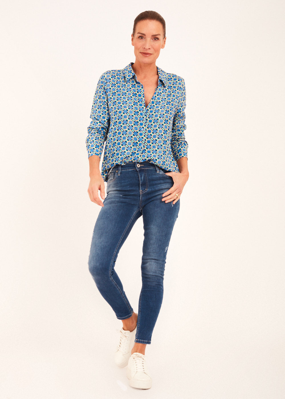 Mit dieser Hemdblusen-Druckbluse setzen Sie ein Statement in Sachen Stil und Individualität. Holen Sie sich das Beste aus beiden Welten – zeitlose Eleganz und moderne Raffinesse – mit unserer blauen Druckbluse.