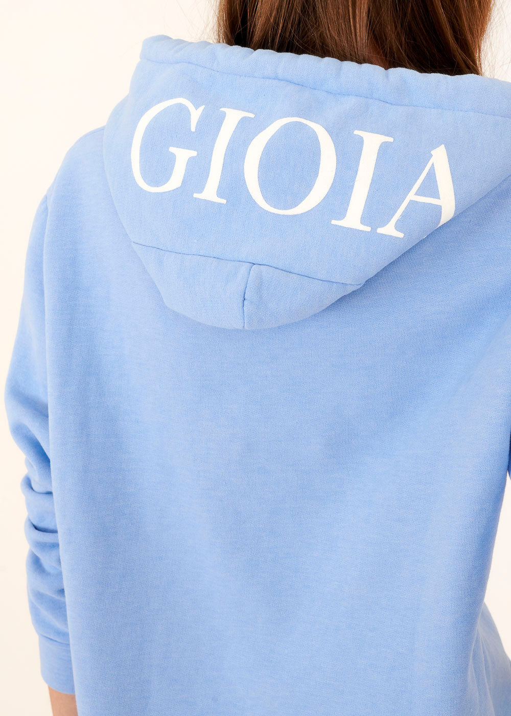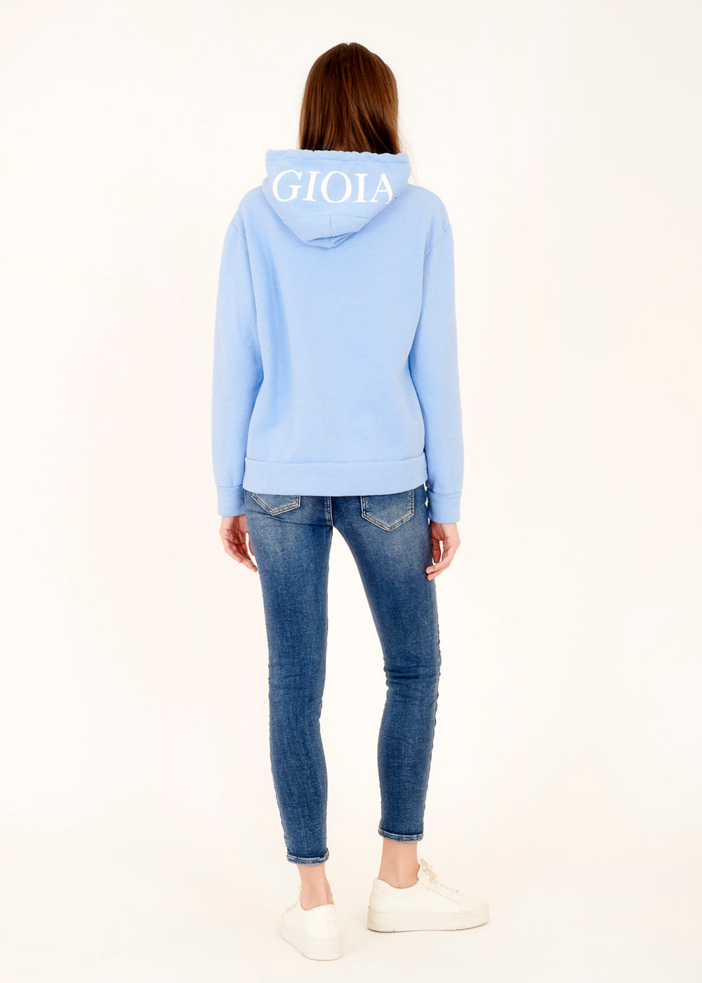 Genieße entspannte Tage in unserem lässigen Kapuzenpullover mit einer besonders coolen Note – die Kapuze ist mit dem inspirierenden Wort "Gioia" verziert, was auf Italienisch "Freude" bedeutet. Dieser Kapuzenpullover verbindet Komfort mit einem Hauch von positiver Energie.