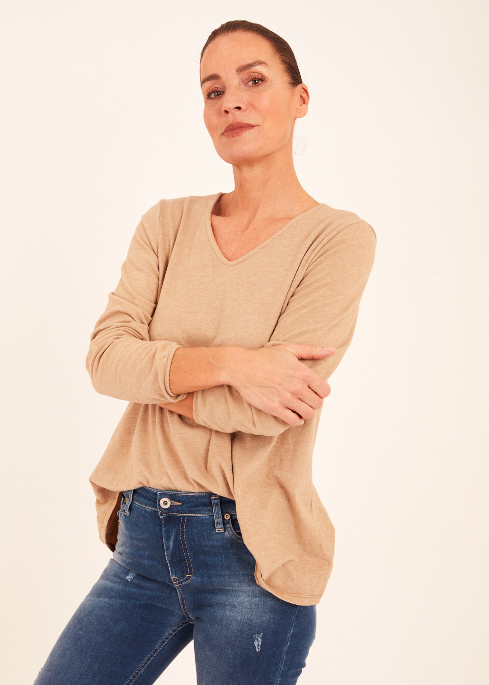 Mit seinem kuscheligen Charme wird dieses V-Shirt schnell zu Ihrem Lieblingsstück im Kleiderschrank. Setzen Sie auf Wohlfühlmomente und Stil mit unserem beige-farbenen kuscheligen V-Shirt.