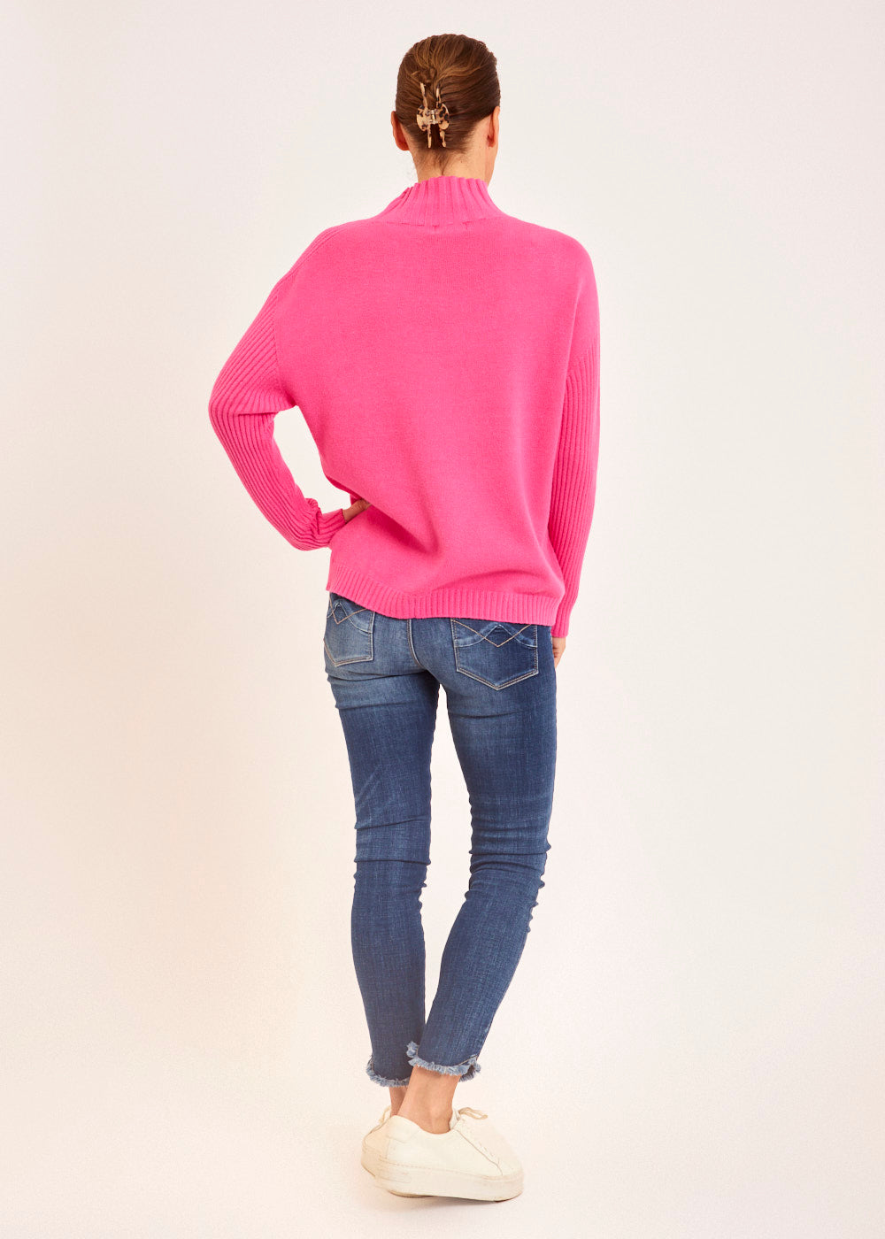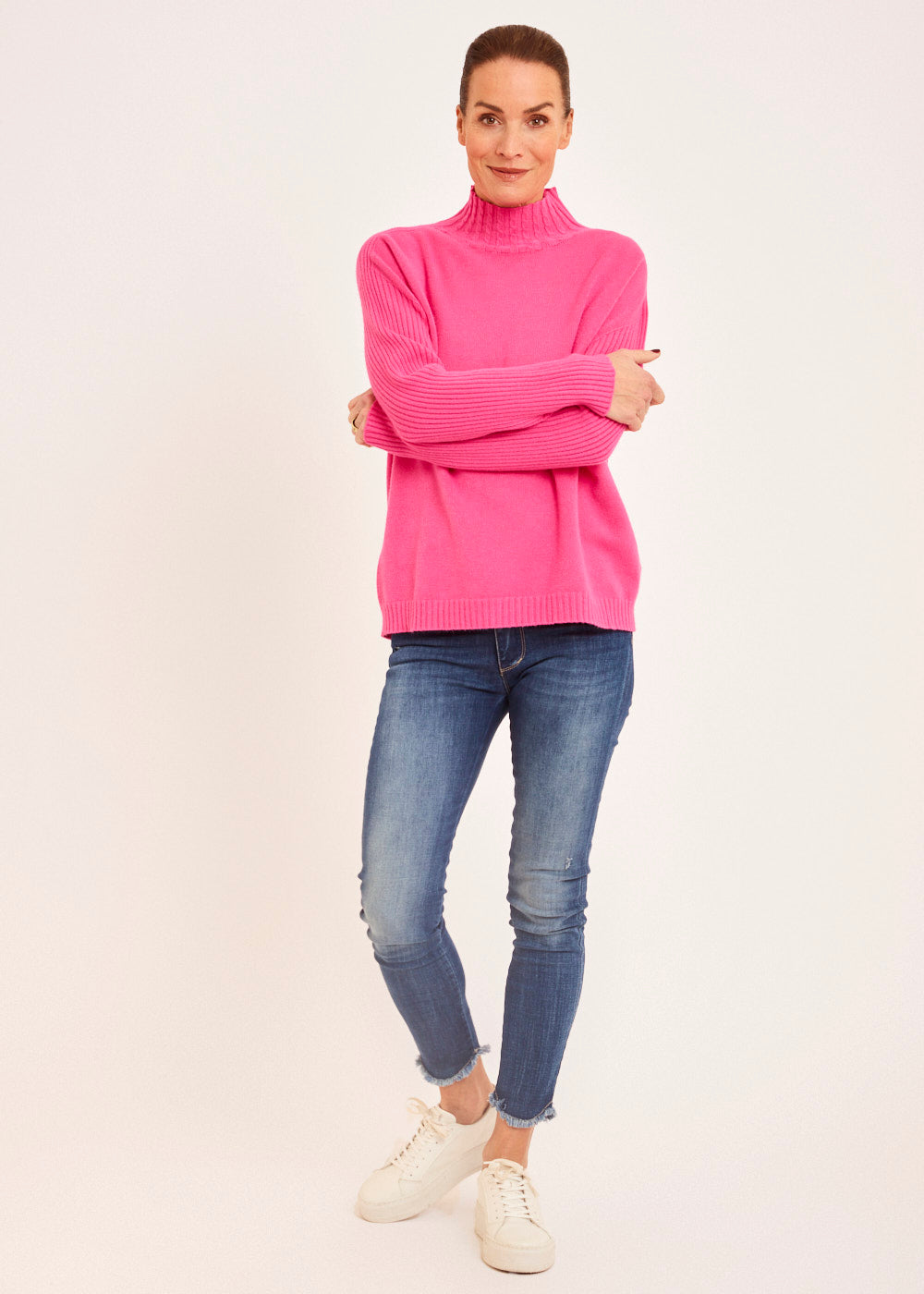Der kuschelige Rollkragen schützt dich vor Wind und Kälte, während das auffällige Zopfmuster dem Pullover eine Extraportion Textur und Charme verleiht. Das strahlende Pink bringt Frische in deine Herbst- und Wintergarderobe und setzt dich modisch in Szene.