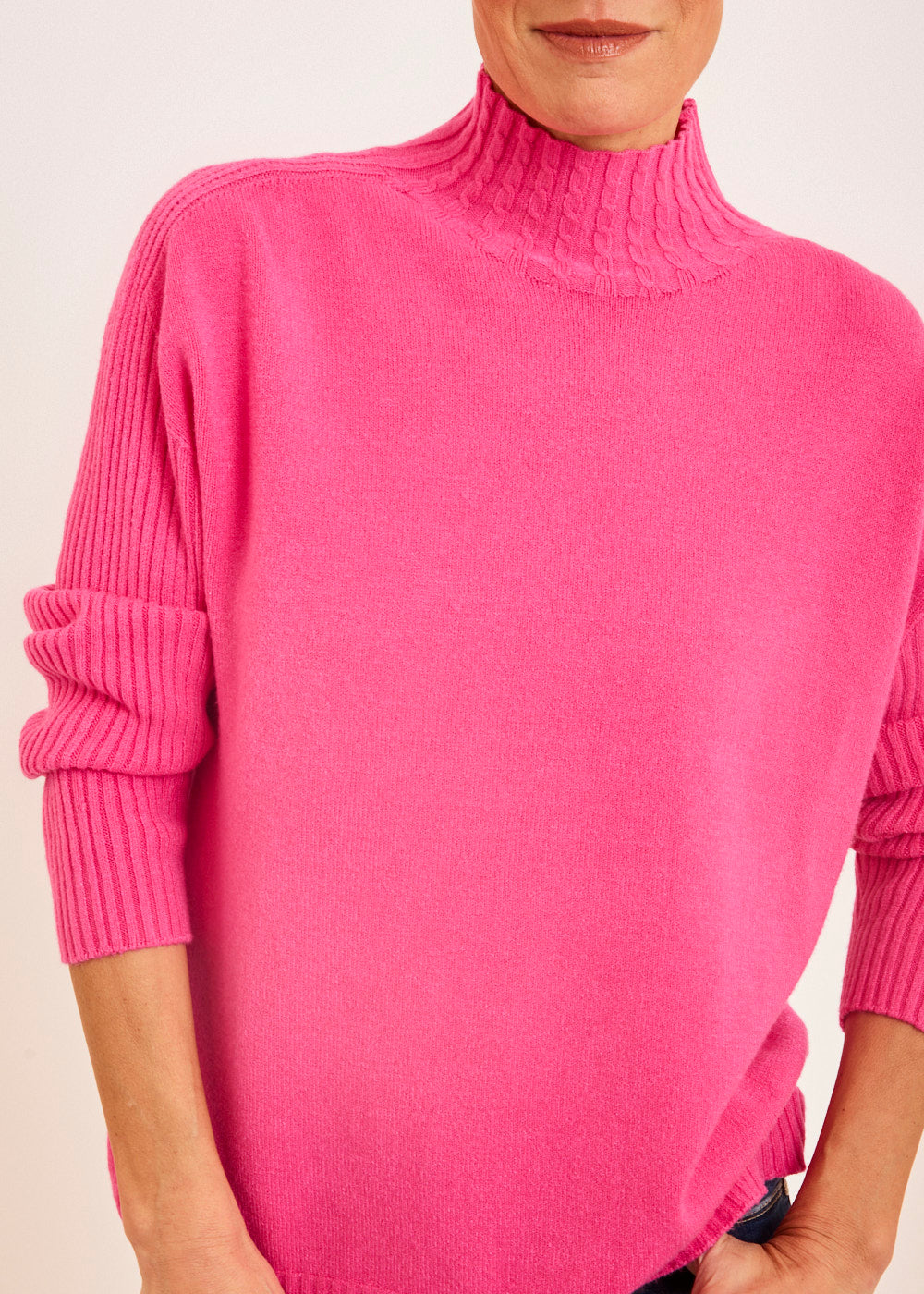 Setze ein modisches Statement und bestelle unseren Rollkragenpullover mit Zopfmuster in Pink noch heute. Kreiere unkompliziert trendige Outfits und genieße Komfort und Style in einem Kleidungsstück.