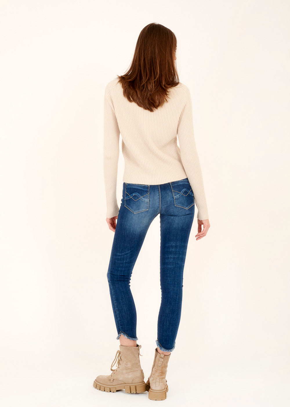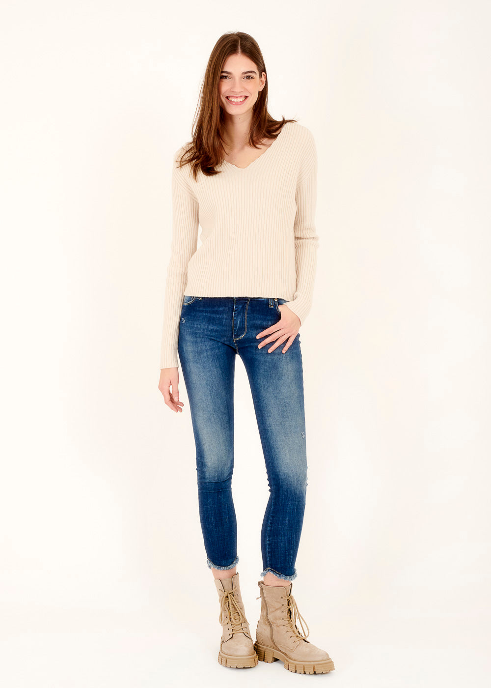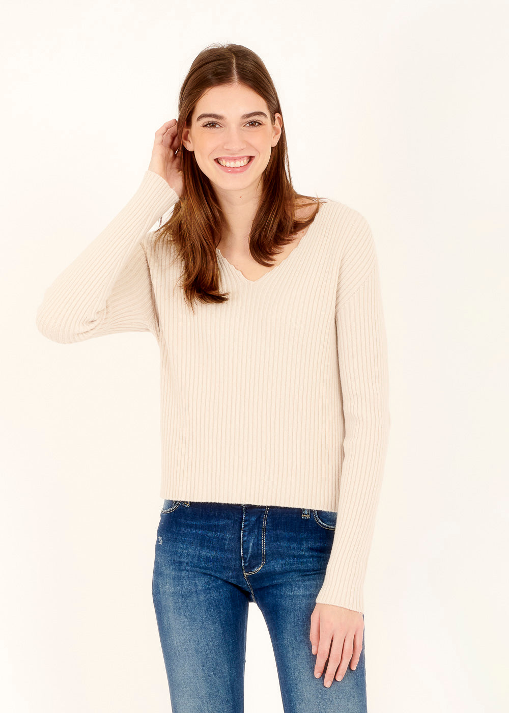Die dezente Beigefarbe macht diesen Pullover zu einem vielseitigen Kleidungsstück, das sich leicht in verschiedene Outfits integrieren lässt. Der schmale Schnitt betont die Figur, während die Rippenstruktur dem Pullover eine interessante Textur verleiht.