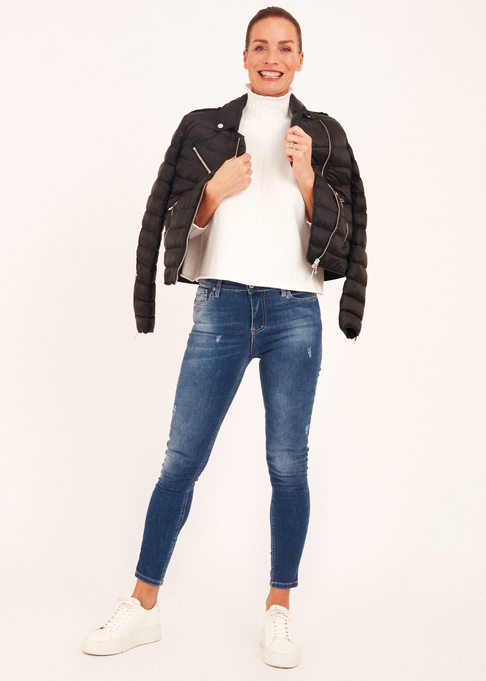Der Stehkragen verleiht diesem Pullover eine moderne Note und sorgt für eine elegante Silhouette. Die verkürzte Passform setzt einen modischen Akzent und macht dieses Kleidungsstück zu einem idealen Begleiter für trendige Outfits. Das leichte Material und die sorgfältige Verarbeitung bieten höchsten Tragekomfort und machen den Pullover zu einem Favoriten für jede Jahreszeit.