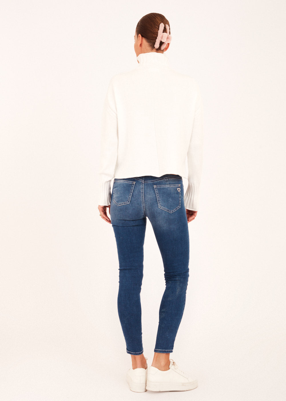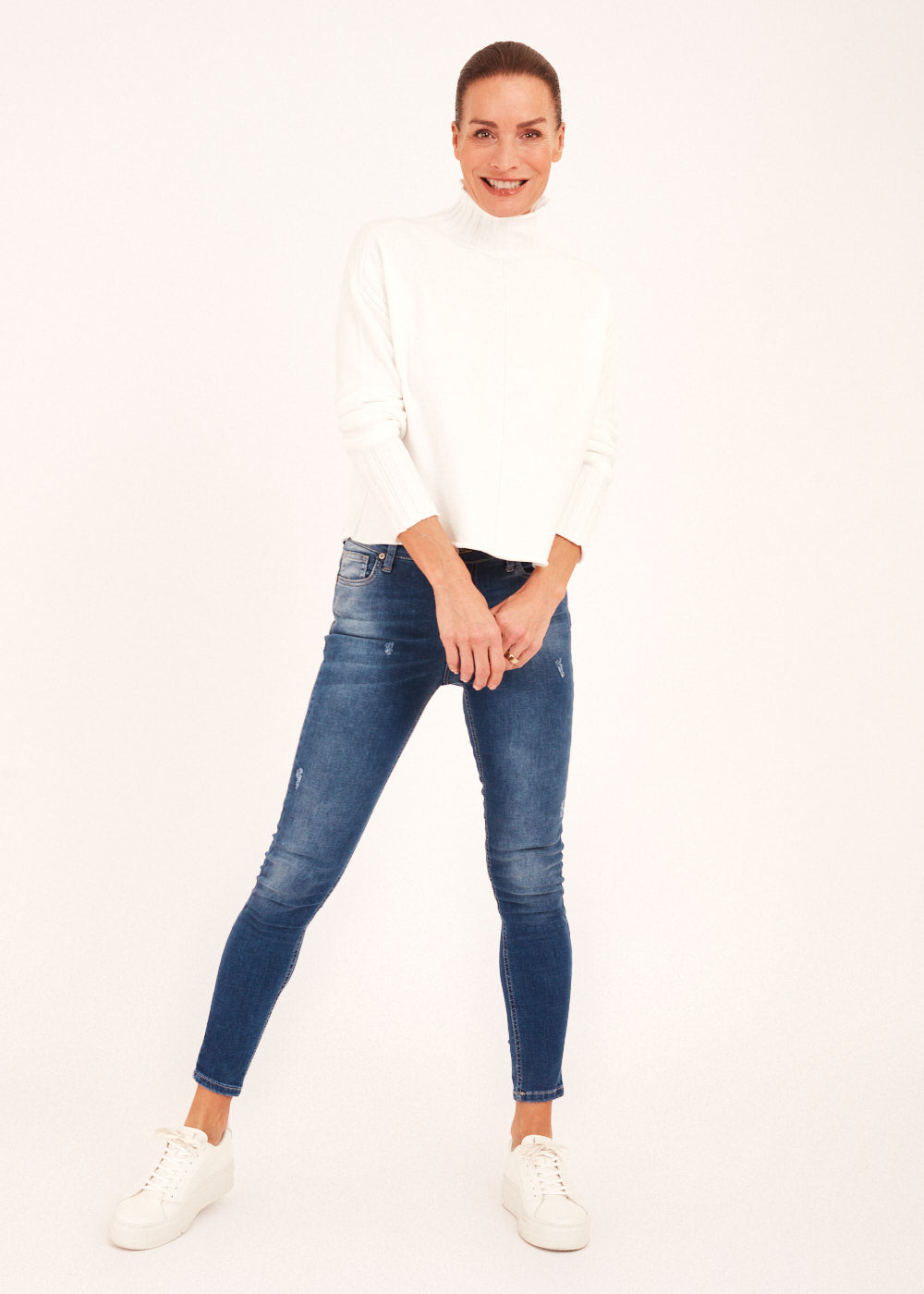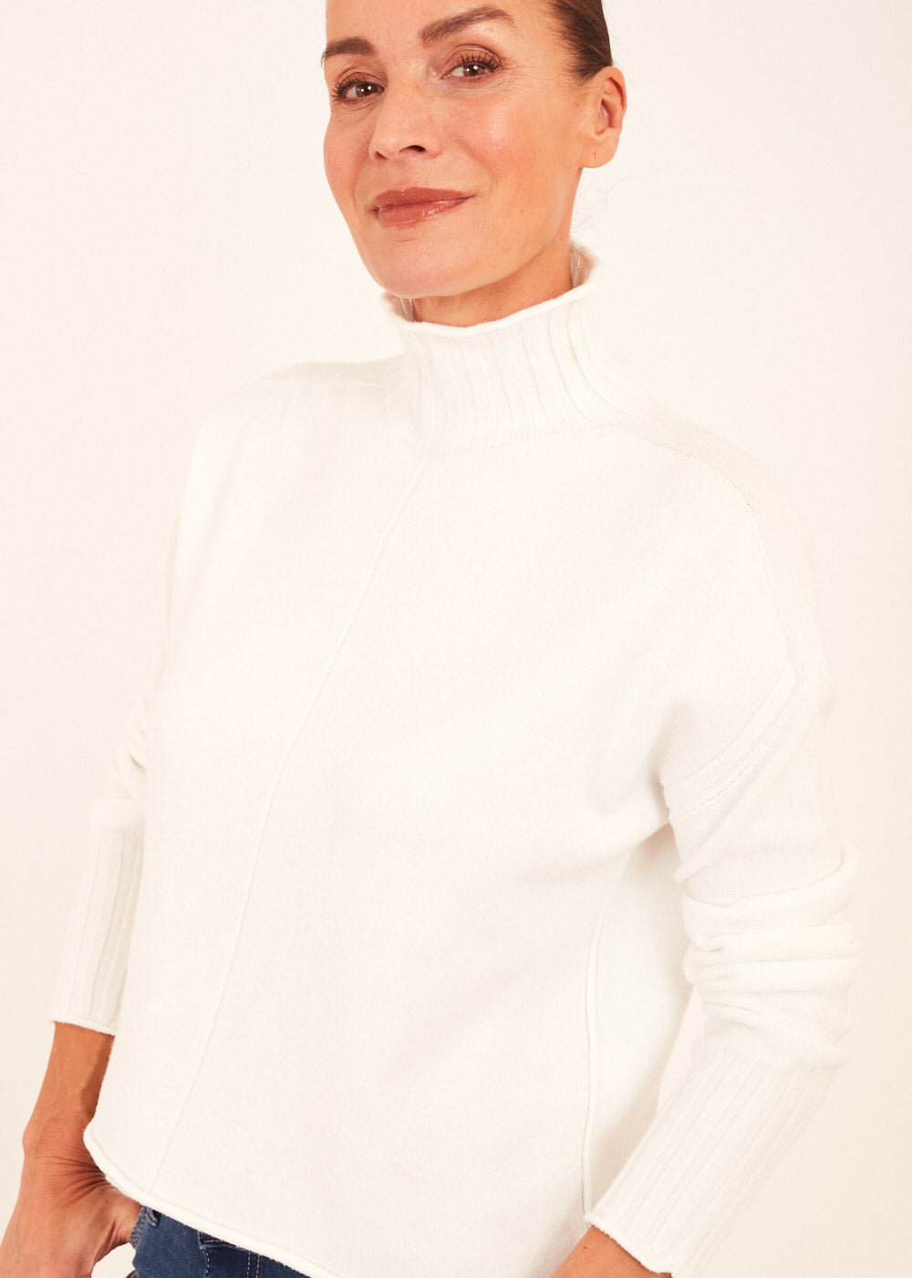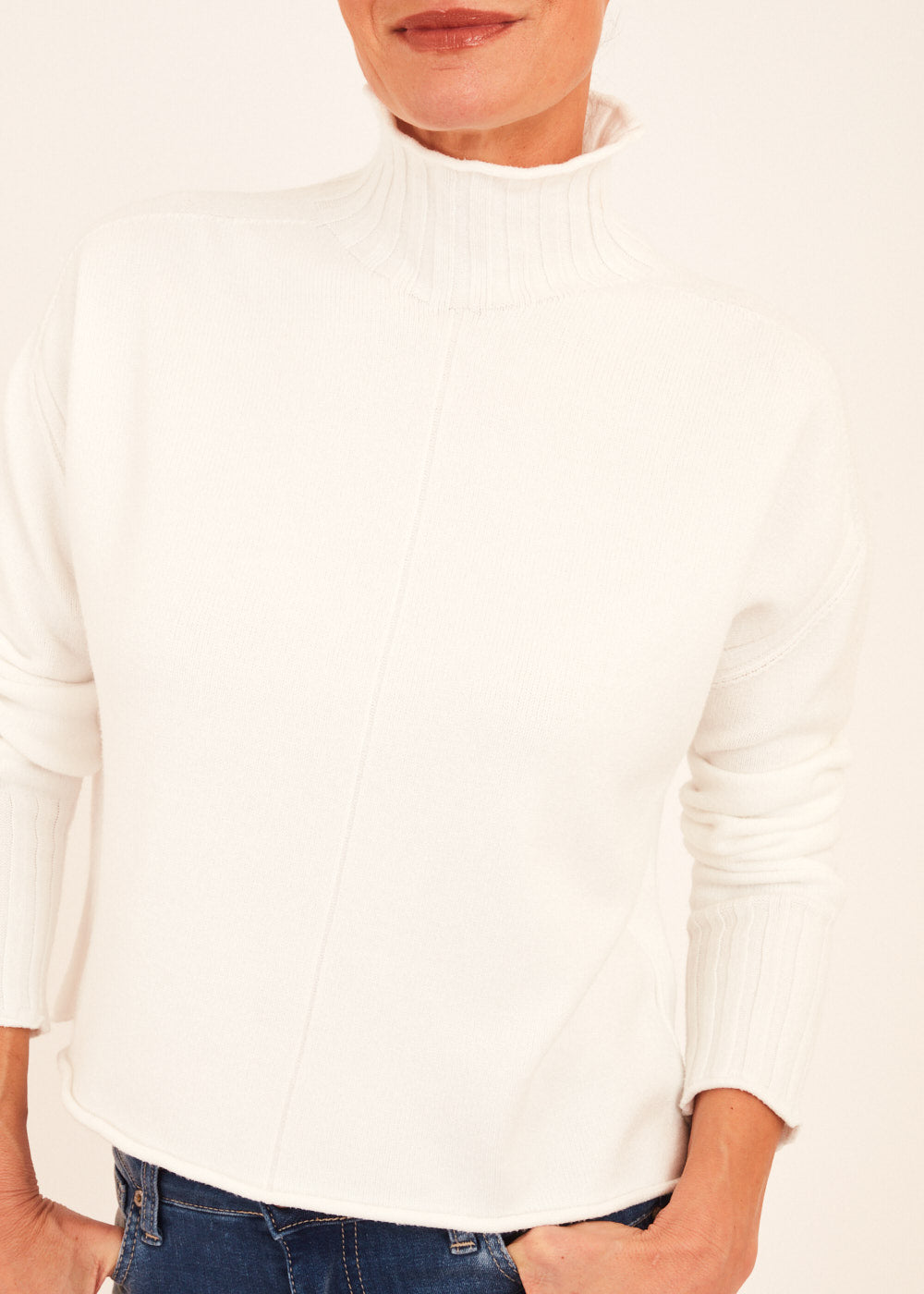 Stehkragenpullover – ein Trendsetter für selbstbewusste Fashion-Liebhaberinnen. Dieser Pullover in einem zarten Panna ist nicht nur ein Blickfang, sondern auch ein Statement für Stil und Individualität.