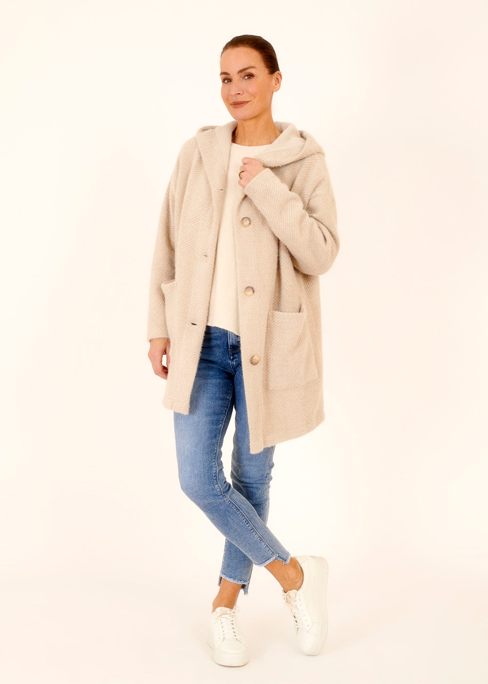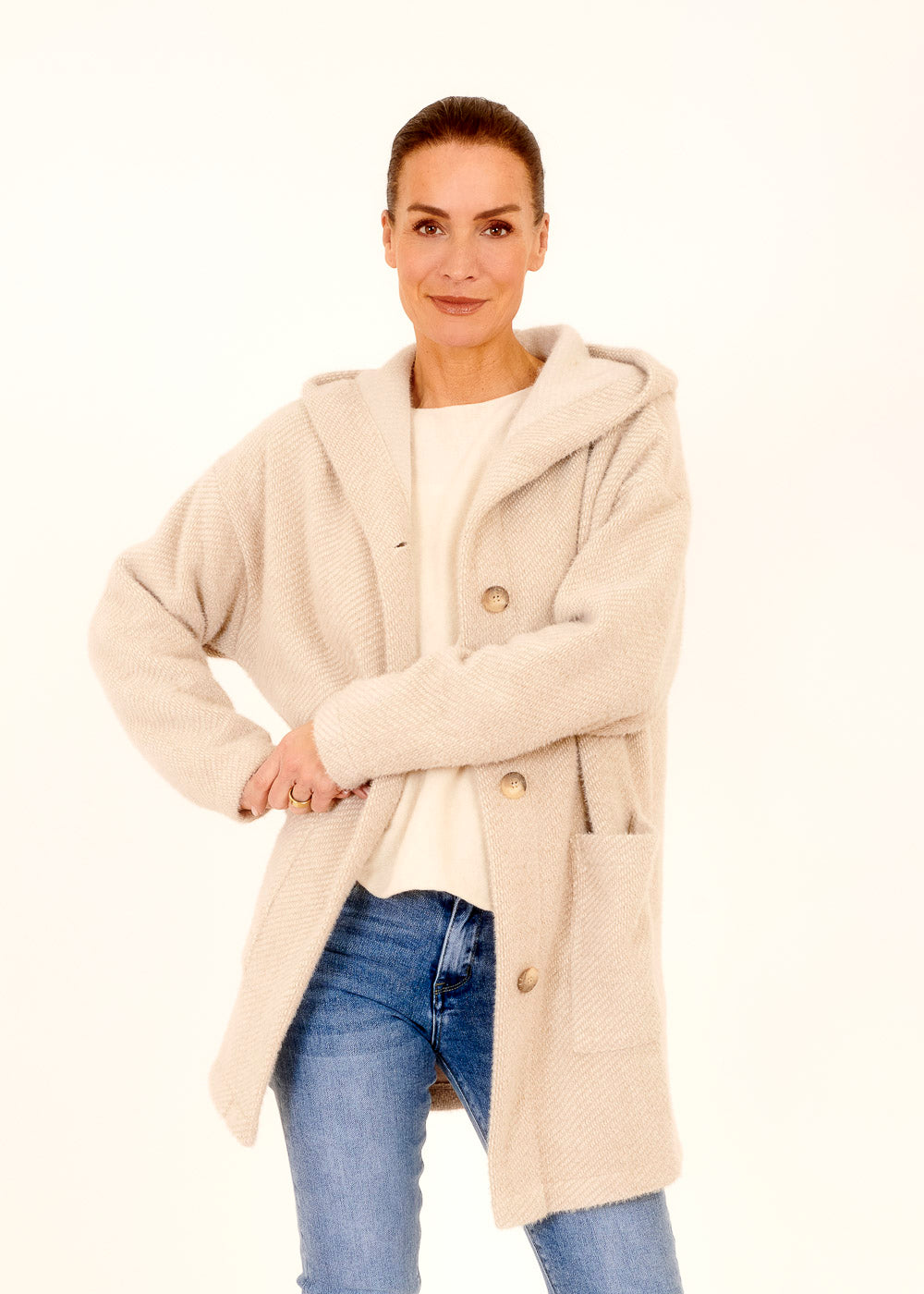 Erlebe den perfekten Mix aus Komfort und Stil mit unserer lang geschnittenen Kapuzenstrickjacke in elegantem Beige. Diese Strickjacke punktet mit ihrem zeitlosen Schnitt, den Knöpfen, einer großzügigen Kapuze und praktischen Taschen.
