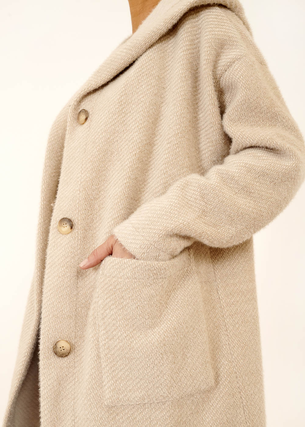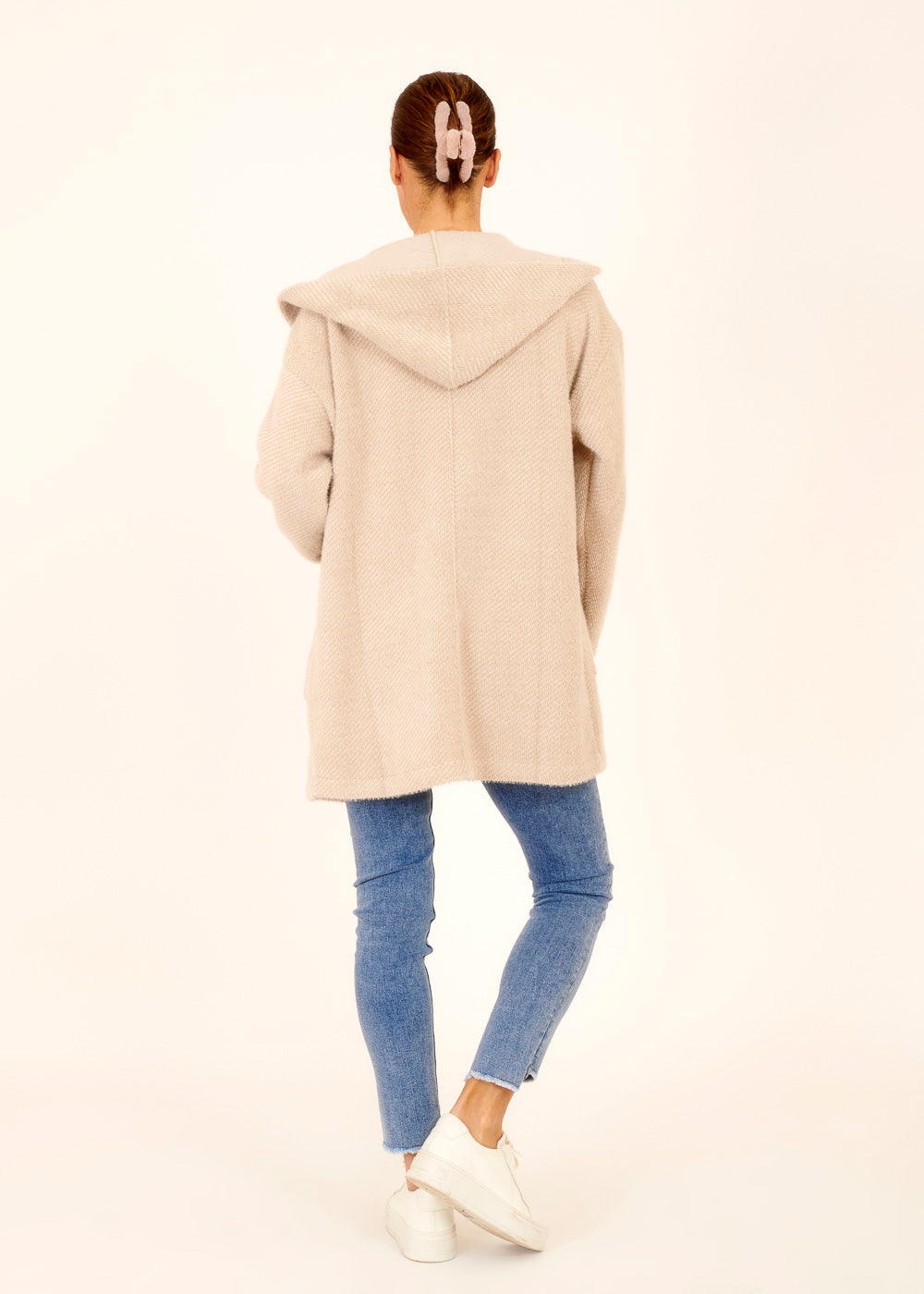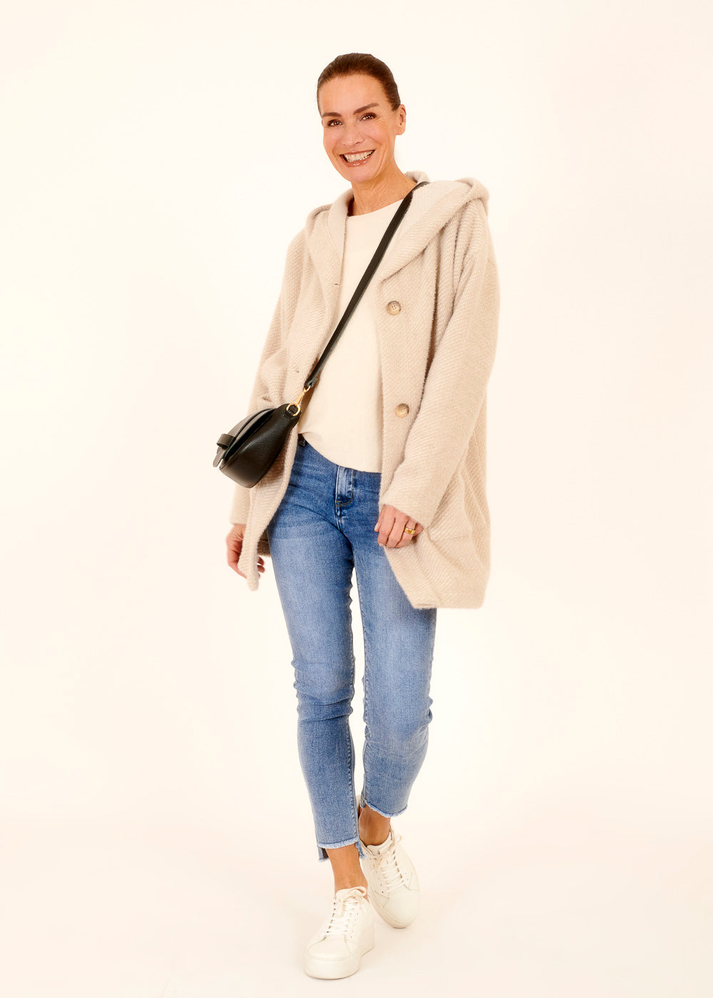 Der lange Schnitt verleiht der Strickjacke eine moderne Silhouette, während die dezente Farbe Beige sie zu deinem vielseitigen Begleiter für unterschiedliche Anlässe macht. Die Kapuze gibt nicht nur einen zusätzlichen Hauch von Lässigkeit, sondern bietet auch Schutz an kühleren Tagen. Die Knöpfe und Taschen vervollständigen das Design und verleihen der Jacke eine funktionale Note.