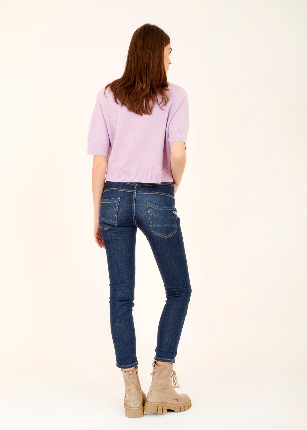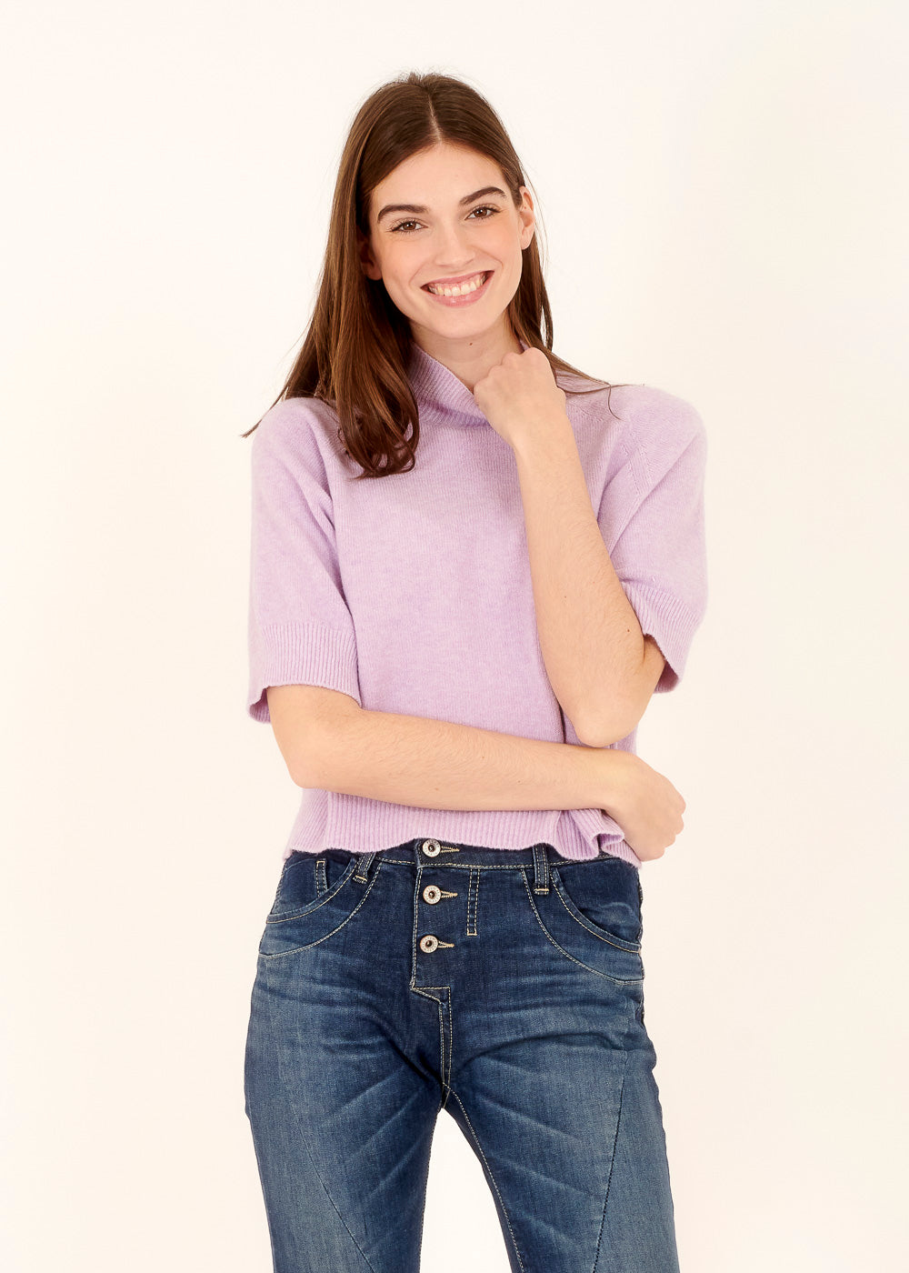 Kurz geschnittener Pullover mit kurzen Armen. Rippenbündchen an den Ärmeln und am Saum. Durch seine Länge eignet er sich besonders gut für höher geschnittenen Jeans. Wir haben auch die passende Strickjacke in unserem Shop.