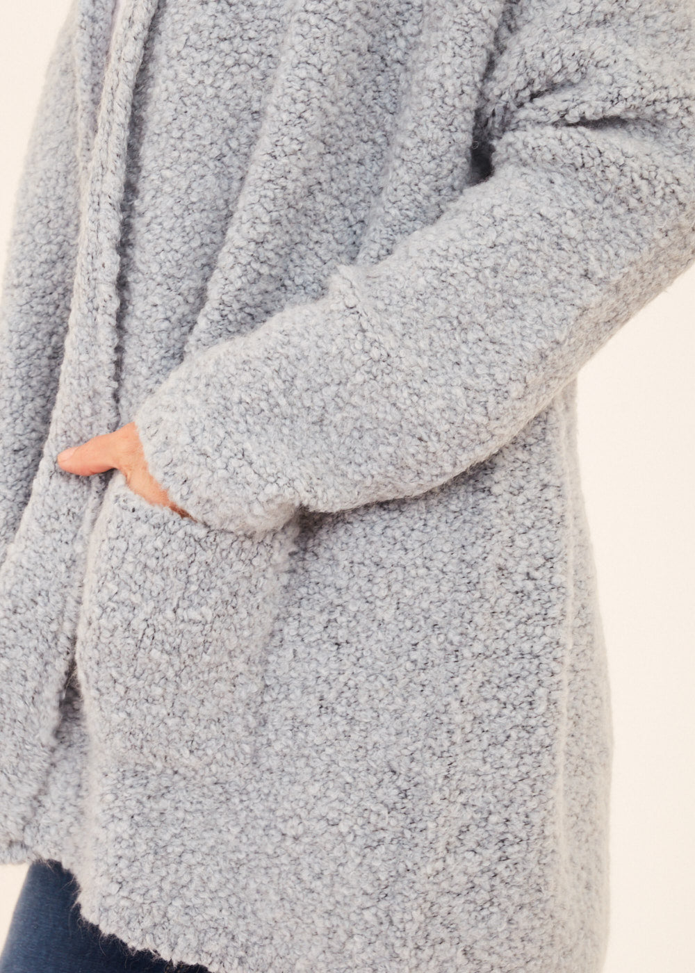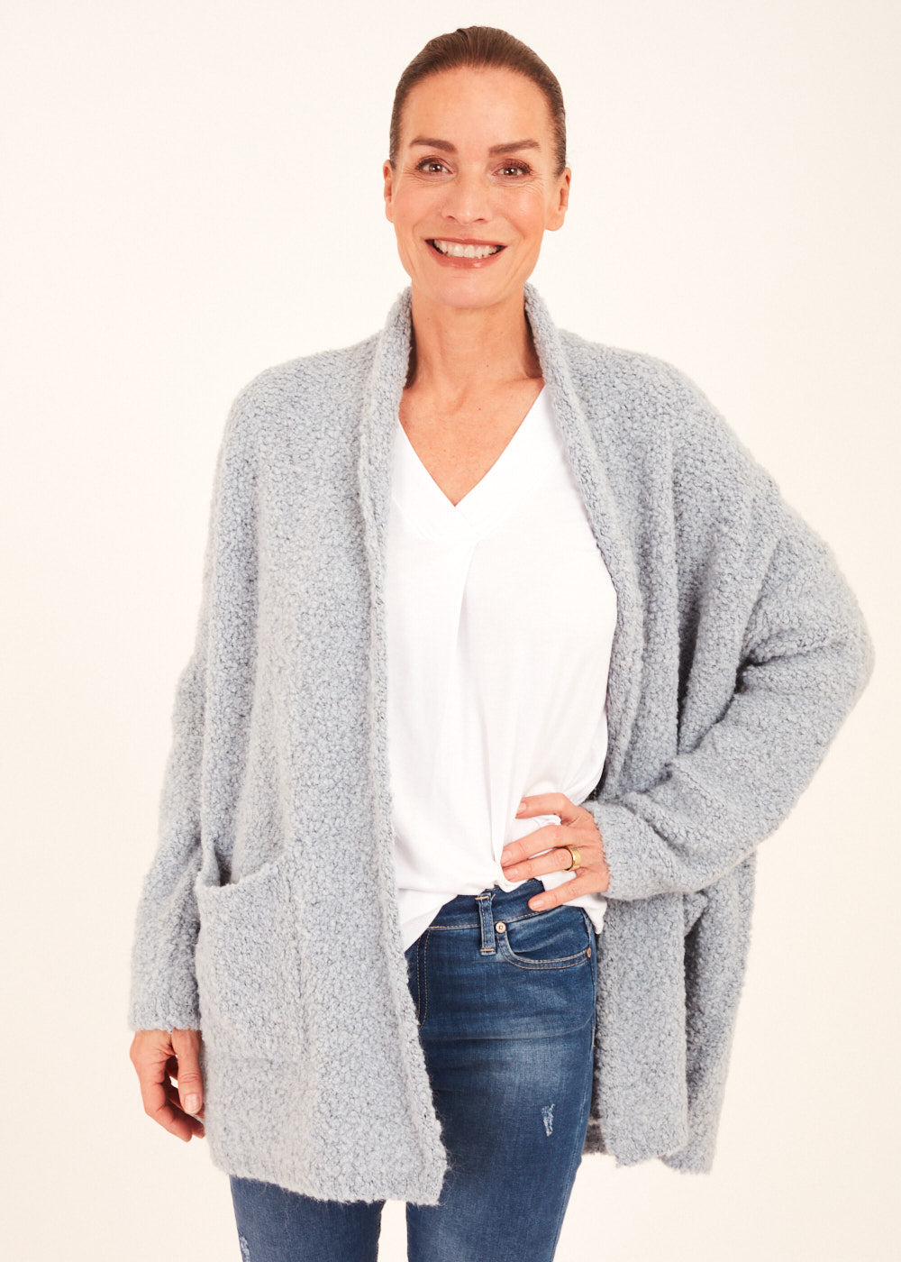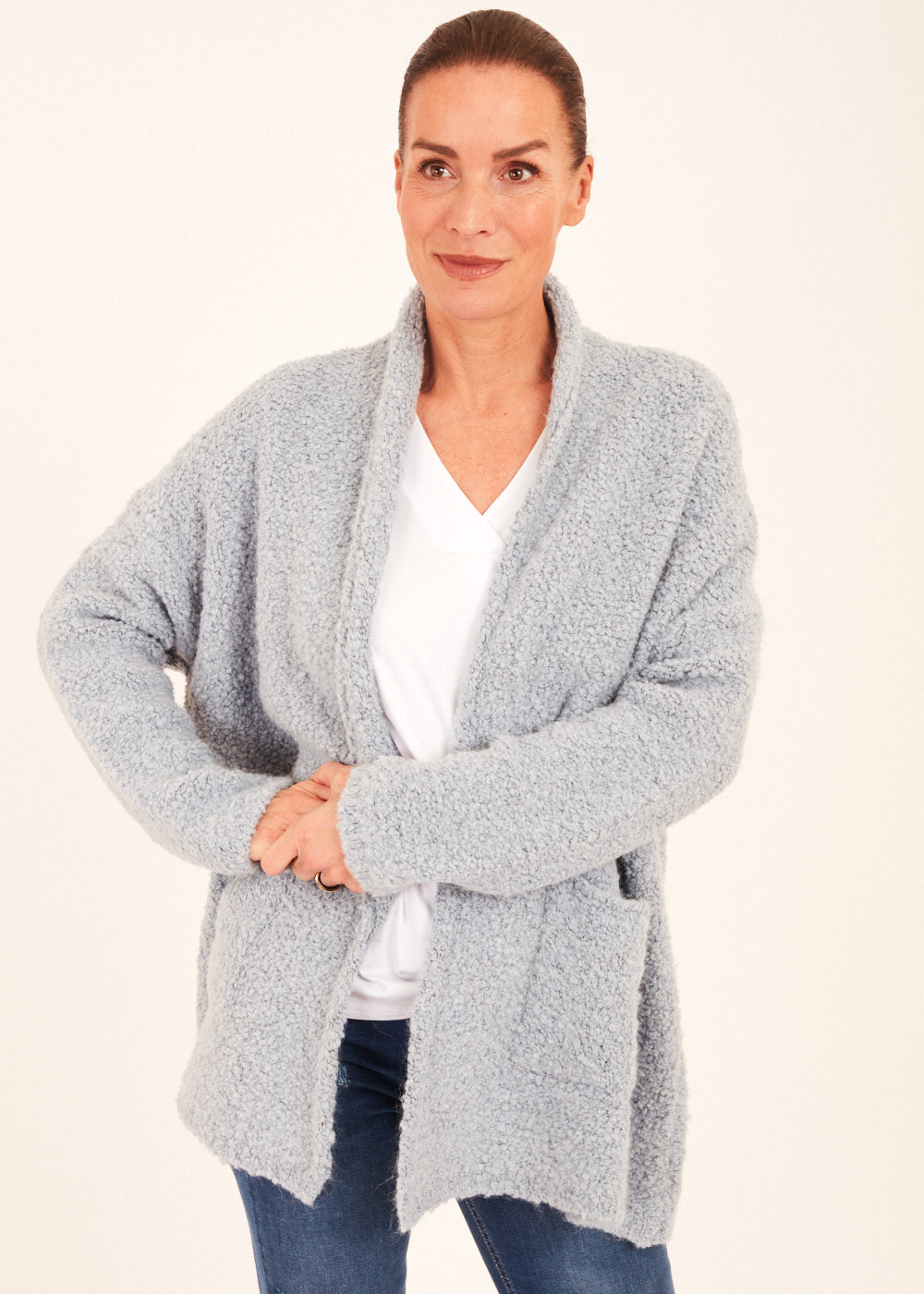 Verleihen Sie Ihrem Stil eine markante Note mit unserem Bouclé Cardigan in zartem Hellblau – ein Must-Have für jede modebewusste Frau.