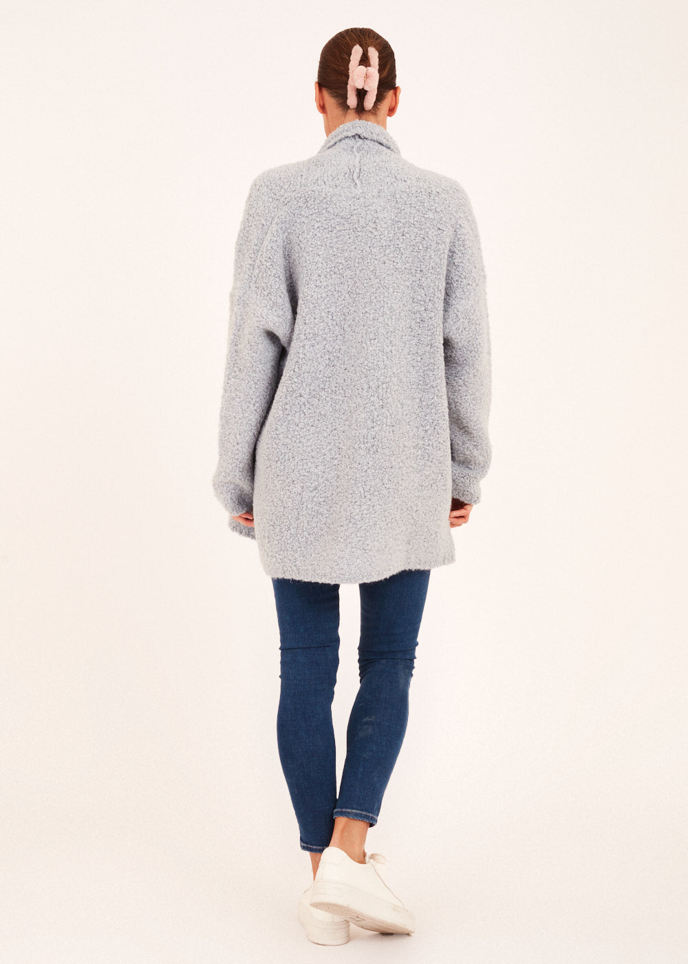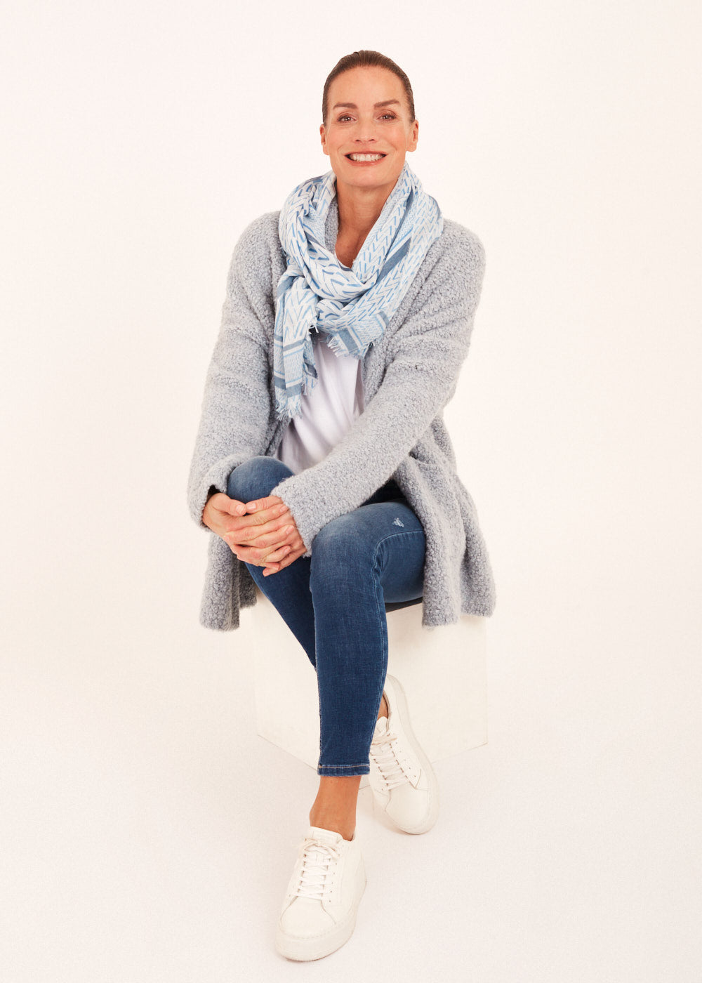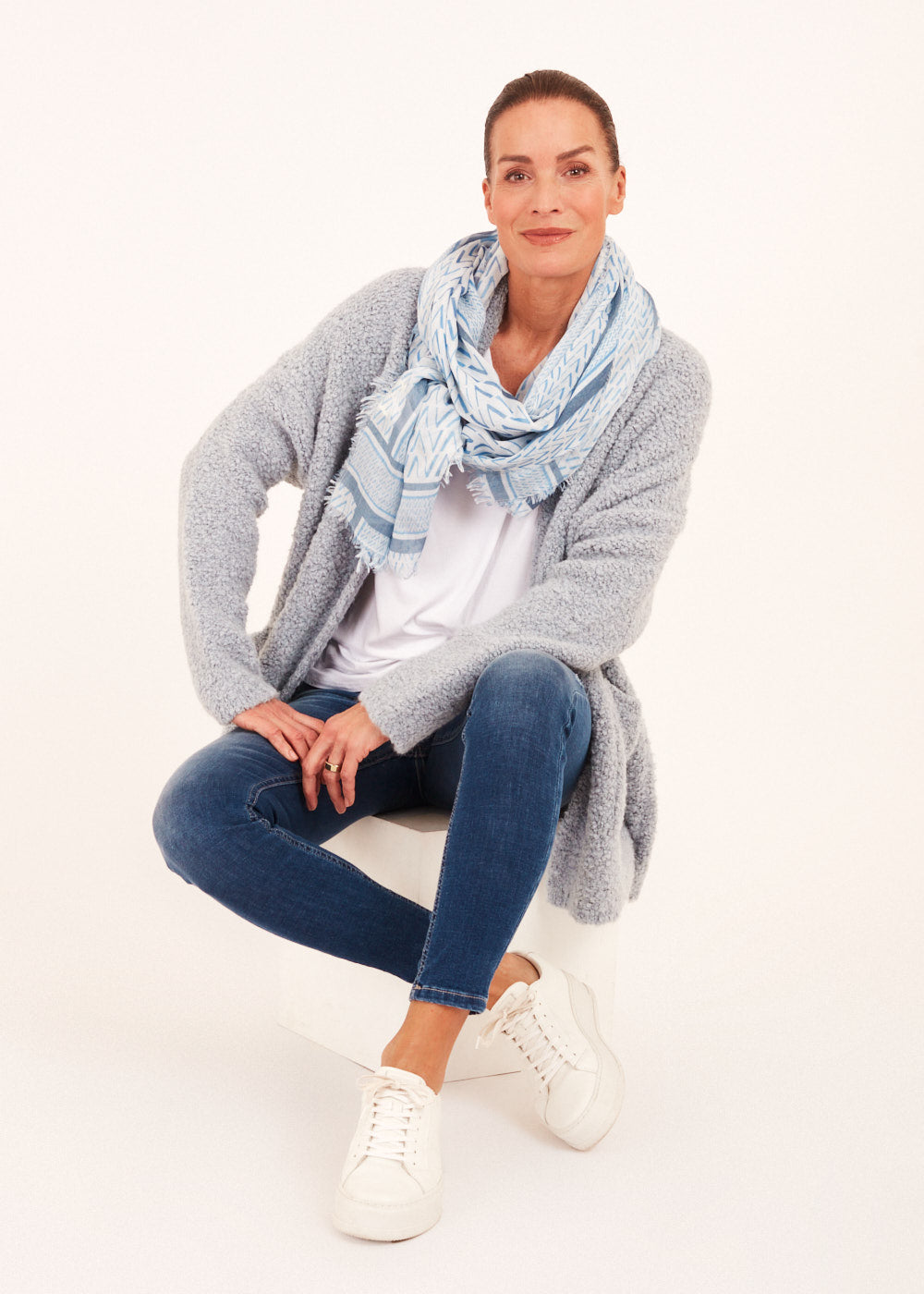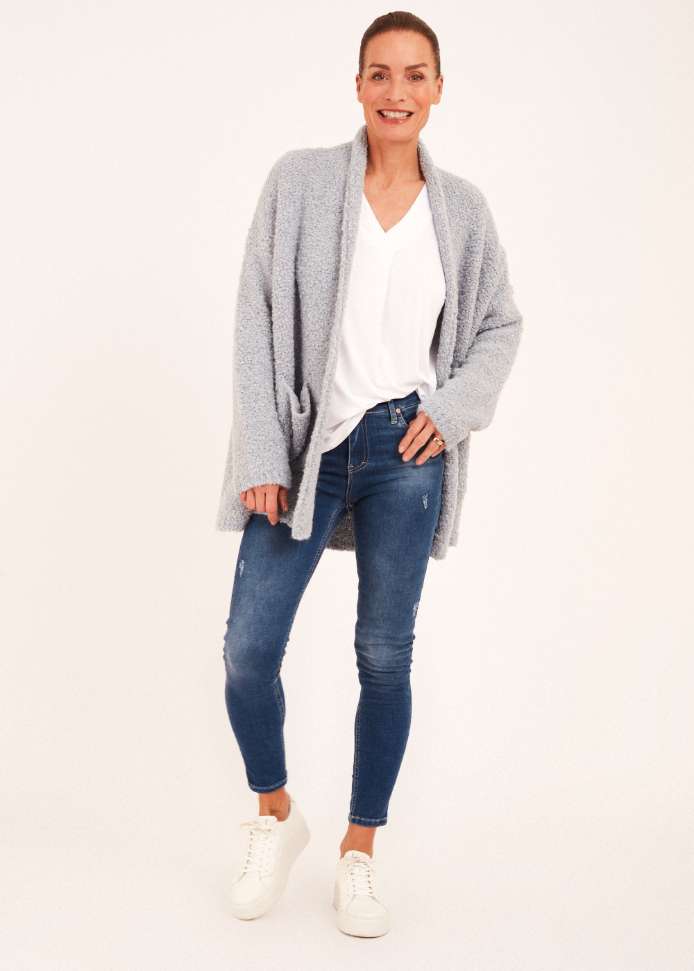 Verleihen Sie Ihrem Stil eine markante Note mit unserem Bouclé Cardigan in zartem Hellblau – ein Must-Have für jede modebewusste Frau.