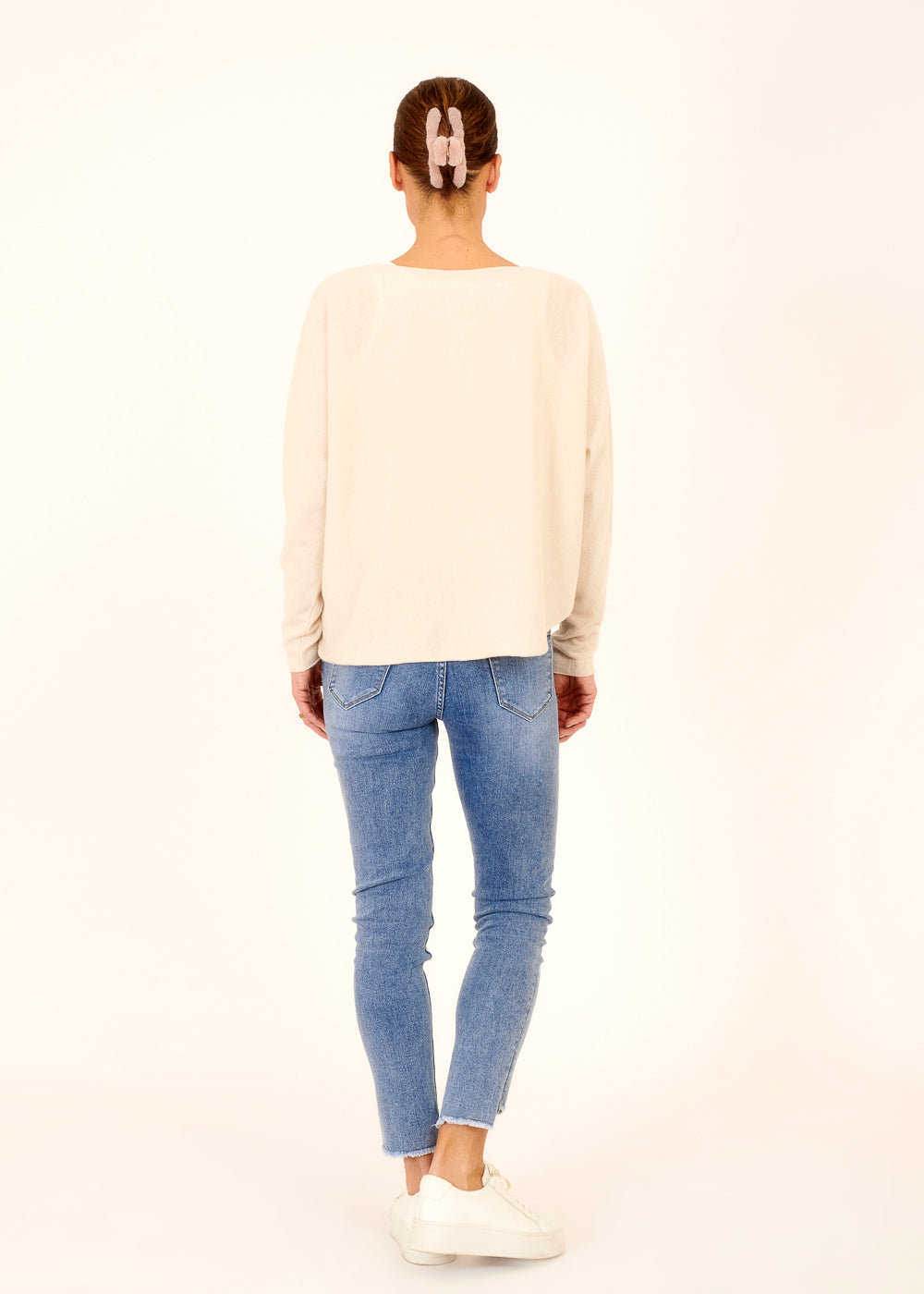 Erfahre zeitgemäße Eleganz mit unserem asymmetrisch geschnittenen beigen Pullover aus hochwertigem Mischgewebe. Der moderne Schnitt verleiht Ihrem Look eine edle Note, während die dezente Farbe Beige Vielseitigkeit und Stil miteinander verbindet.