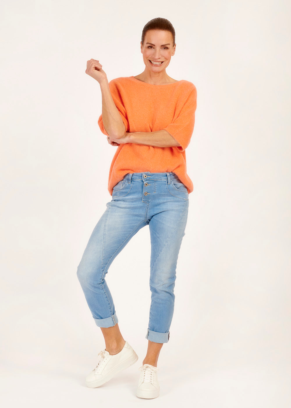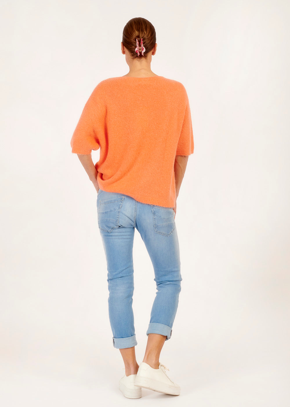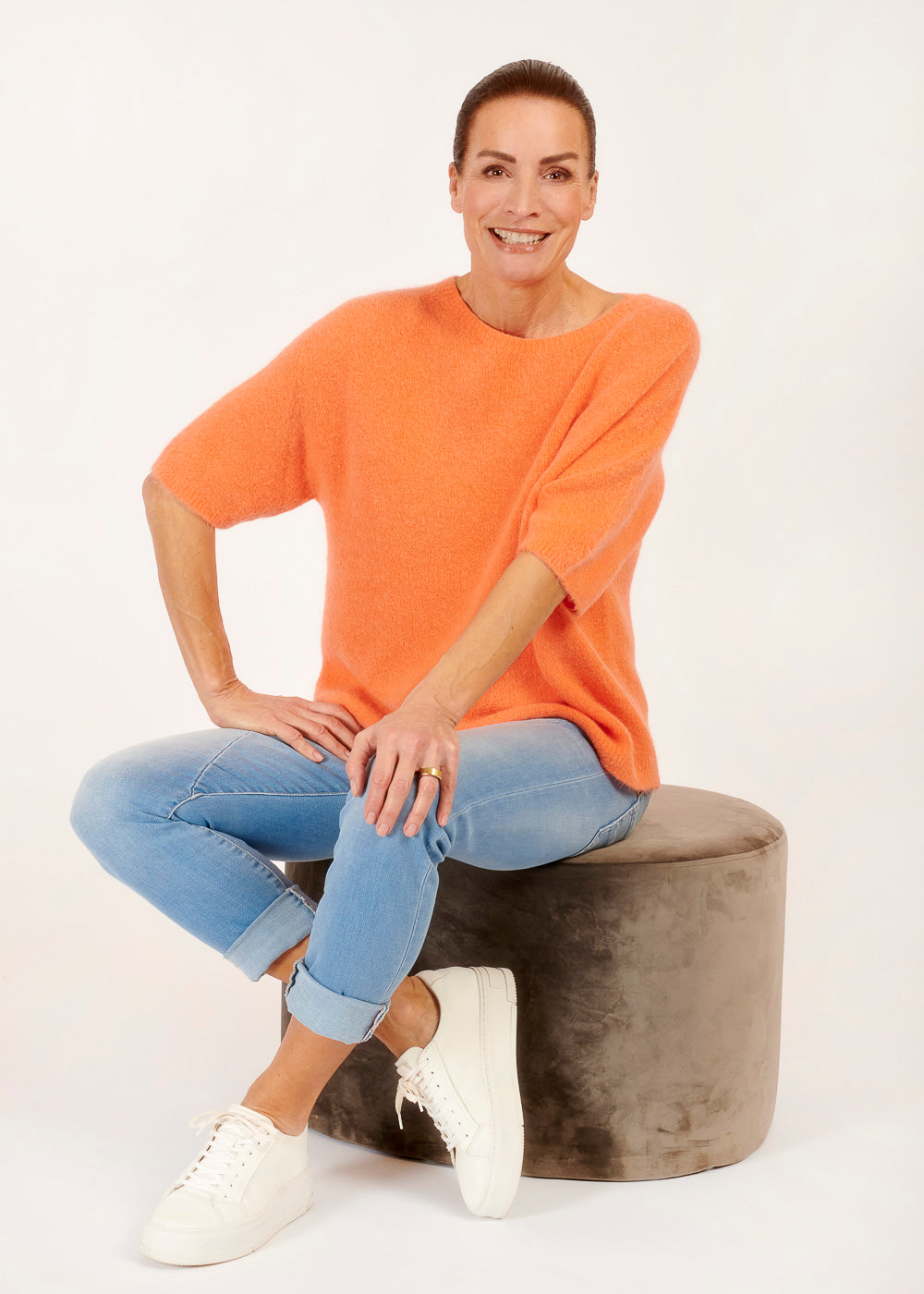 Erwecke deinen Look zum Leben mit unserem Halbarm-Pullover in leuchtendem Orange! Dieses unverzichtbare Kleidungsstück verleiht deinem Outfit eine frische und lebendige Note.