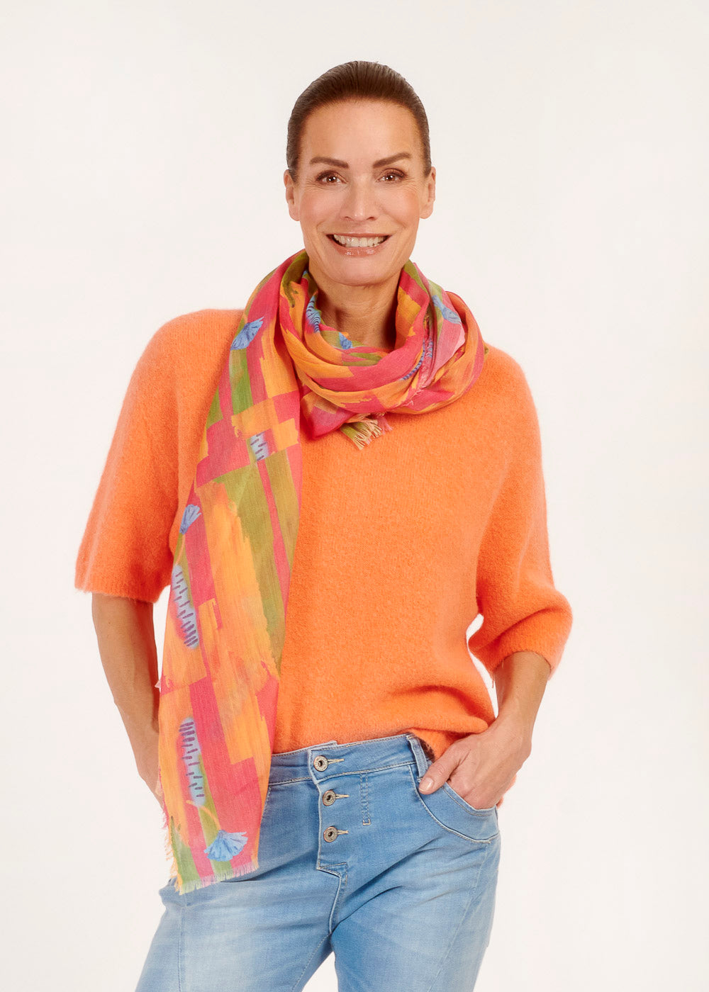 Natürlich! Hier ist der Produkttext für den Schal mit Druck in Orange mit Pink:
