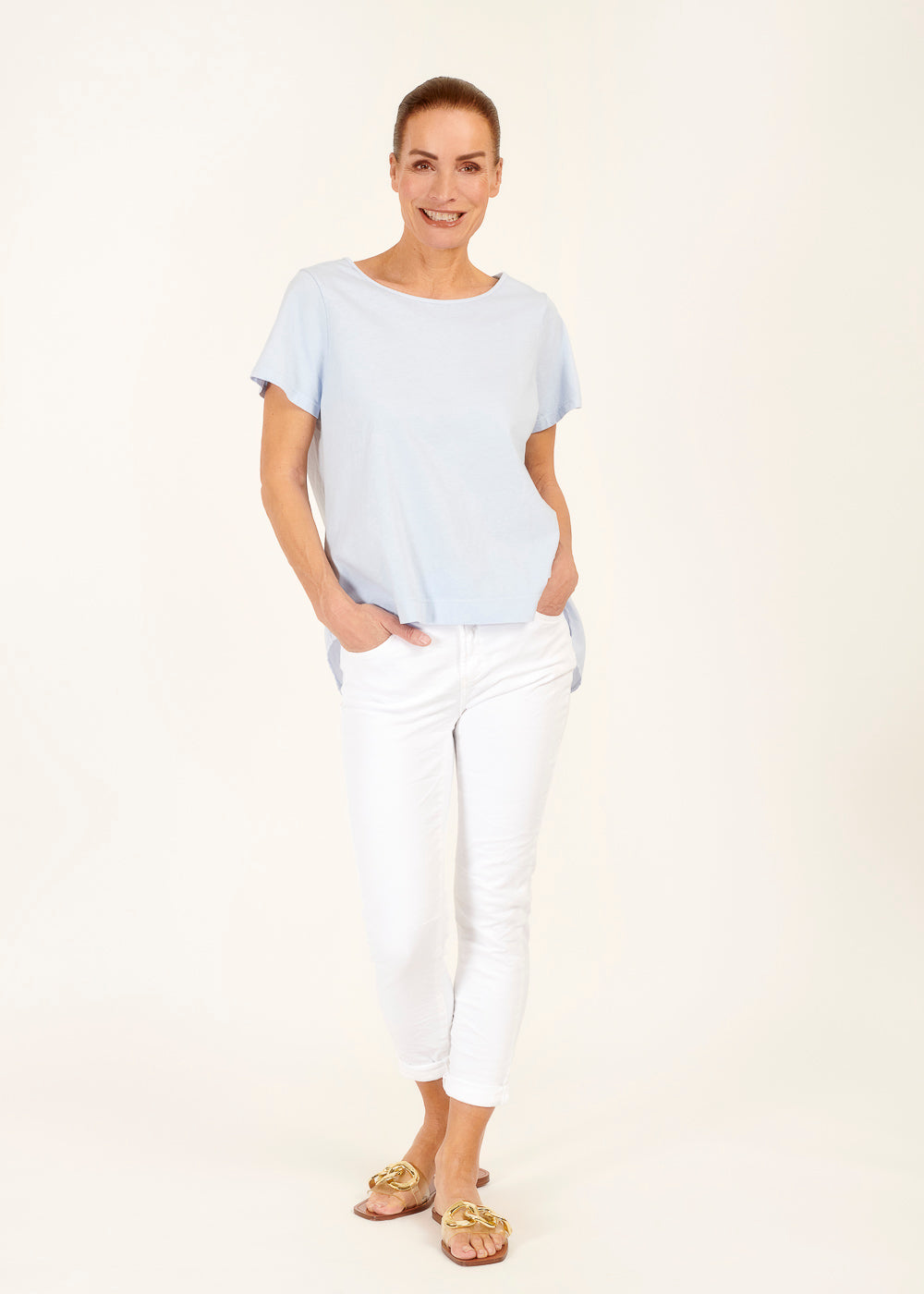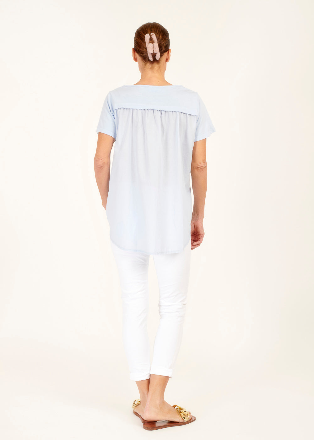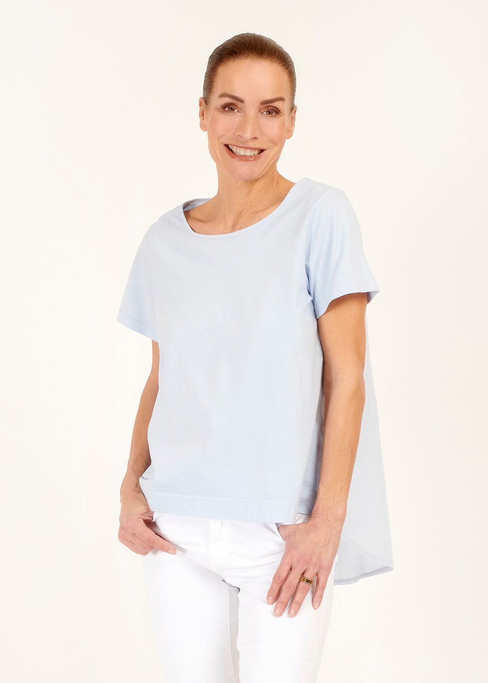 Ein Shirt, das deinen Look auf ein neues Level hebt: Unser Materialmix-Shirt in strahlendem Argento mit rundem Halsausschnitt und raffinierten Details auf der Rückseite.