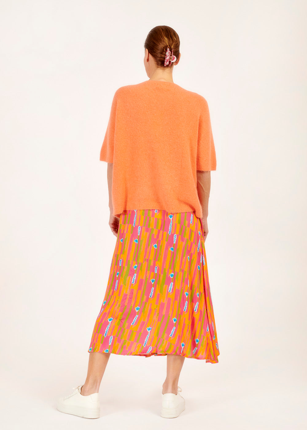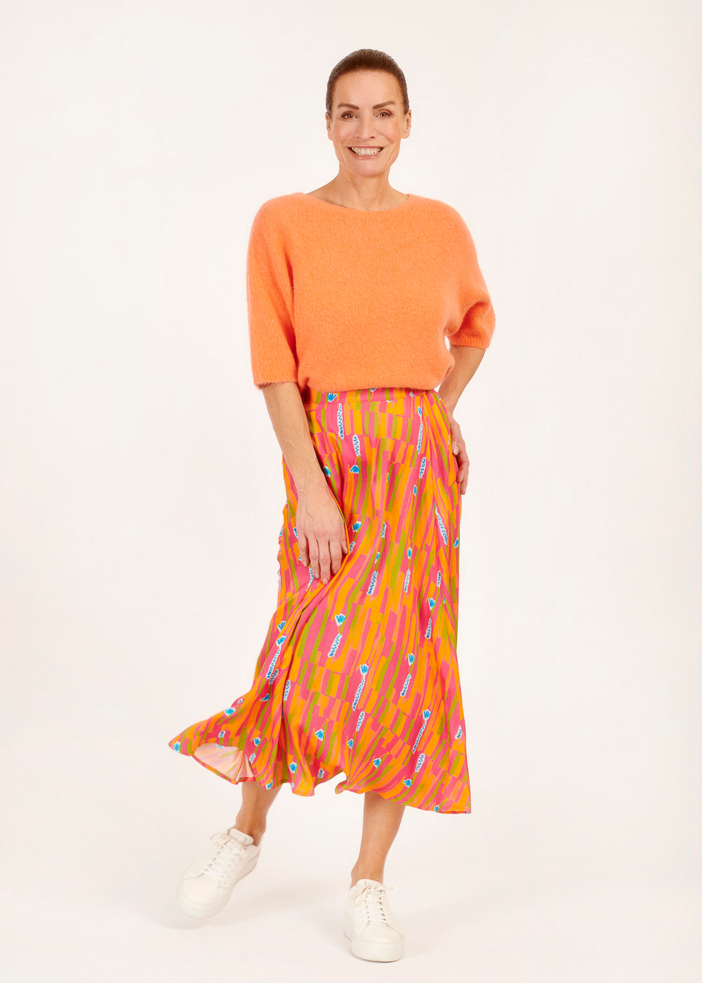 Tauche ein in eine Welt voller Farbe und Muster mit unserem faszinierenden Maxirock. Das lebendige Orange verleihen diesem Stück eine unvergleichliche Ausstrahlung, die sofort ins Auge fällt und für gute Laune sorgt.