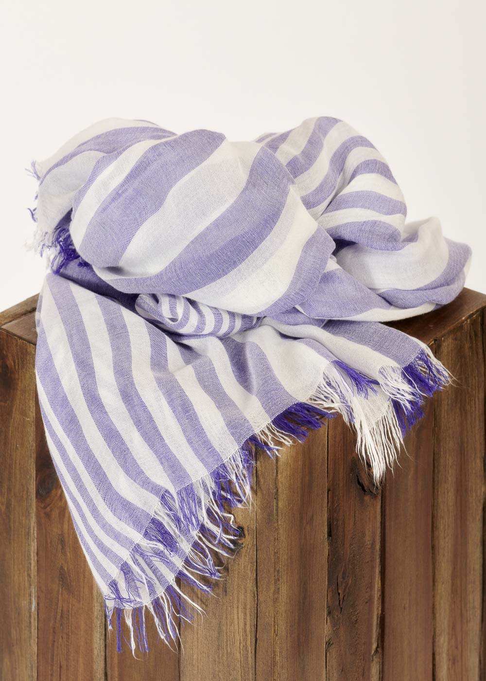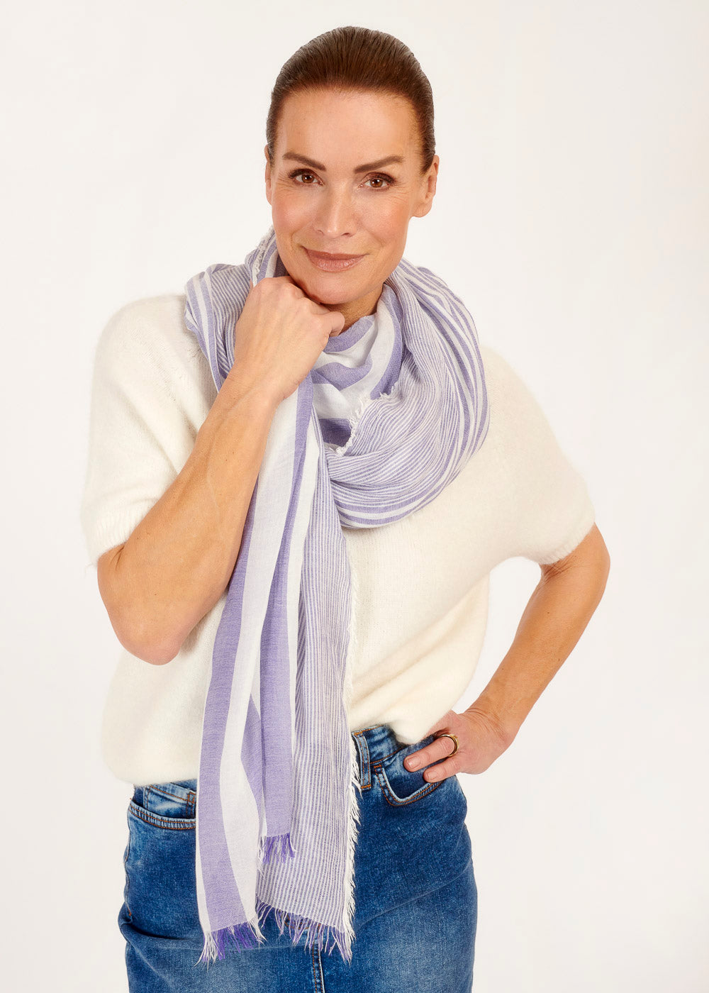 Möchtest du deinem Outfit eine frische Note verleihen? Dann ist dieses lila Tuch in Streifenoptik genau das Richtige für dich! Mit seinem lebendigen Farbspiel und seinem zeitlosen Design ist dieses Tuch das perfekte Accessoire, um deinen Look aufzupeppen.