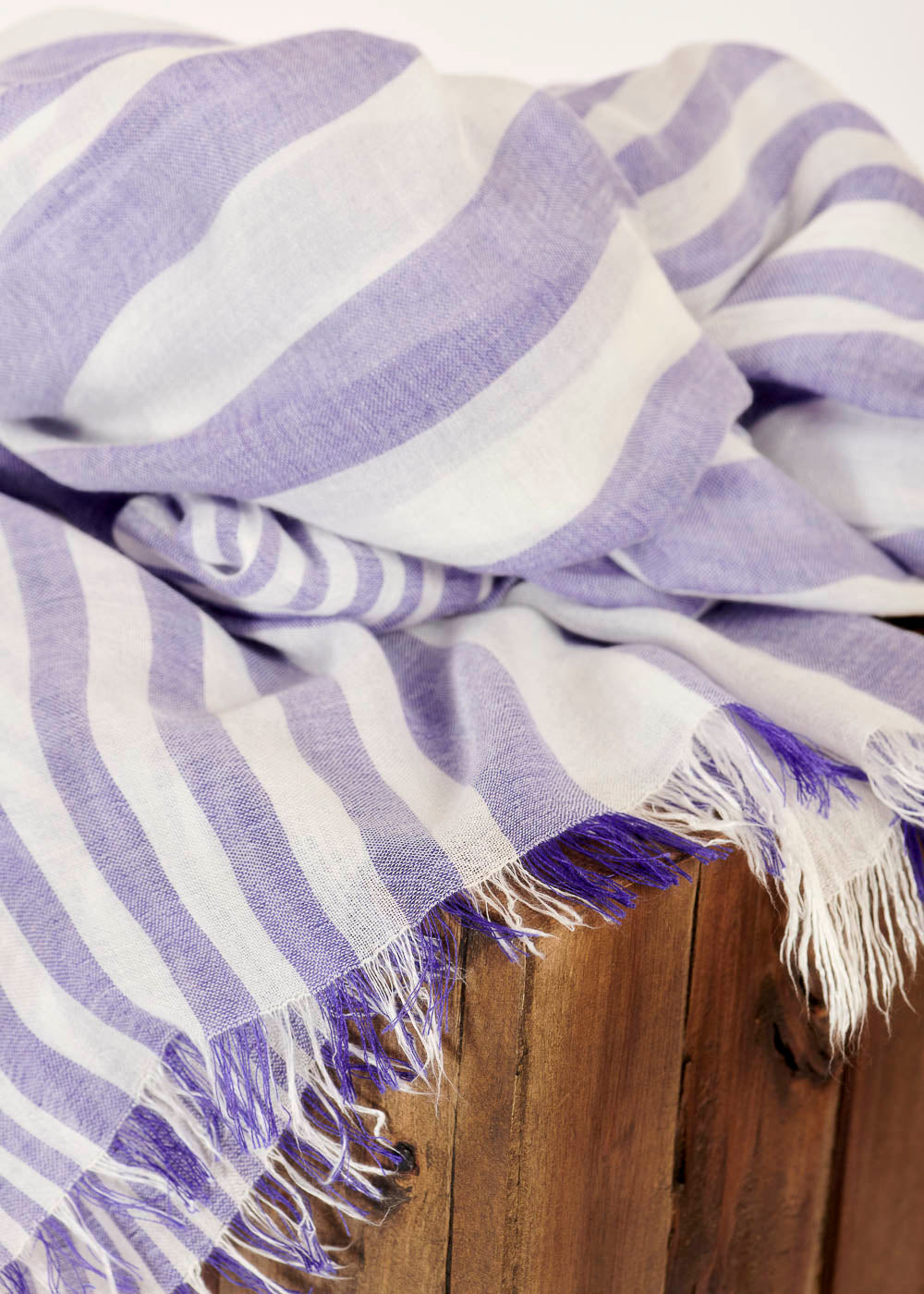Das Tuch besteht aus hochwertigem Material, das nicht nur weich und angenehm zu tragen ist, sondern auch eine schöne Textur bietet. Die lila Farbe verleiht ihm eine lebendige Ausstrahlung, während die Streifenoptik ihm einen modernen Touch verleiht.