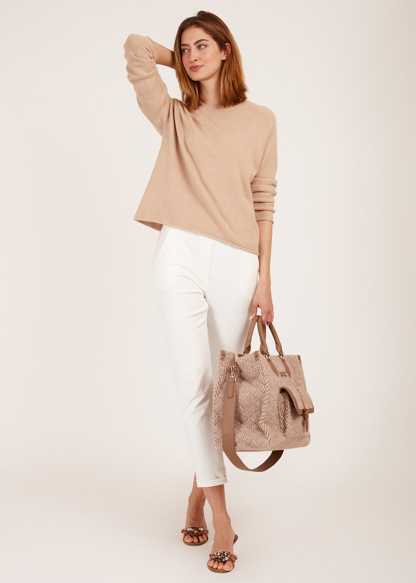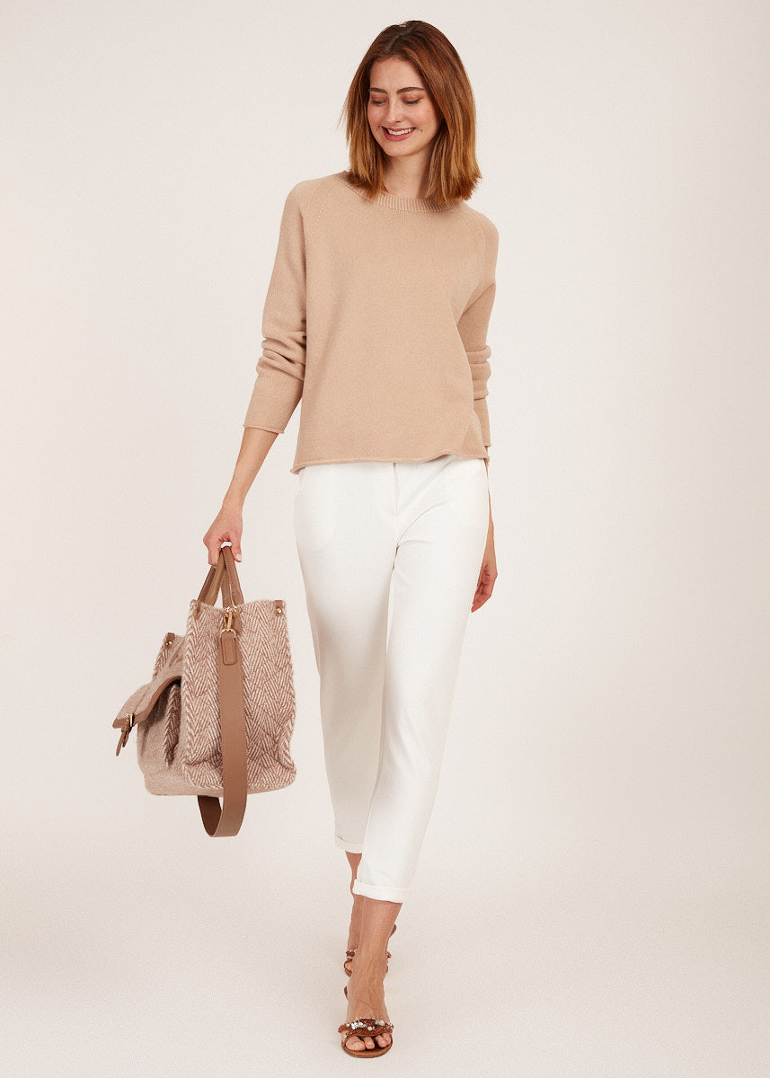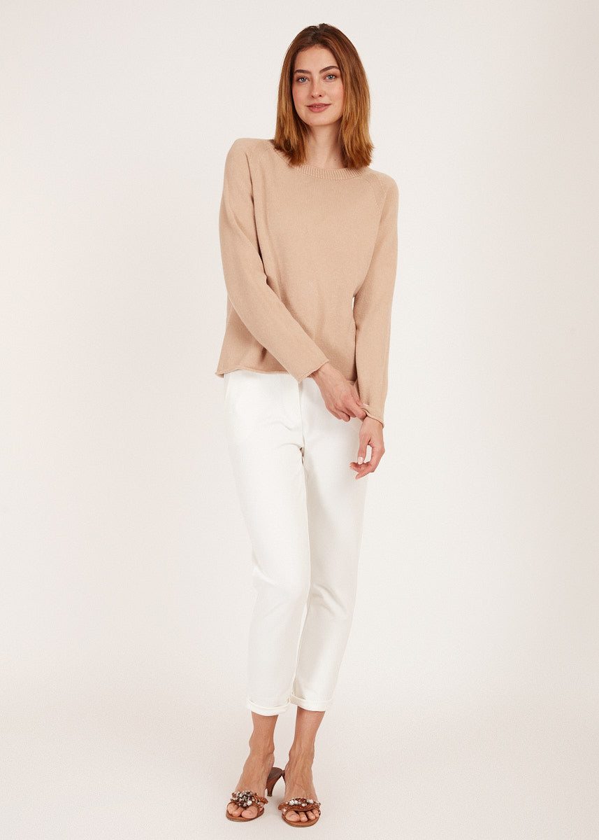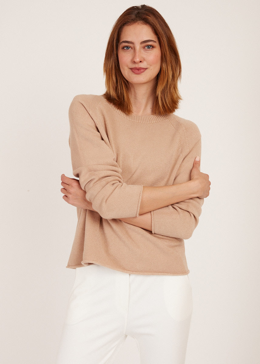 Die sanfte Sandfarbe verleiht diesem Pullover eine dezente Eleganz und macht ihn zu einem vielseitigen Teil deiner Garderobe. Die Rollkante an Ausschnitt, Ärmeln und Saum verleiht ihm einen lässigen und dennoch raffinierten Look, der perfekt für jede Gelegenheit ist.
