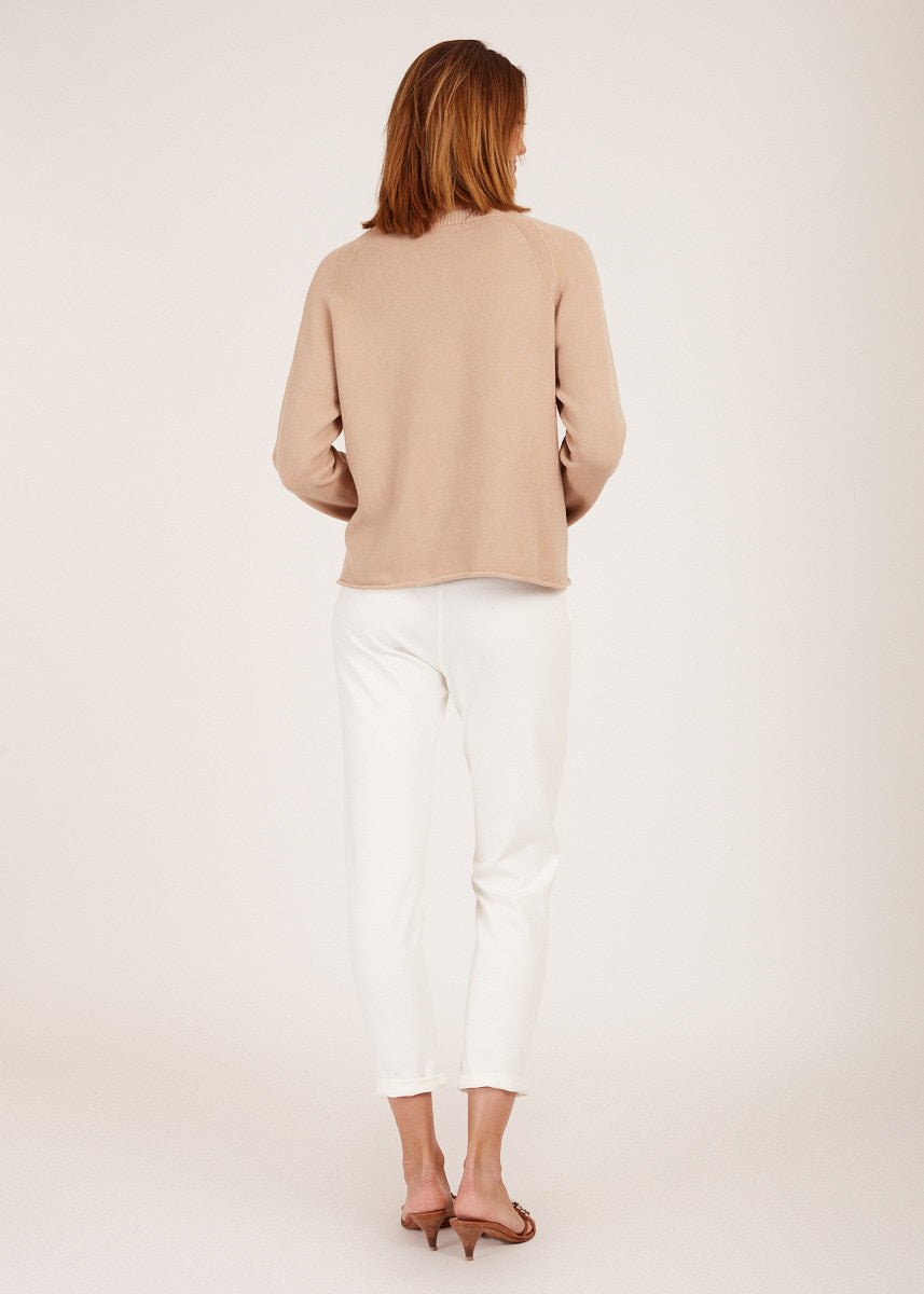 Entdecke unseren Pullover mit Rollkante in Sand - ein zeitloses Kleidungsstück, das Eleganz und Komfort vereint und dir einen Hauch von Luxus für deine Garderobe bietet.