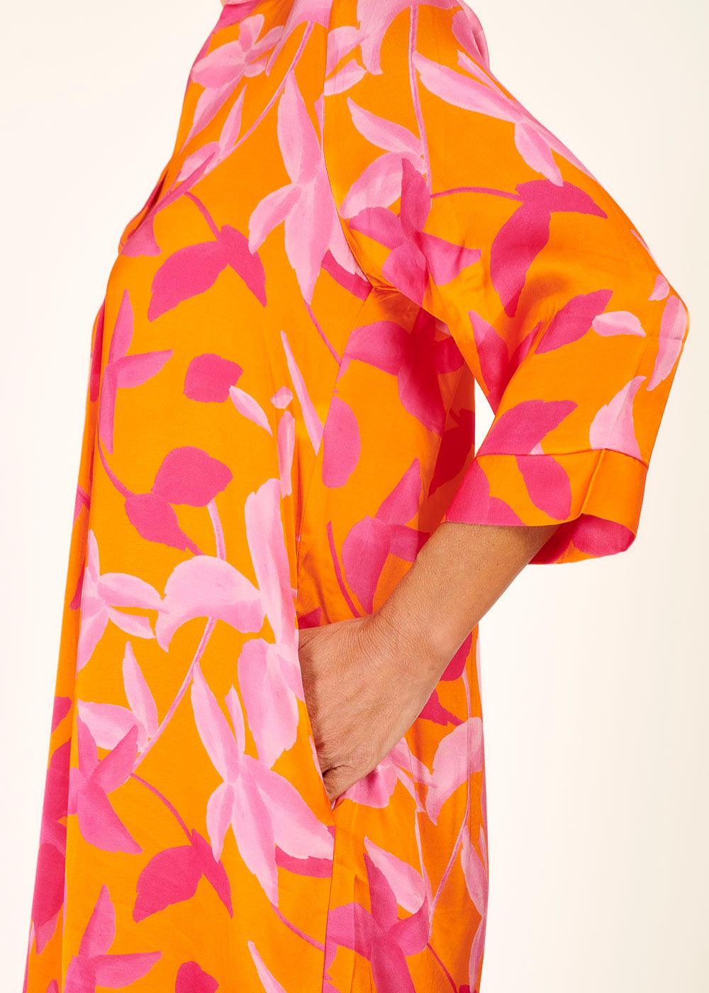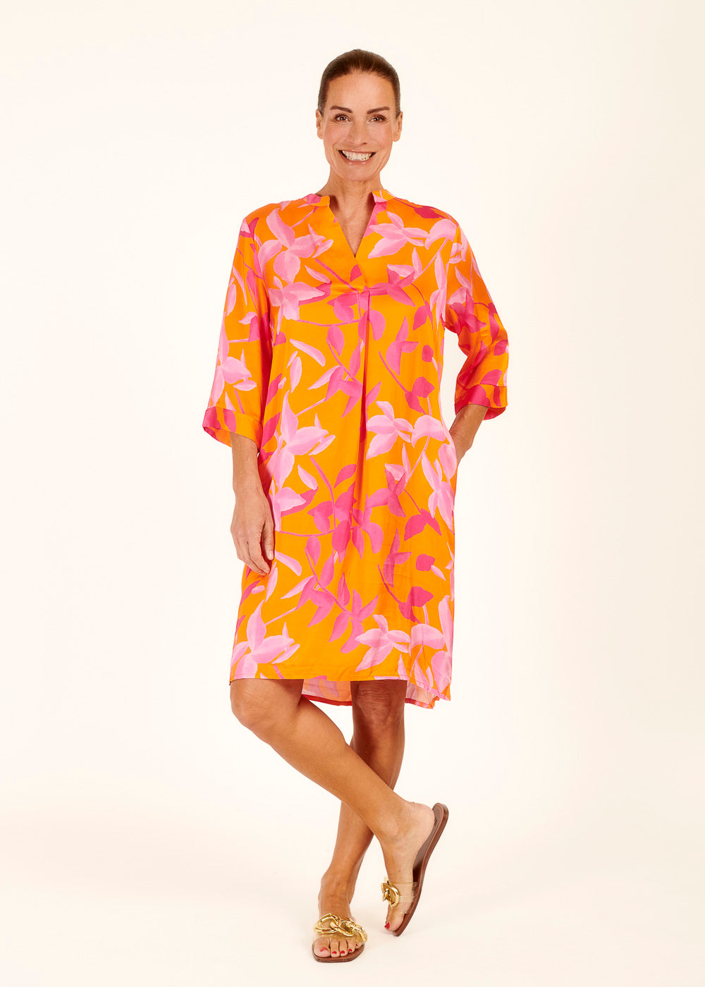 Mit seinem sanften Pfirsichton und den zarten rosa und creme Akzenten ist dieses Kleid eine perfekte Kombination aus Eleganz und Romantik. Der feminine Schnitt und das luftige Material sorgen für einen bequemen und schmeichelhaften Sitz, der deine Figur auf charmante Weise umspielt. Egal, ob du dich für einen Tag im Park oder eine Sommerhochzeit entscheidest, unser Kleid wird dich zum Blickfang machen!
