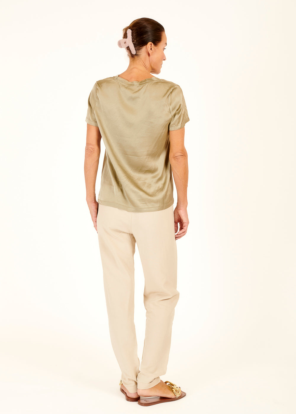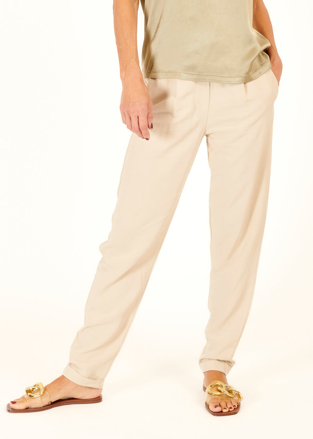Unsere lässige Hose in der Farbe Sand bietet Komfort und Stil für den täglichen Gebrauch. Das dezente Design und die neutrale Farbe machen sie vielseitig kombinierbar und zu einem zeitlosen Kleidungsstück für jede Gelegenheit.