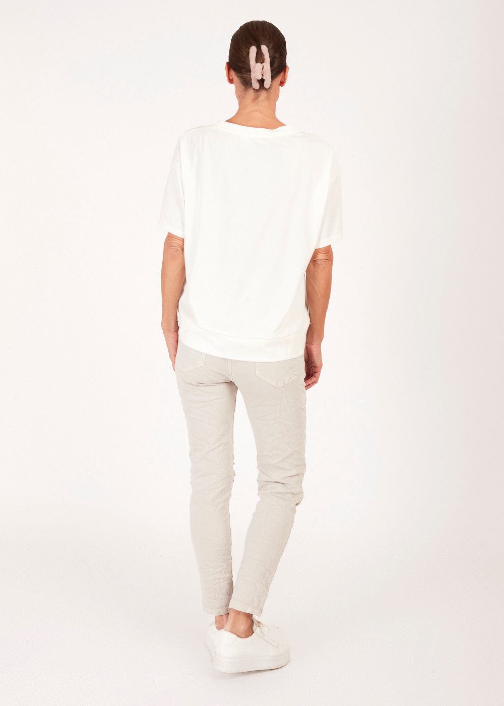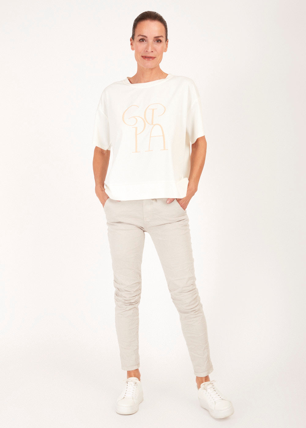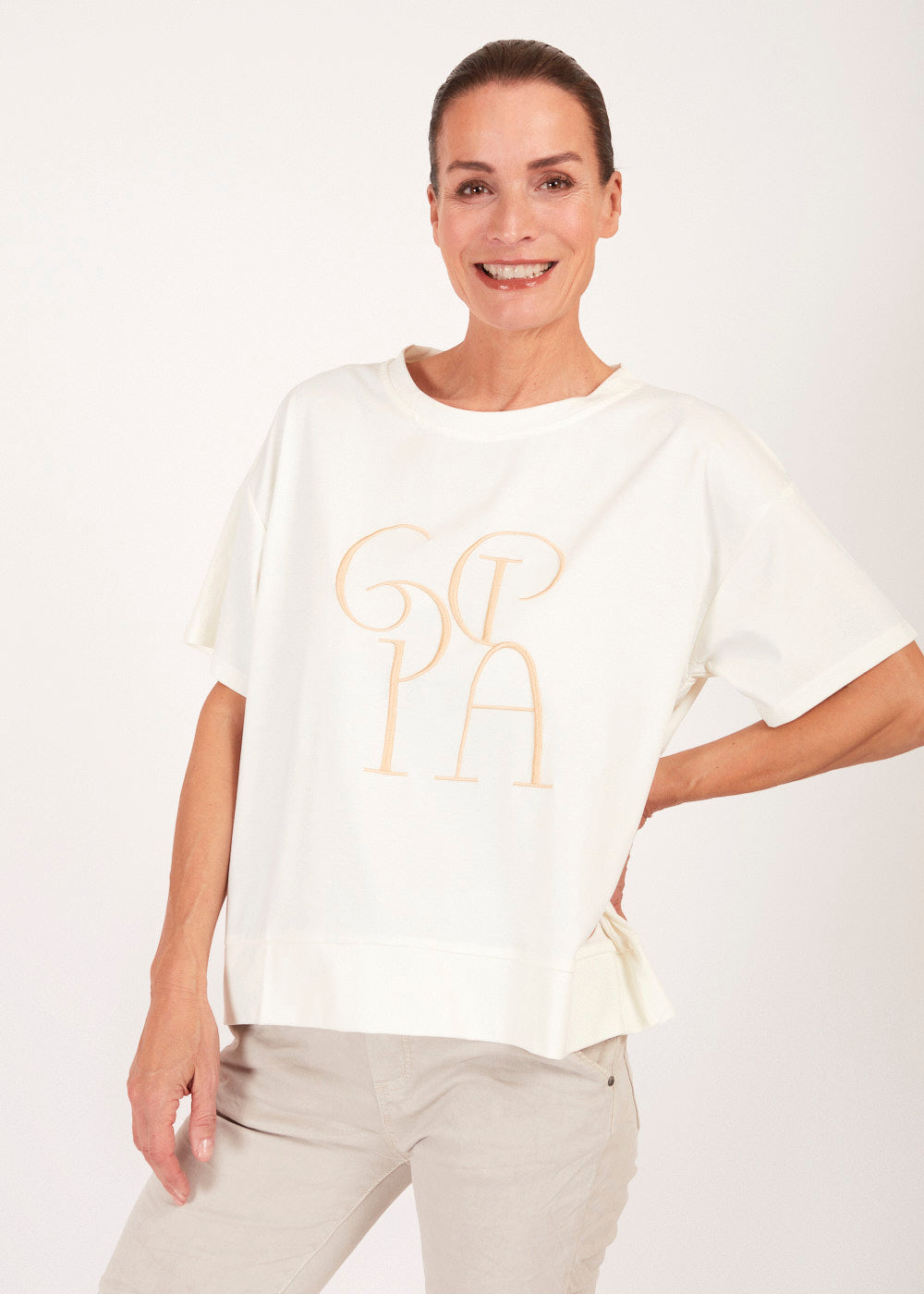 Entdecke unser Shirt mit der Stickerei "Gioia", was so viel wie "Freude" auf italienisch bedeutet. Perfekt für einen lässigen und dennoch stilvollen Look, der dich im Alltag oder bei besonderen Anlässen begleitet.
