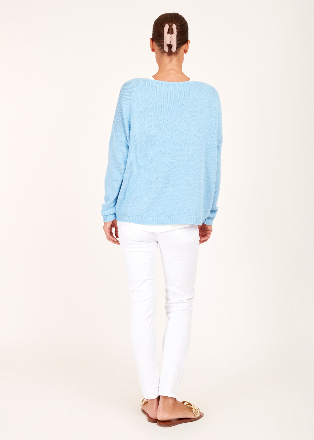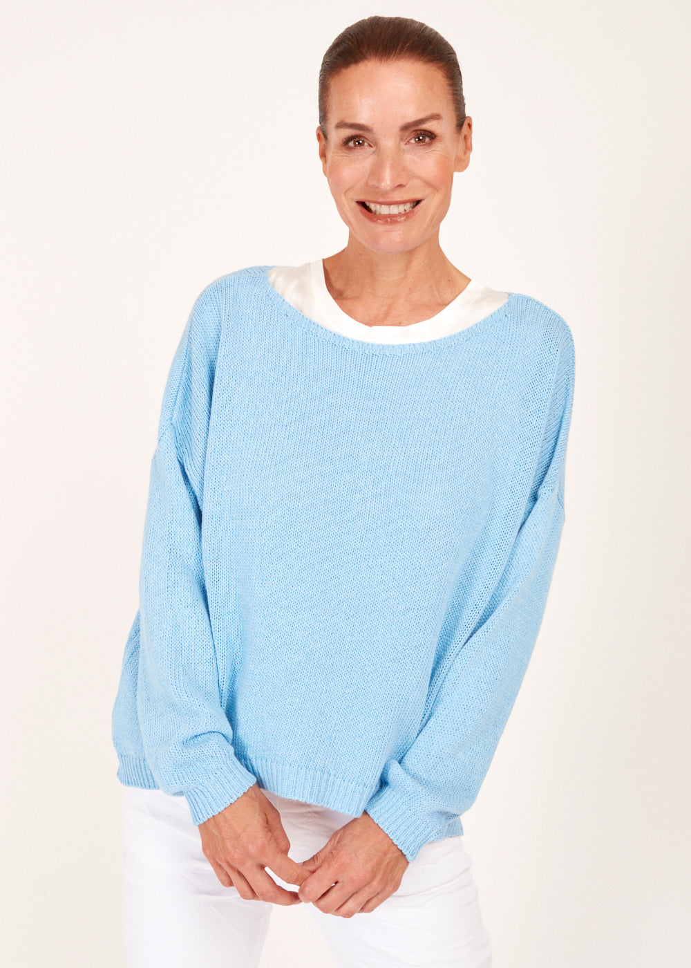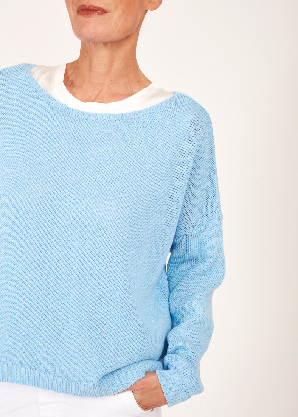 Erlebe den Komfort und die Eleganz des Rundsaum Pullovers in der Traumfarbe Celeste - ein absolutes Must-Have für alle, die Stil und Gemütlichkeit lieben."